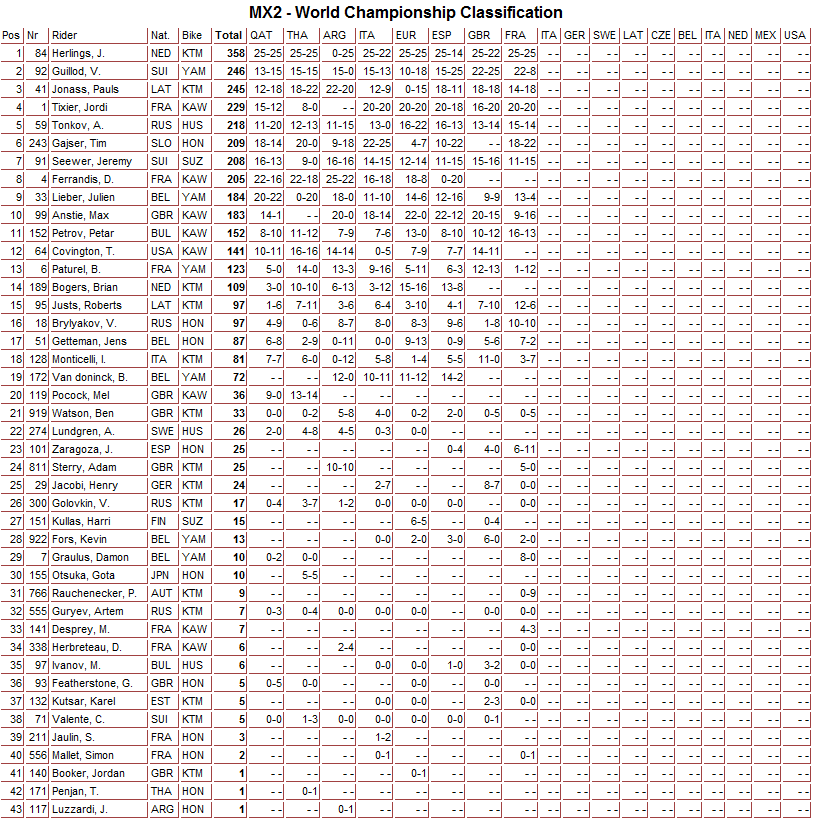 В классе МХ2 сильнейшим оказался голландец Джеффри Херлингс, который выиграл оба заезда.