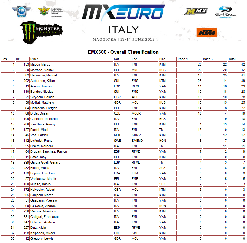 Второй заезд третьего этапа Чемпионата Европы в классе ЕМХ300 успели провести еще до сильного ливня, который превратил трек Маджора в месиво. Завершился заезд победой итальянца Марко Мадди, он же стал и победителем этапа.