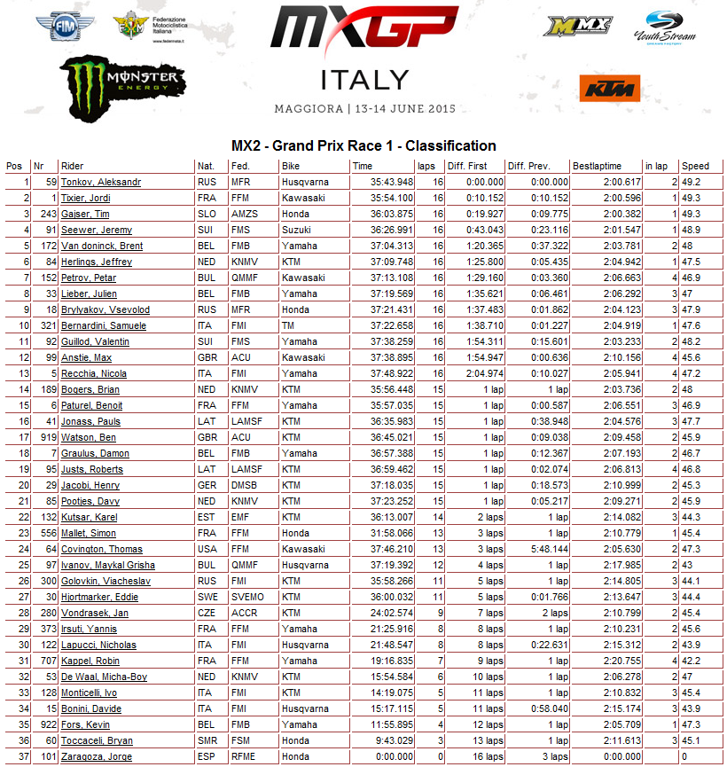 Александр Тонков - победитель первого заезда Гран-При Италии 14.06.2015 Роман Мишенев (_) Результаты первого заезда в классе МХ2. Отличная новость для российских болельщиков.... Россиянин Александр Тонков стал победителем первого заезда Гран-При Италии в классе МХ2. Всеволод Брыляков - девятый. Победитель квалификации голландец Джеффри Херлингс лишь на 6-м месте. . Комментарии Комментарии к этой статье запрещены.