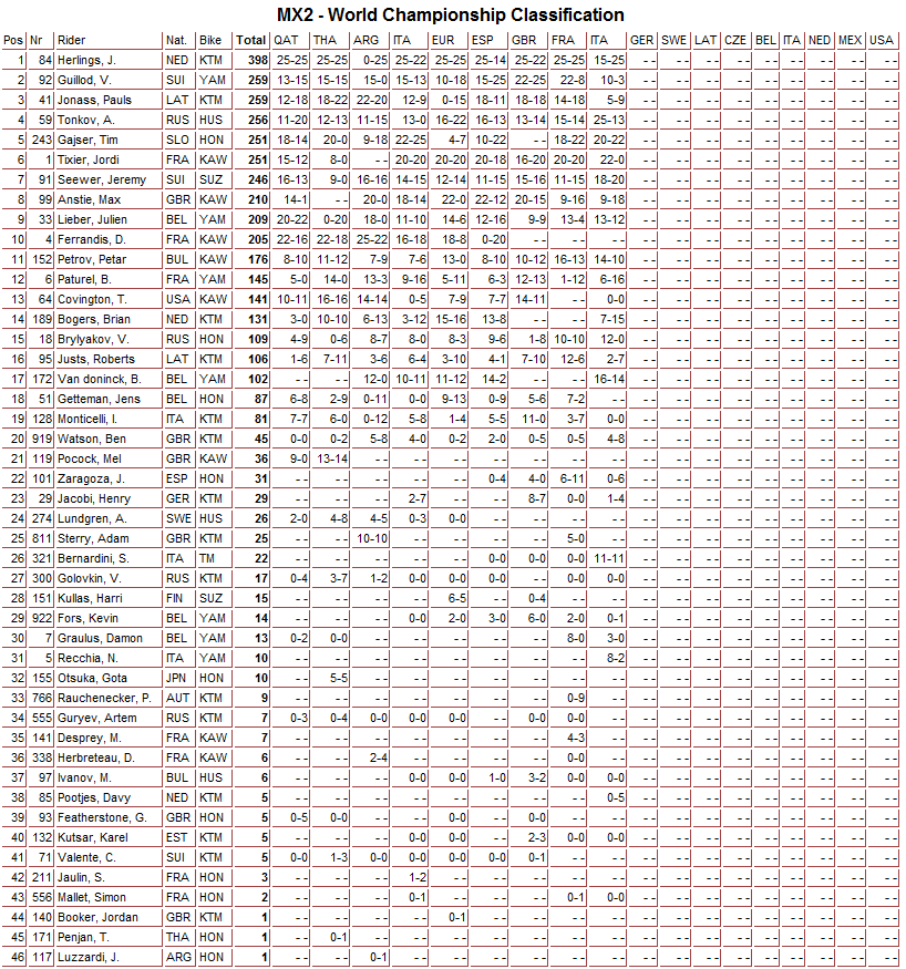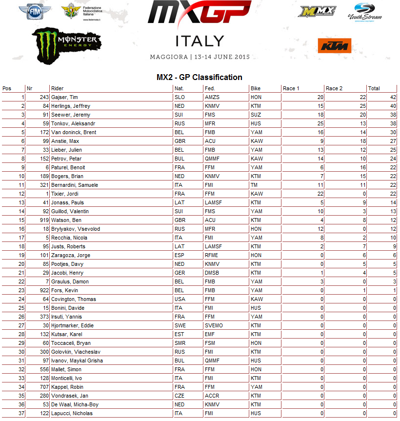 Воскресные заезды девятого этапа Чемпионата мира 2015 Гран-При Италии в классе МХ2 завершились победой Тима Гайсера из Словении, который занял третье и второе места.