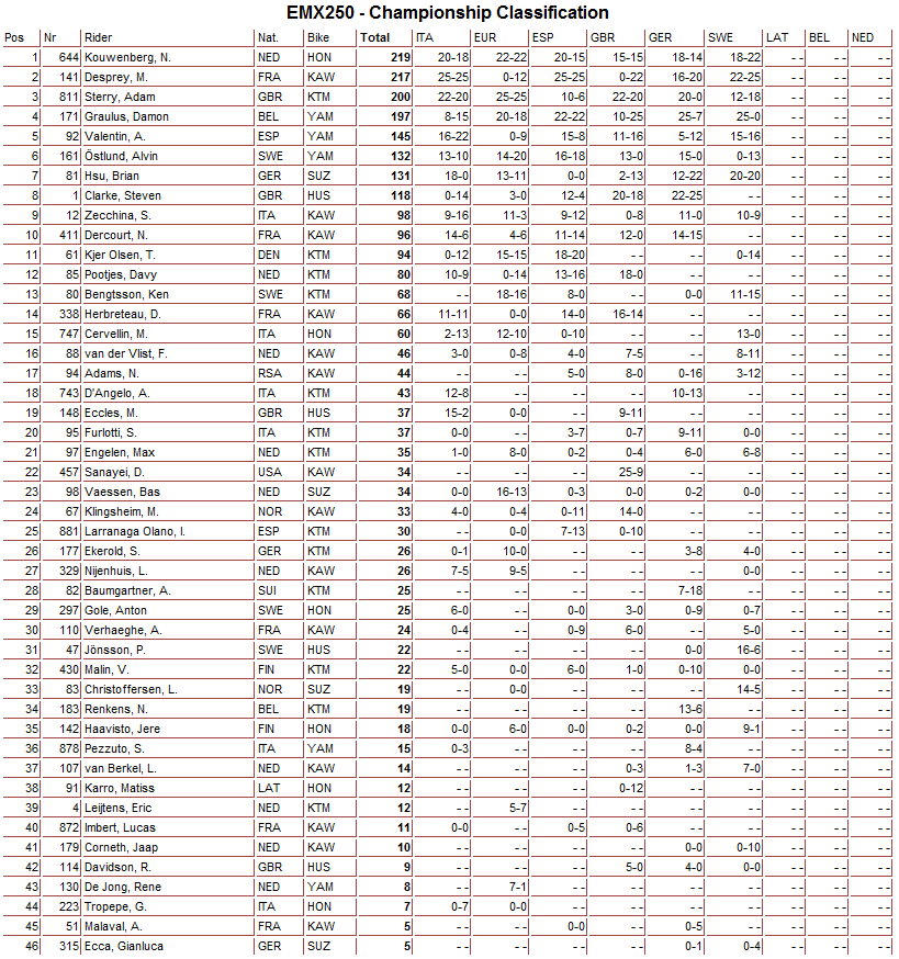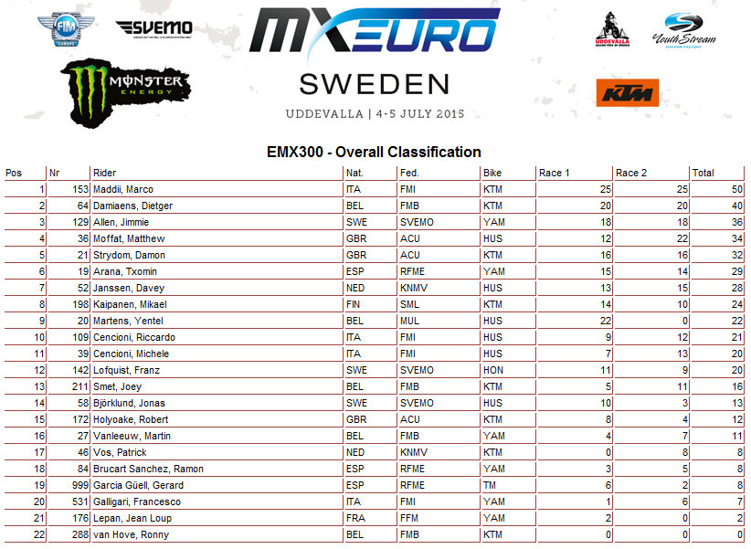 Результаты шестого и четвертого этапов Чемпионата Европы в классах ЕМХ250 и ЕМХ300.