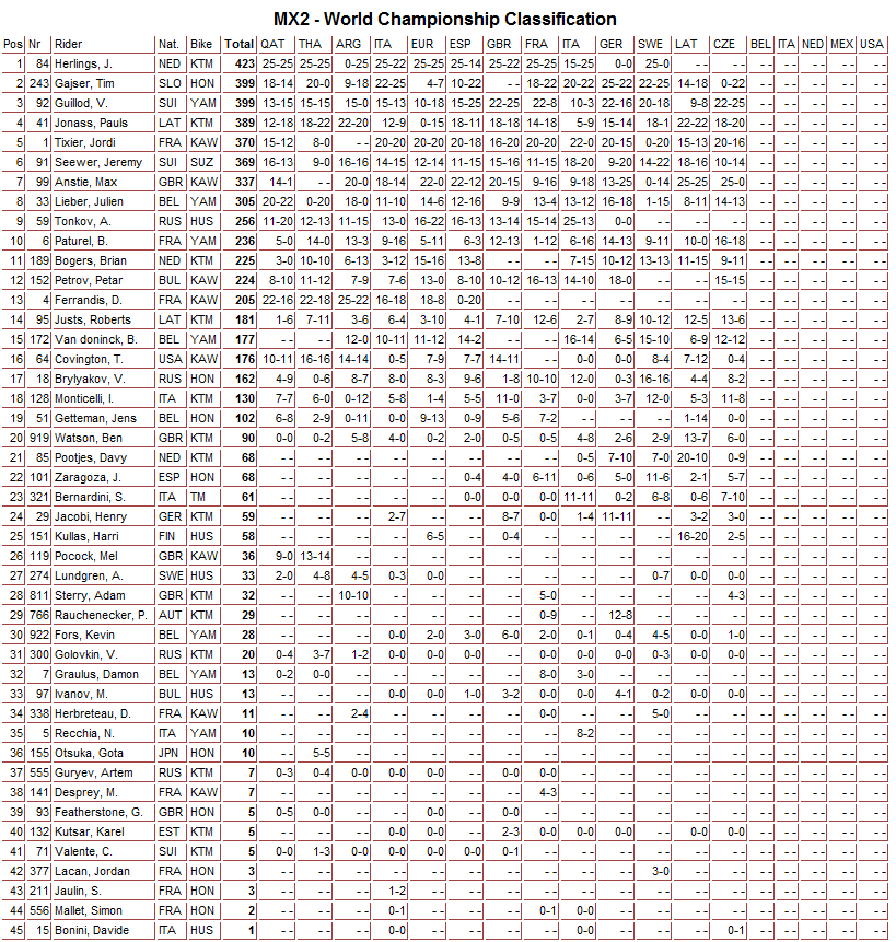В классе МХ2 победу одержал француз Валентин Гуиллод. Российские гонщики Всеволод Брыляков и Вячеслав Головкин заняли 16-е и 31-е места соответственно.