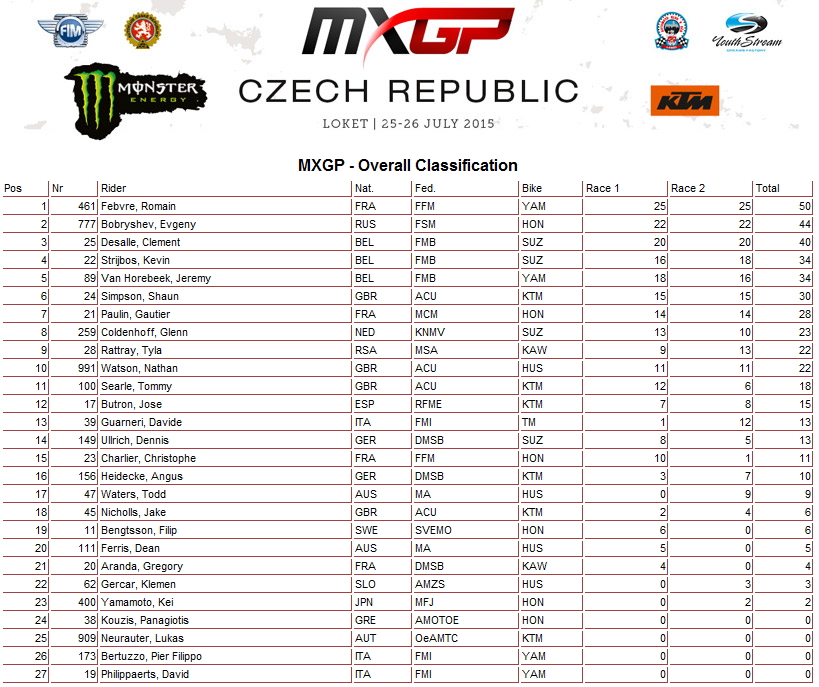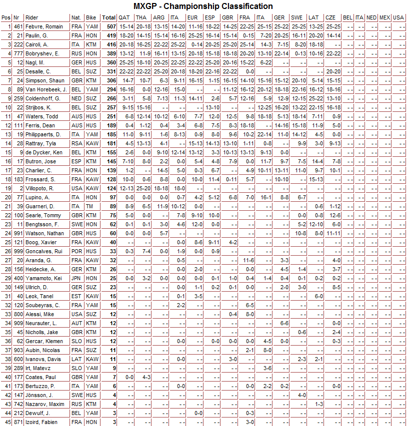 Ну, а абсолютным победителем этапа в классе MXGP стал лидер общего зачета француз Ромьен Февр, который в серьезной борьбе выиграл оба заезда.