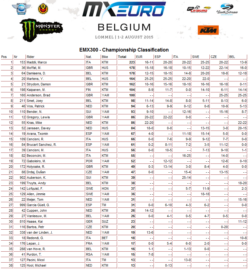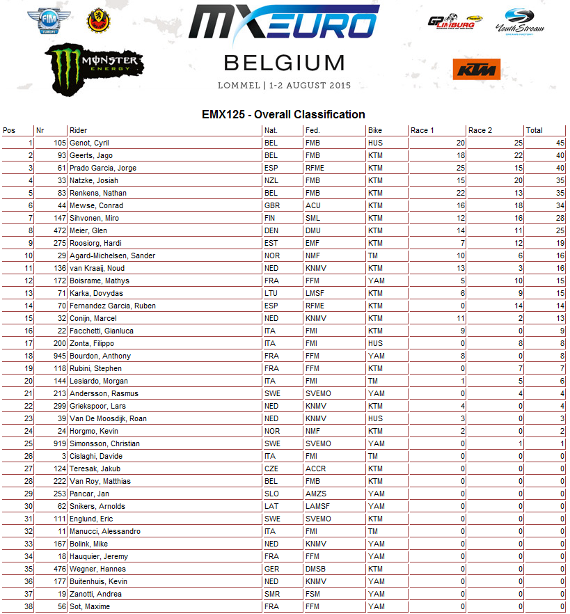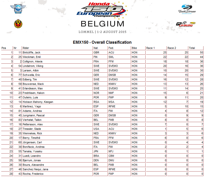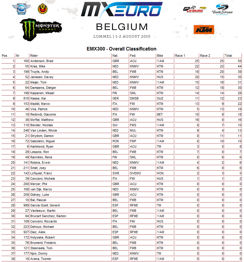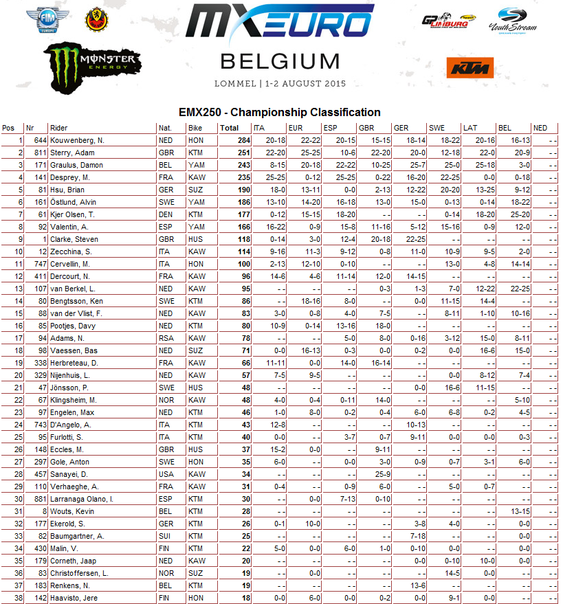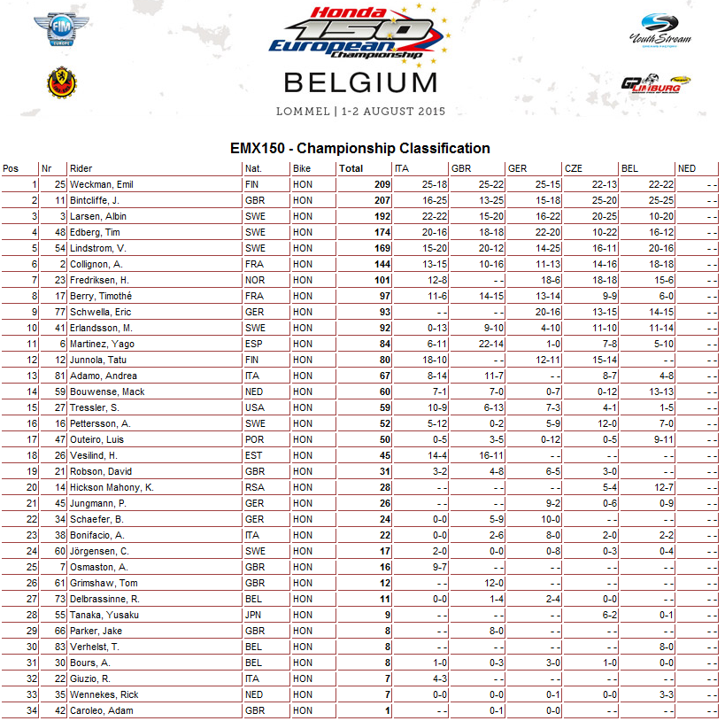 Результаты бельгийского этапа и общий зачет Чемпионата Европы 2015 в классах ЕМХ125, ЕМХ150, ЕМХ250 и ЕМХ300.