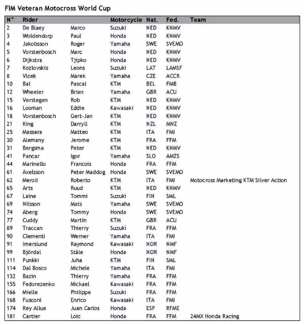 Список участников Кубка мира среди ветеранов, который пройдет 30 августа в Ассене (Голландия).