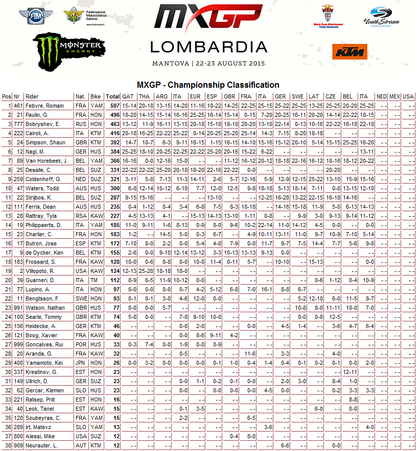 Абсолютным победителем в классе MXGP стал лидер чемпионата француз Ромьен Февр, вторым стал Джереми Ван Хоребик.