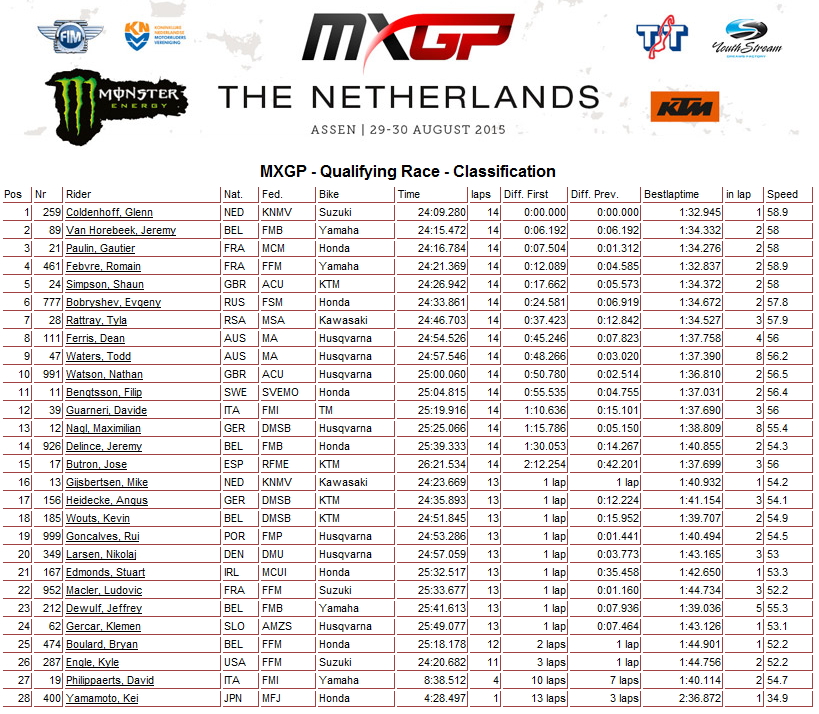Итоги квалификационных заездов шестнадцатого этапа Чемпионата мира 2015 в классах МХ2 и MXGP.
