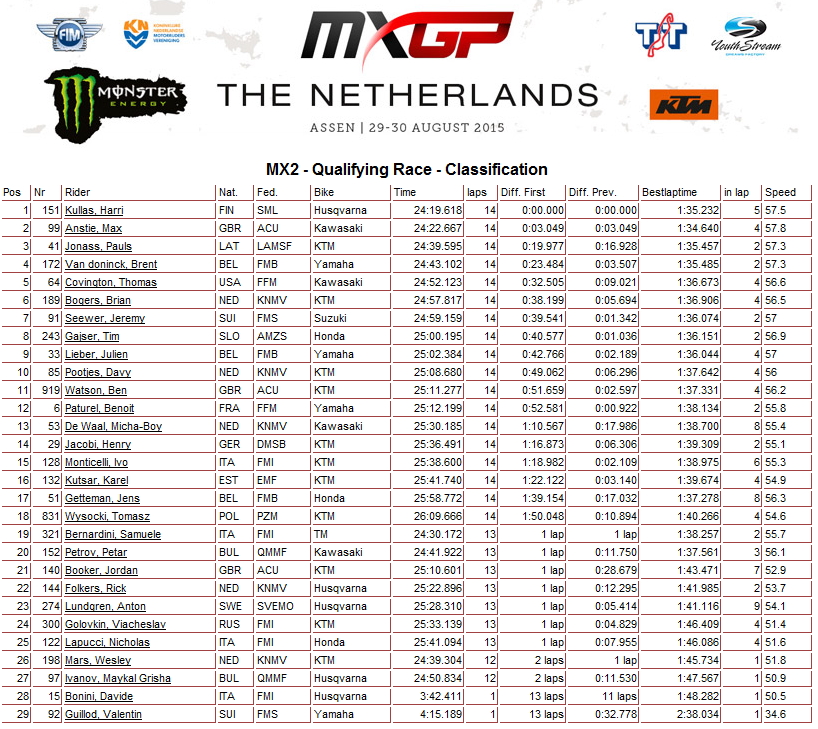 В Ассене только что завершились квалификационные заезды Гра-При Нидерландов. Победителями стали: в классе МХ2 Харри Куллас из Финляндии, а в MXGP голландец Гленн Колденхофф.