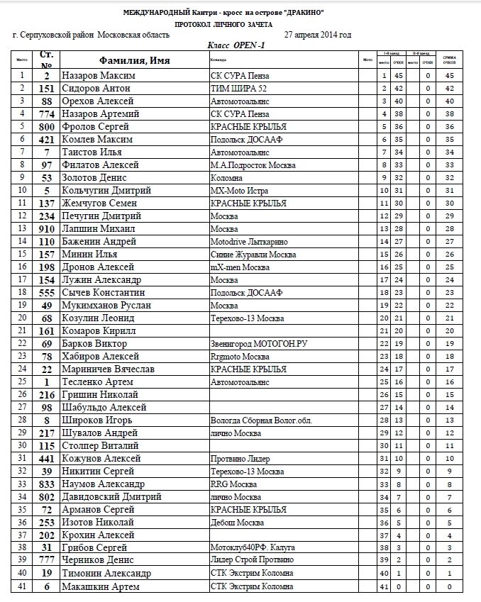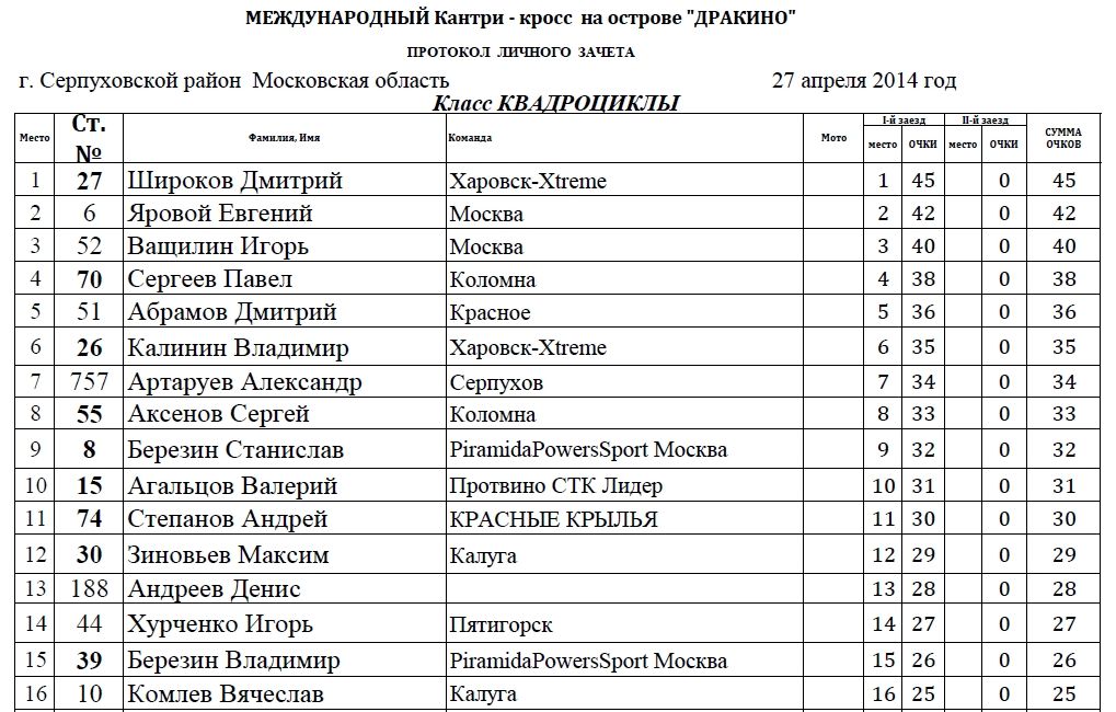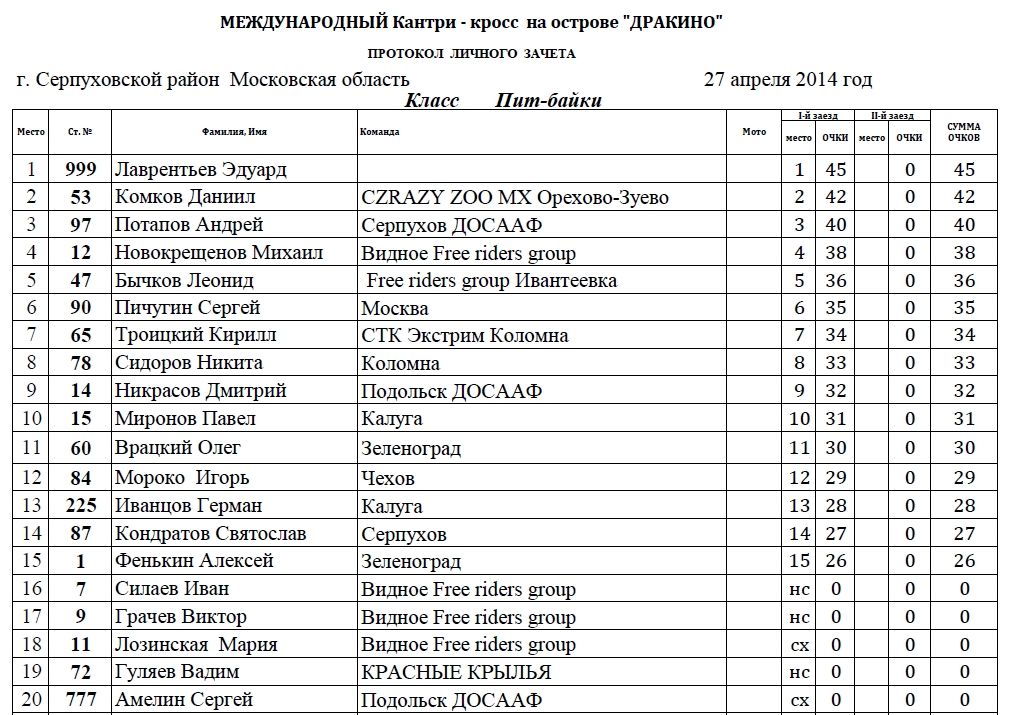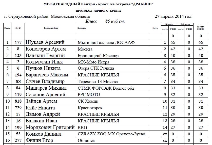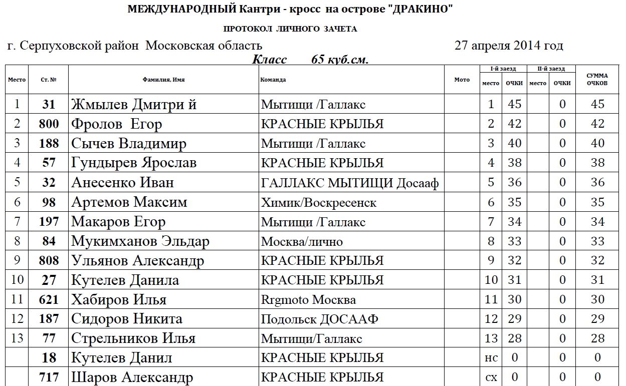 Пляжный мотокросс в Дракино - результаты. 28.04.2014 Роман Мишенев (_) Классы: 65сс, 85сс, МОТО, ATV и PitBike. В минувшее воскресенье 27 апреля на острове в Дракино (Серпуховский район) прошел первый этап Международного пляжного мотокросса. Предлагаем ознакомиться с результатами гонки по классам: Комментарии Комментарии к этой статье запрещены.