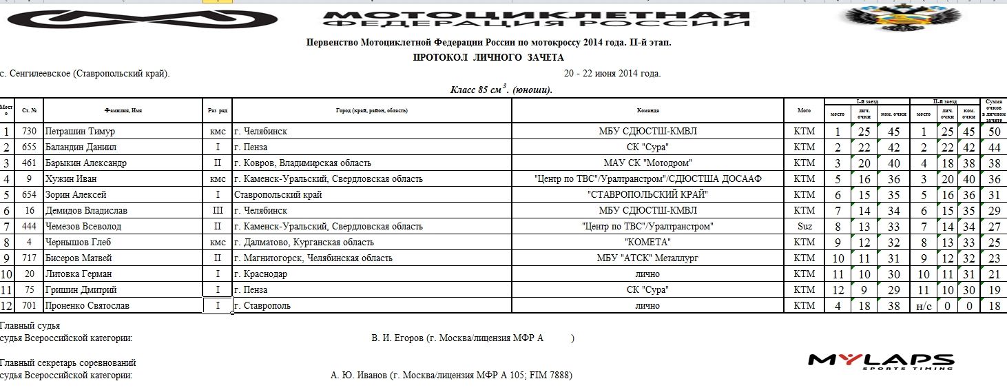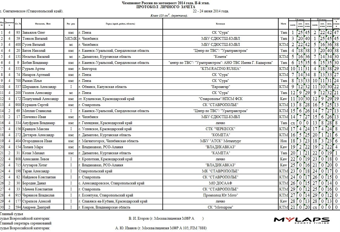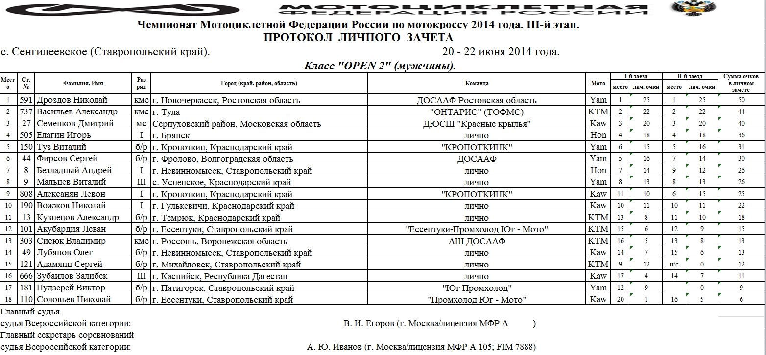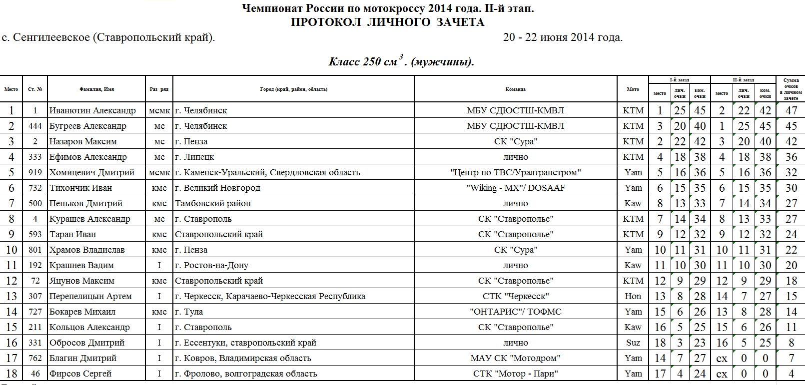 Чемпионат России, Чемпионат и Первенство МФР - Сенгилеевское. 24.06.2014 МФР Полные результаты... Протоколы результаты этапов Чемпионата России, Чемпионата и Первенства Мотоциклетной федерации России по мотокроссу, состоявшихся 20–22 июня 2014 года в с. Сенгилеевское (Ставропольский край). Комментарии Комментарии к этой статье запрещены.