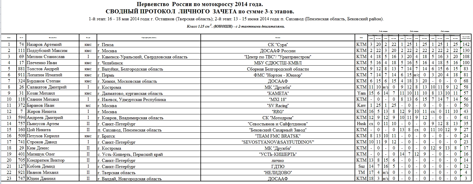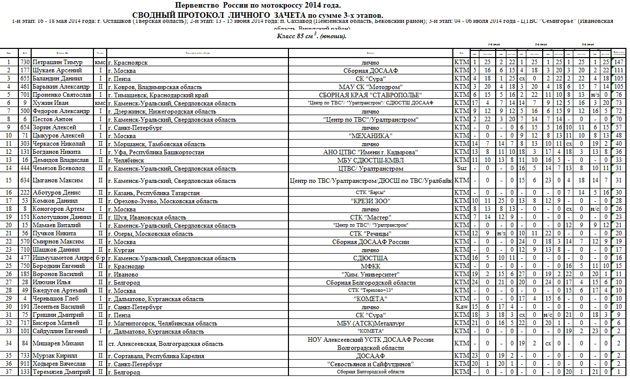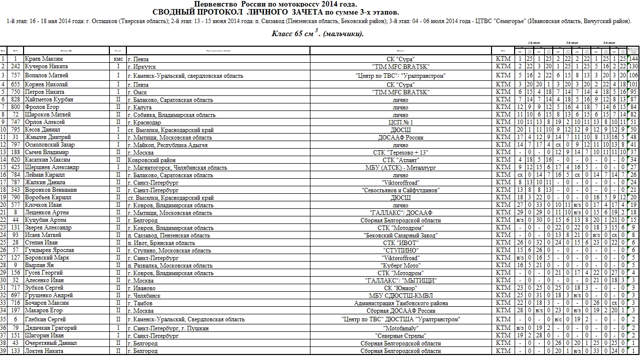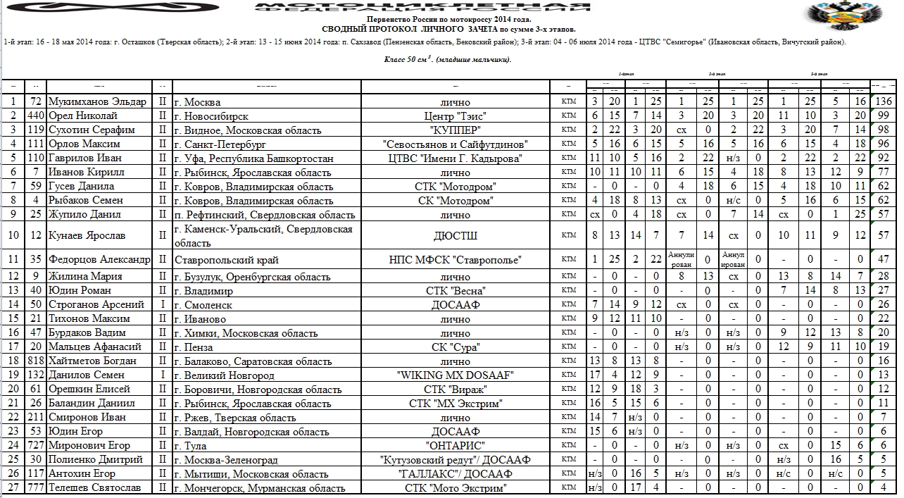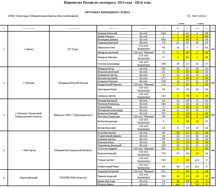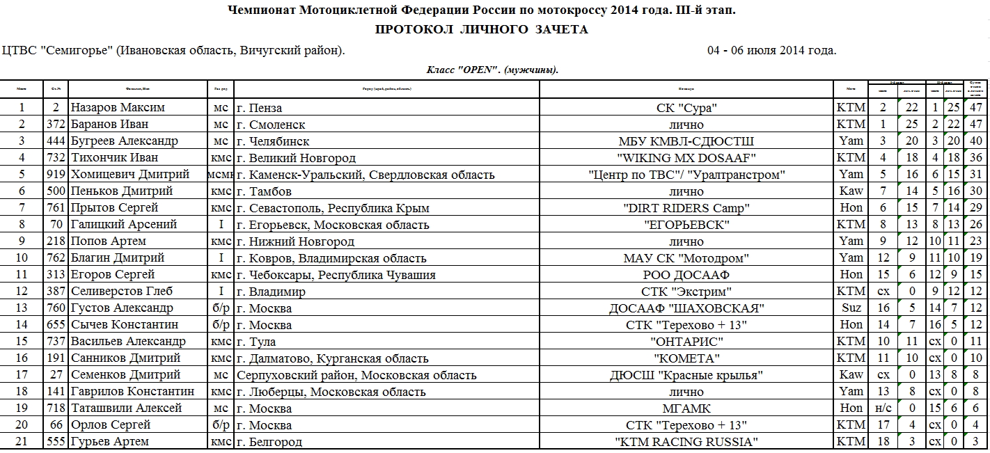 В минувшие выходные, 5-6 июля в Семигорье (Ивановская область) состоялся третий этап Первенства России по мотокроссу 2014. Предлагаем ознакомиться с протоколами результатов (нажмите на картинку, чтобы увеличить изображение):
