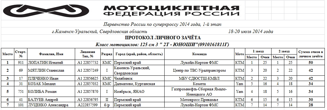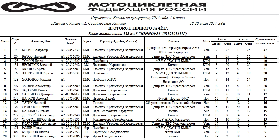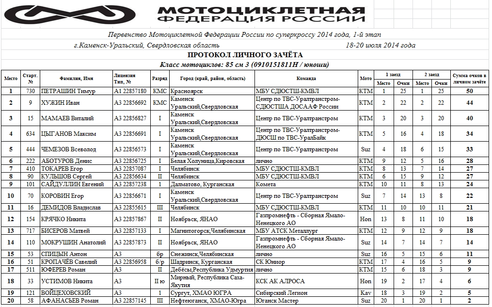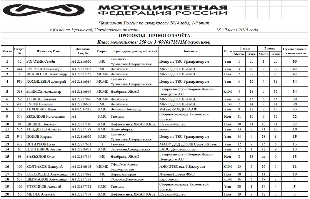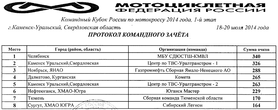 В минувшие выходные, 18-20 июля в городе Каменск-Уральский (Свердловская область) состоялся 1-й этап Чемпионата России, Первенства России, Первенства Мотоциклетной Федерации России по суперкроссу и Командного Кубка России по мотокроссу 2014.