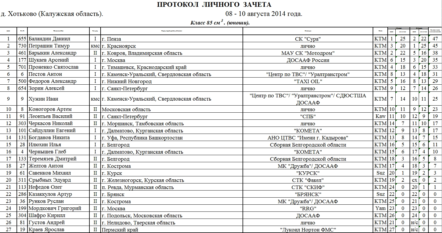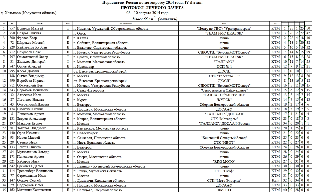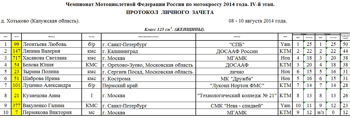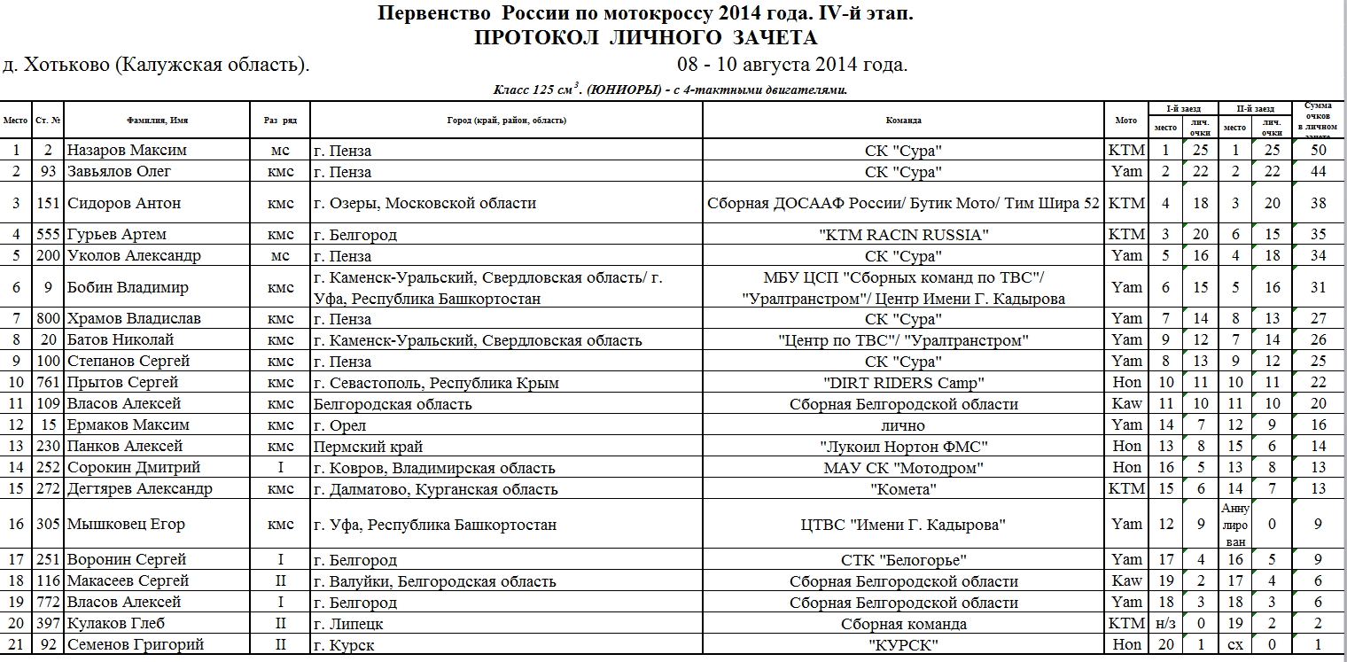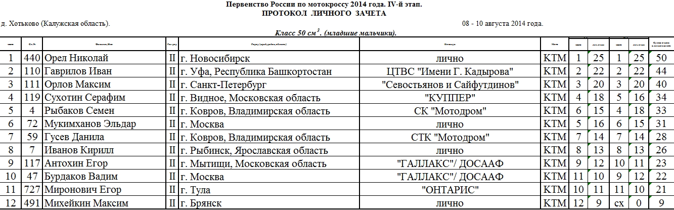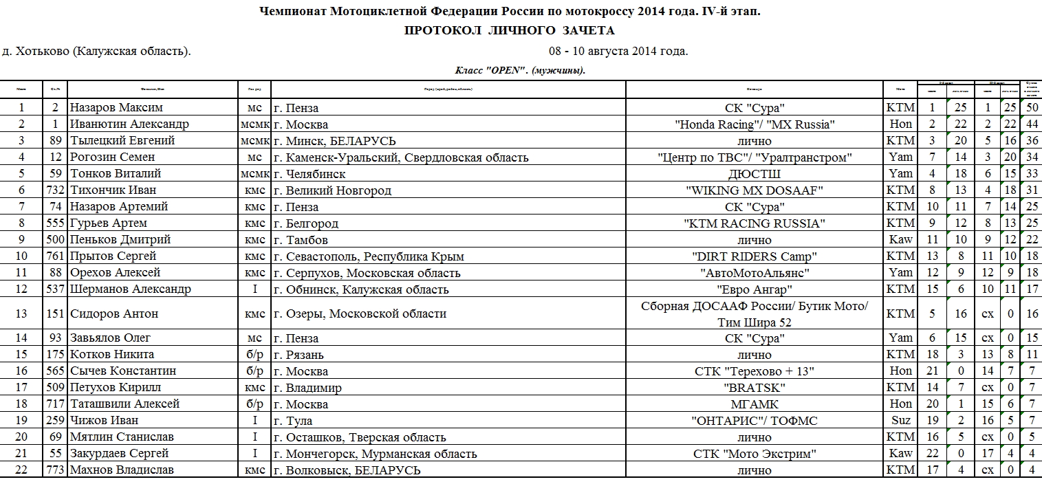 Первенство России и Чемпионат МФР 2014 - Хотьково. 12.08.2014 МФР Протоколы результатов четвертого этапа... 8-10 августа 2014 года в д. Хотьково (Калужская область) прошел 4-й этап Первенства России и Чемпионата МФР по мотокроссу 2014. Предлагаем ознакомиться с результатами соревнования: Комментарии Комментарии к этой статье запрещены.