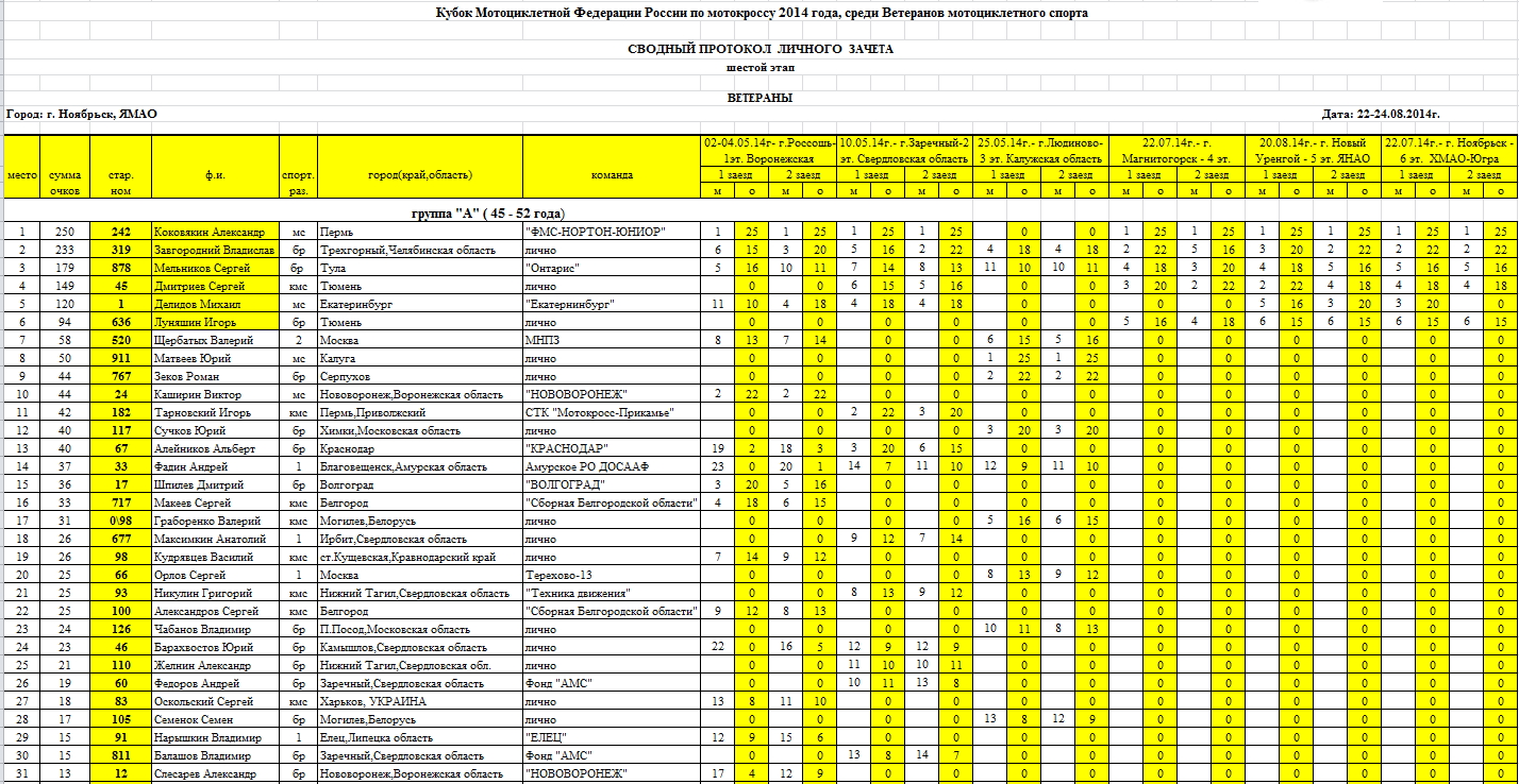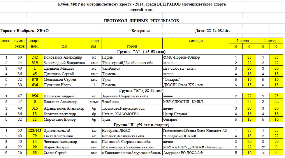Кубок МФР 2014 - Ветераны - Ноябрьск. 28.08.2014 Роман Мишенев (_) Протоколы результатов шестого этапа и общий зачет Кубка МФР 2014 среди ветеранов... Результаты 6-го этапа Кубка Мотоциклетной федерации России среди ветеранов, состоявшегося 22-24 августа в Ноябрьске (Ямало-Ненецкий АО): Комментарии Комментарии к этой статье запрещены.