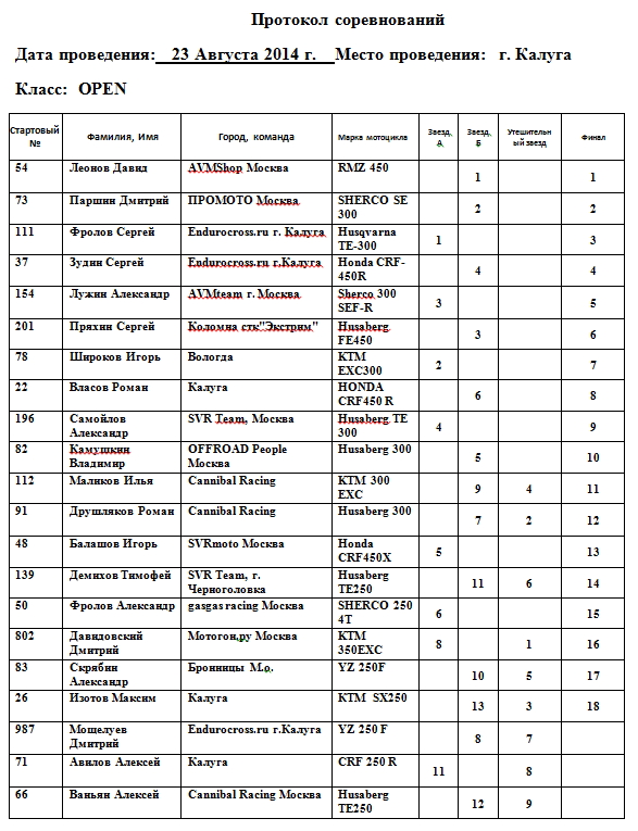 Несомненно, все ждали начала конца. Именно тогда должна была раскрыться самая главная интрига мотопраздника – кто победит? Ведь на мотоарене выступали спортсмены международного класса – москвичи Давид Леонов и Дмитрий Паршин, калужанин Сергей Фролов, который дебютировал в дисциплине Endurocross.ru под несвойственным ему номером 111.