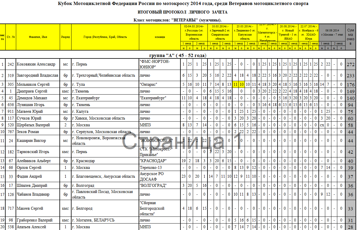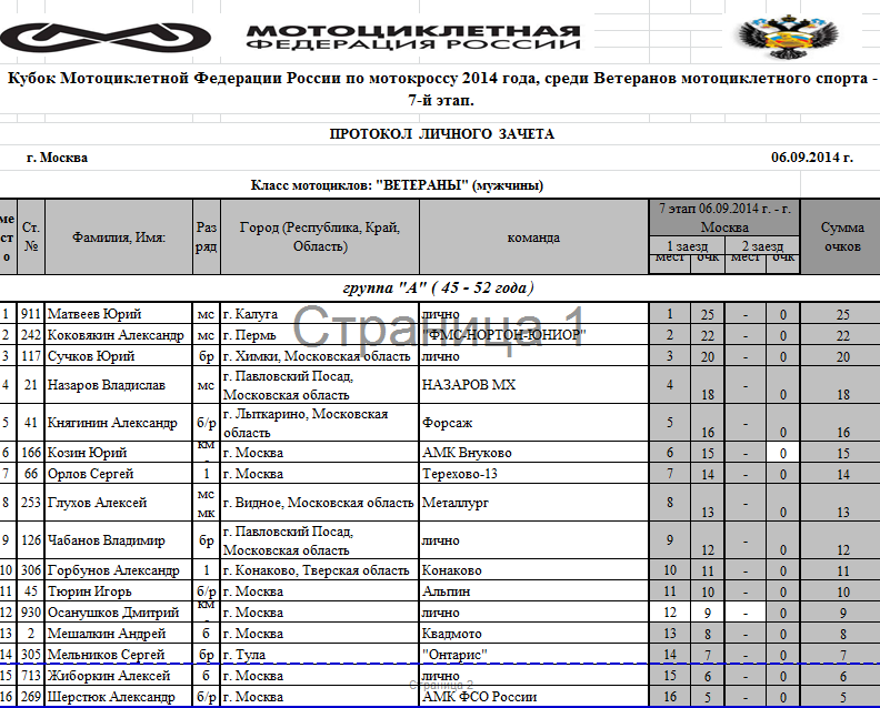 Итоги Кубка Мотоциклетной Федерации России среди ветеранов 2014. 26.09.2014 Роман Мишенев (_) Протоколы результатов. Предлагаем ознакомиться с результатами 7-го этапа Кубка МФР среди ветеранов мотоциклетного спорта, состоявшегося в Москве, и итогами Кубка Мотоциклетной Федерации России 2014 года: Комментарии Комментарии к этой статье запрещены.