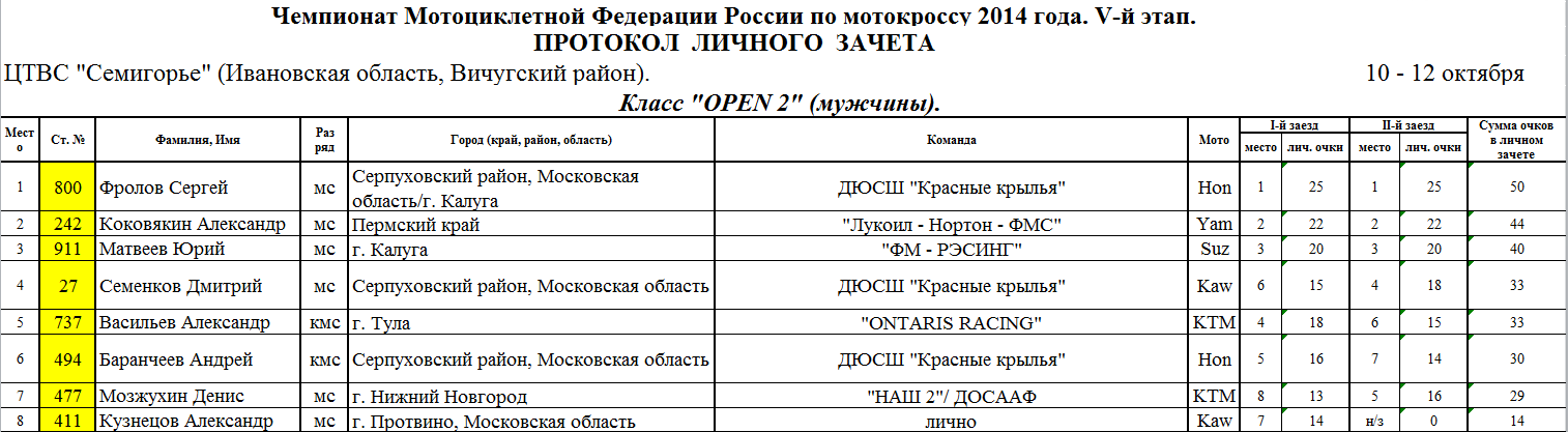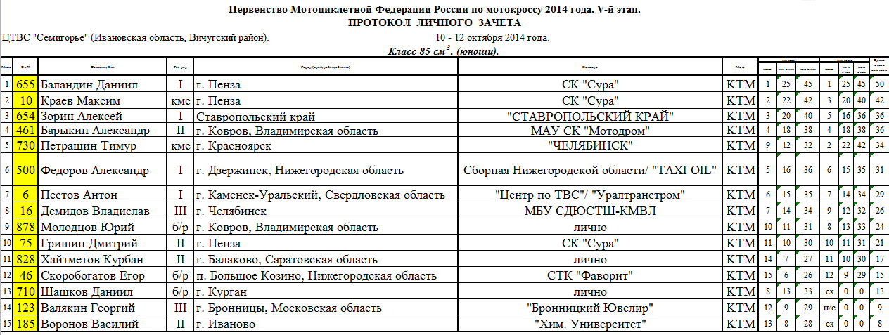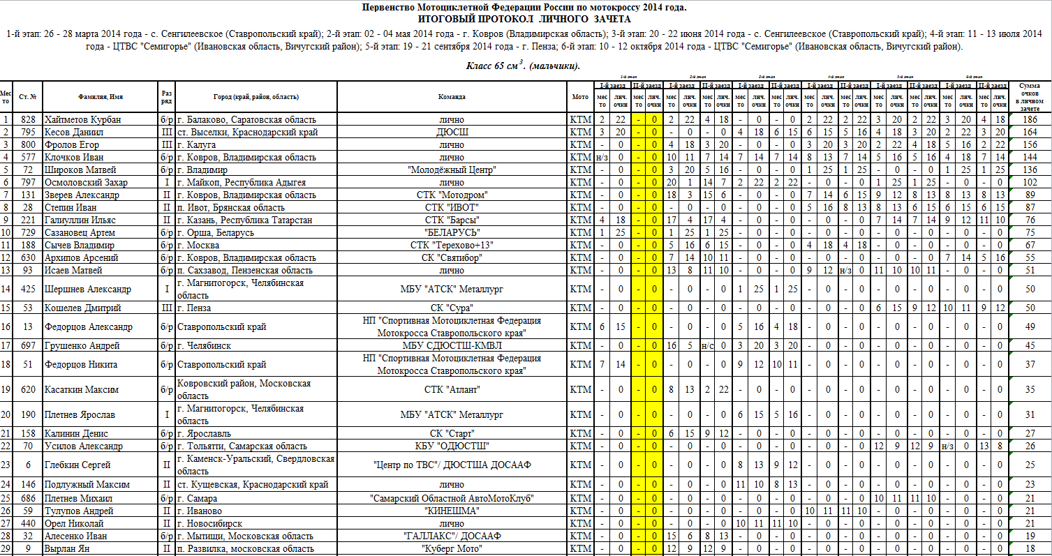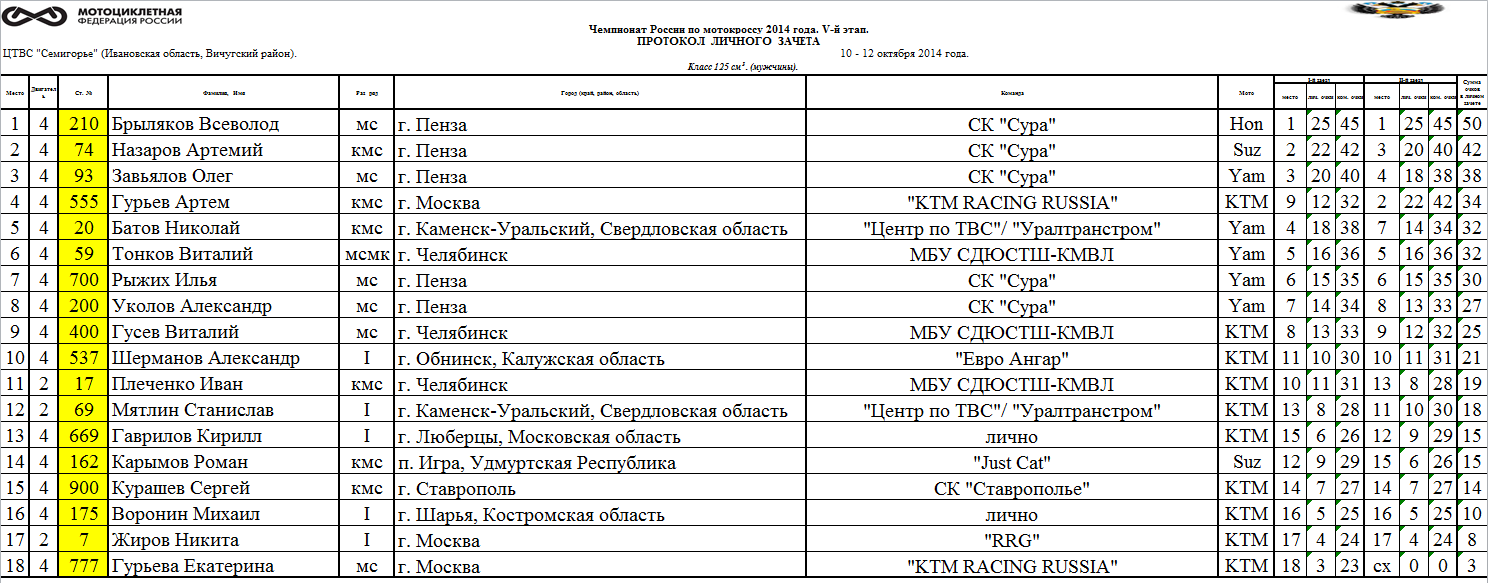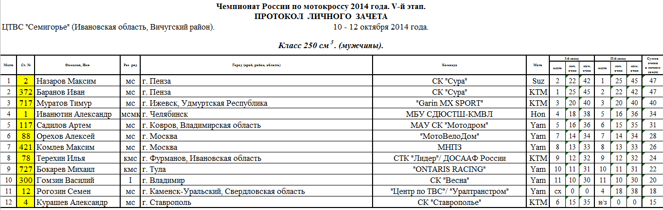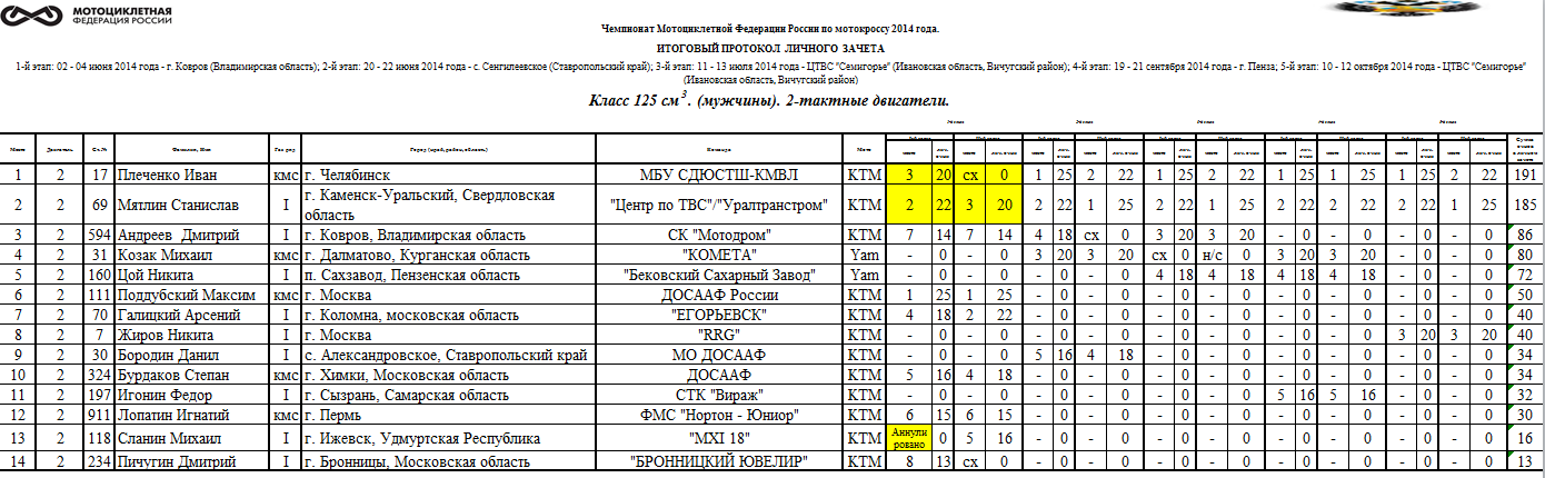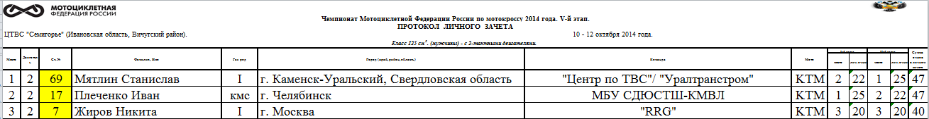 Протоколы результатов заключительного этапа и итоги Чемпионата России по Мотокроссу 2014 года.