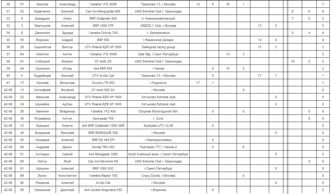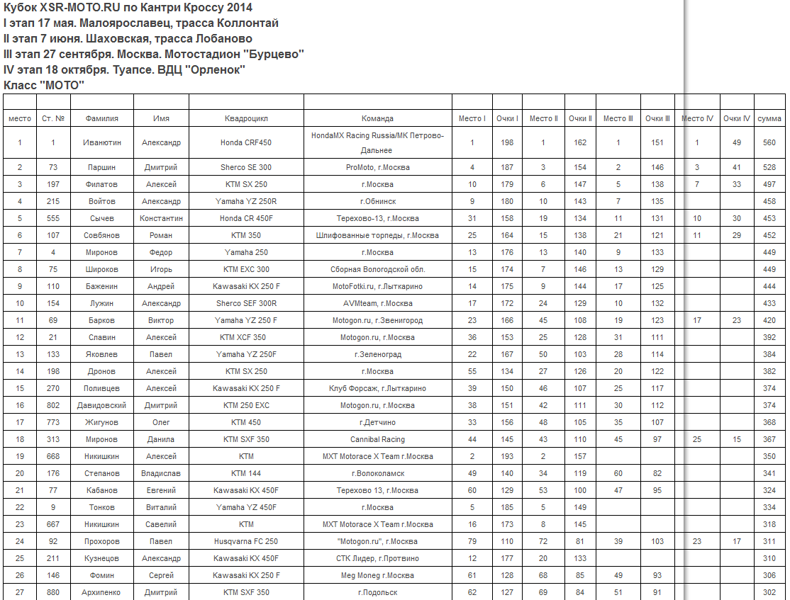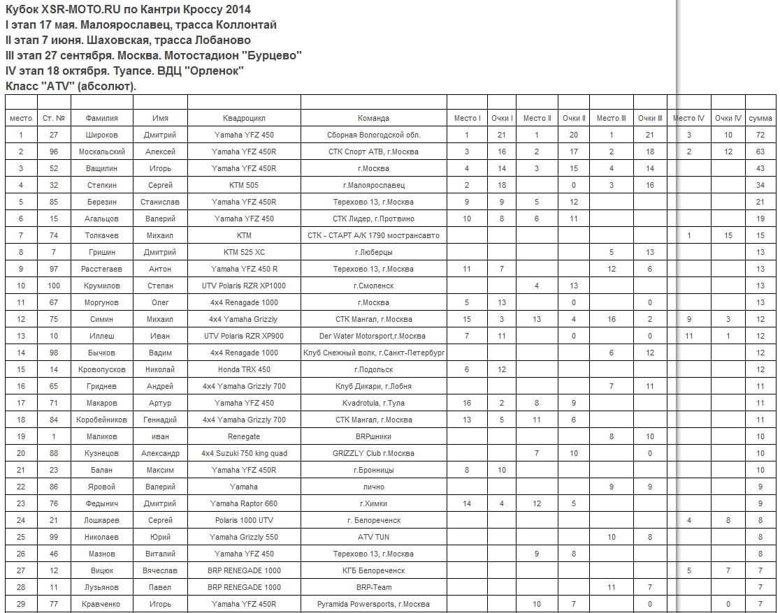 Кубок XSR-Moтo по кантри-кроссу 2014 – Итоги. 16.11.2014 Роман Мишенев (_) Итоговые результаты в классах МОТО и ATV. Комментарии Комментарии к этой статье запрещены.
