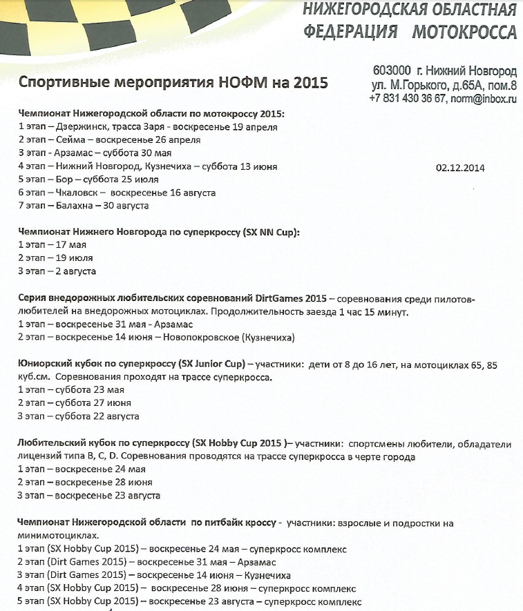 Календарь Нижегородской Федерации мотокросса 2015.