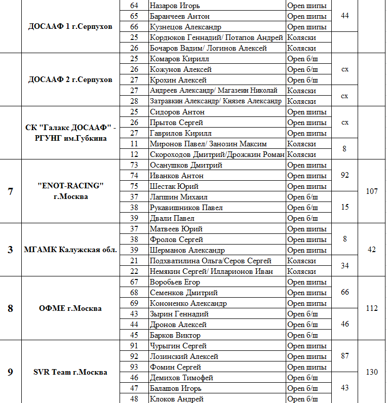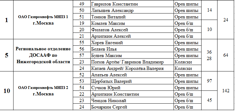 В классе «ОРЕN шипы» на первой позиции команда АМК ФСО России в составе: Олега Завьялова, Алексея Ярыгина и Алексея Орехова.
