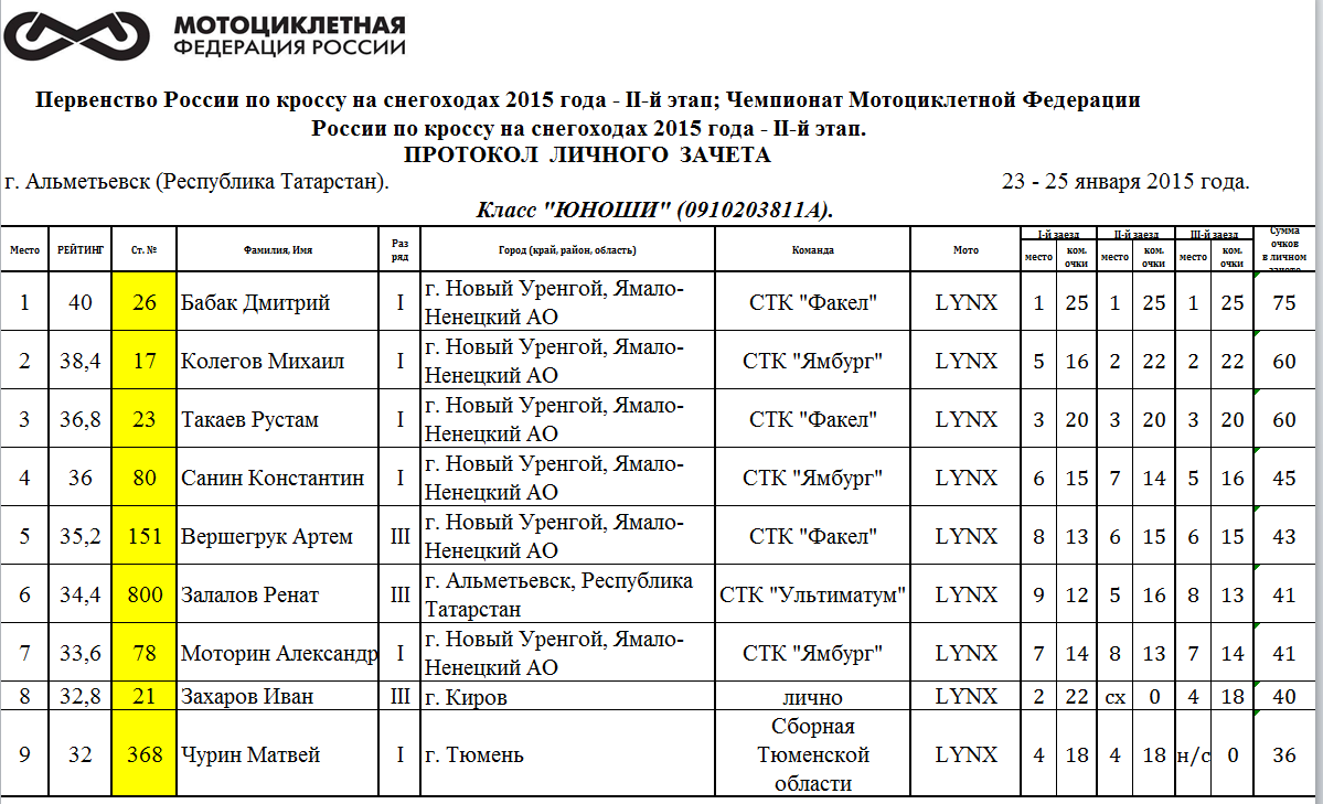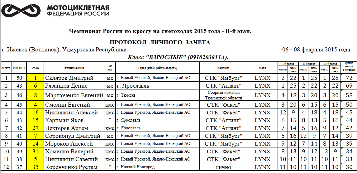 Протоколы результатов Чемпионата и Первенства России, Чемпионата МФР.