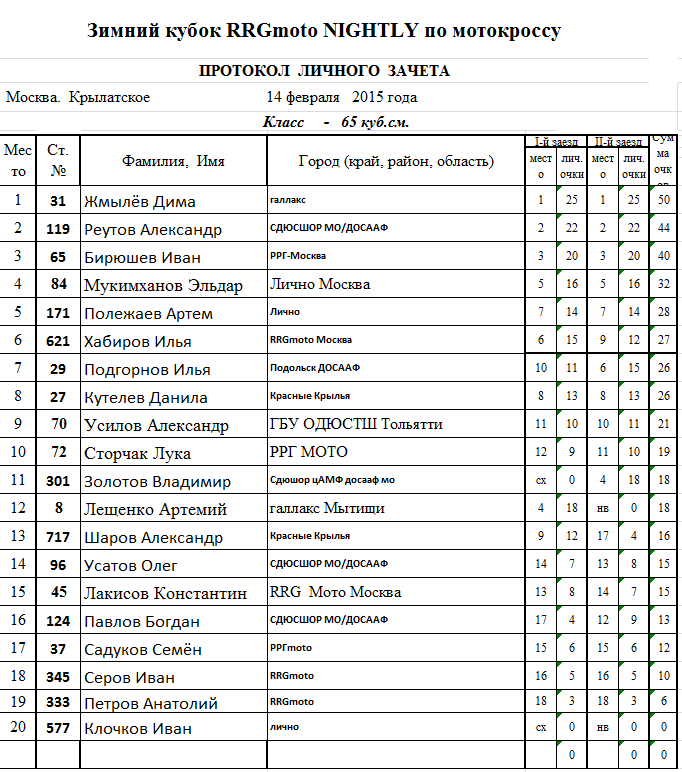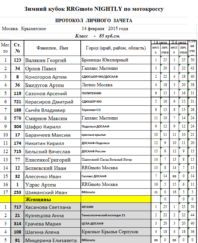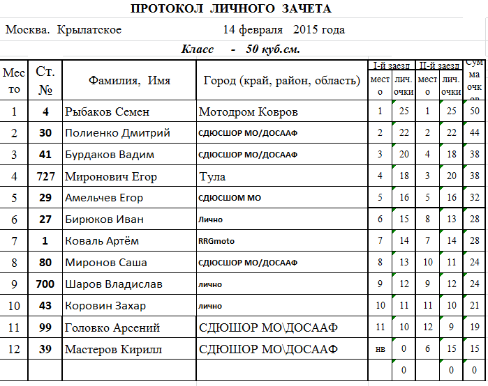 Протоколы результатов - Классы 50, 65 и 85сс:
