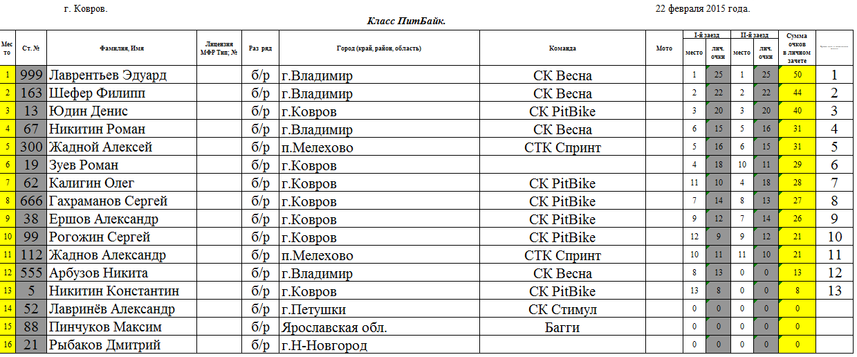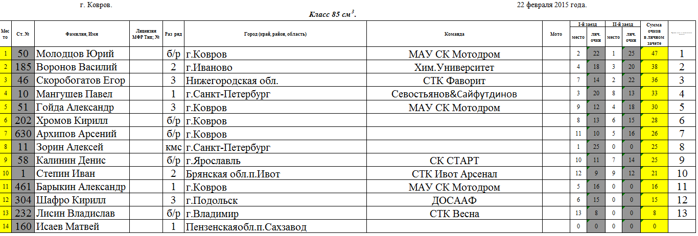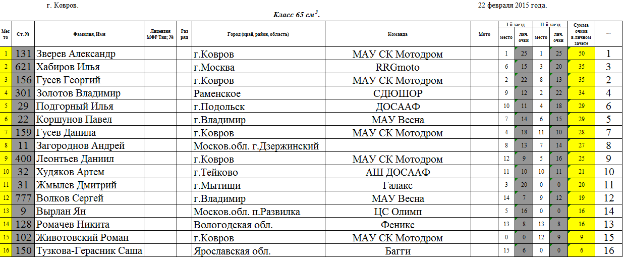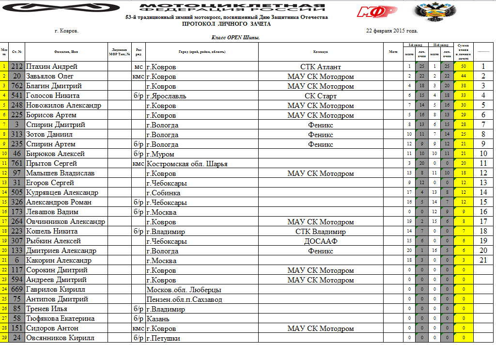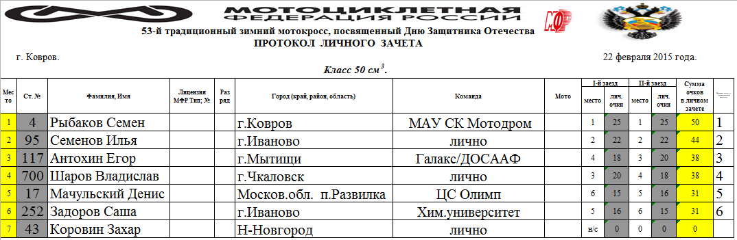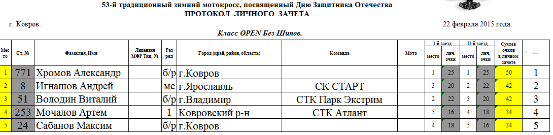 Традиционный мотокросс в Коврове. 24.02.2015 Роман Мишенев (_) Протоколы результатов гонки. В минувшее воскресенье, 22 февраля на стадионе спортивного комплекса "Мотодром" г.Ковров (Владимирская область) прошел 53-й традиционный зимний мотокросс, посвященный Дню защитника Отечества". Предлагаем ознакомиться с протоколами результатов гонки: Комментарии Комментарии к этой статье запрещены.