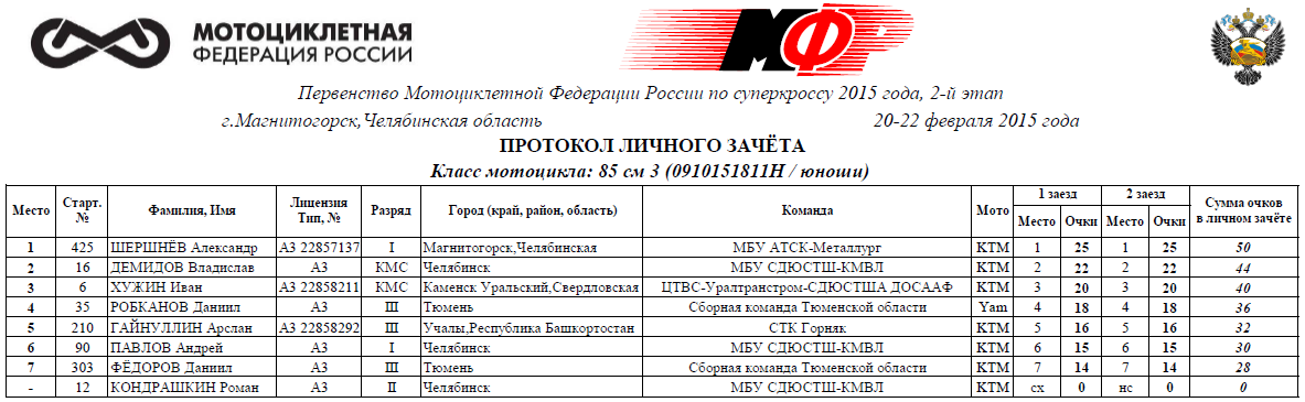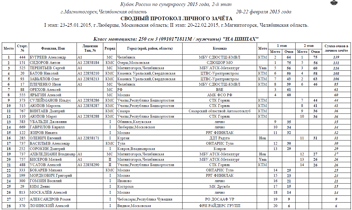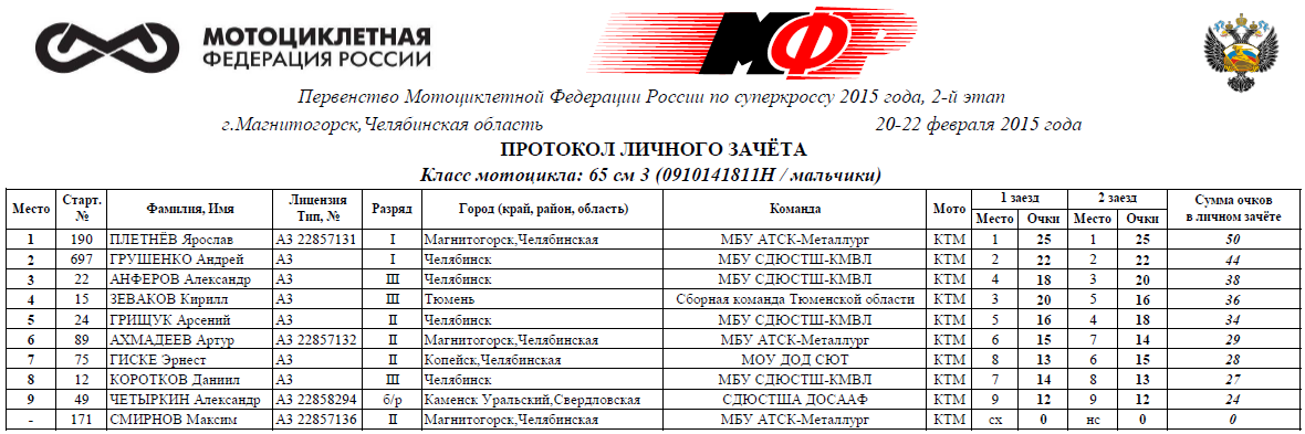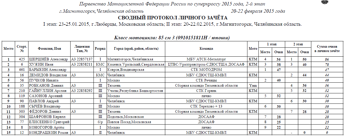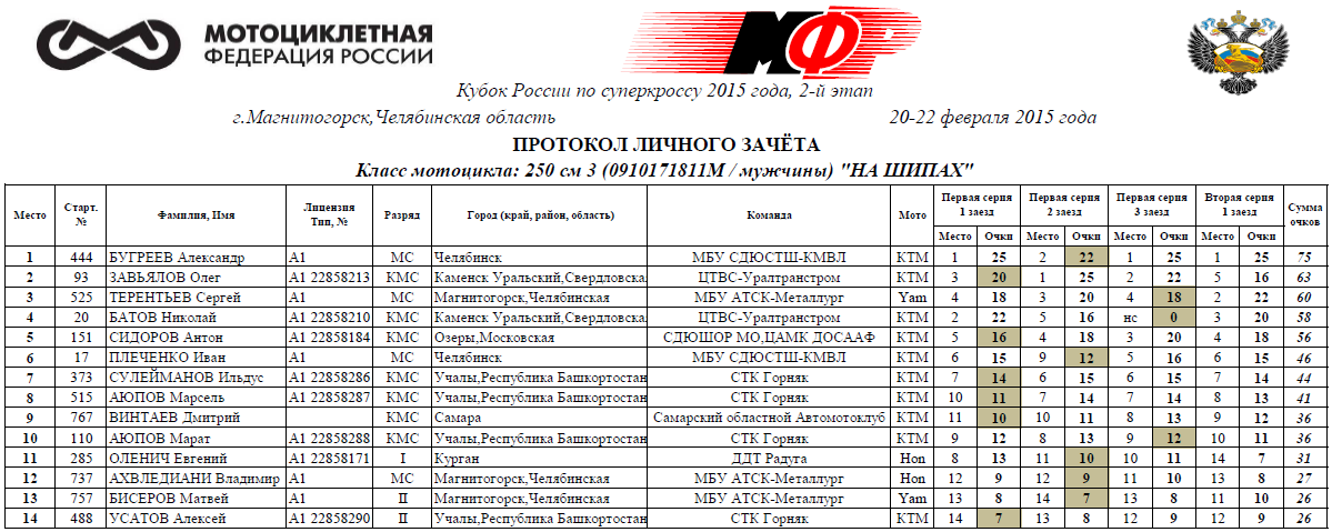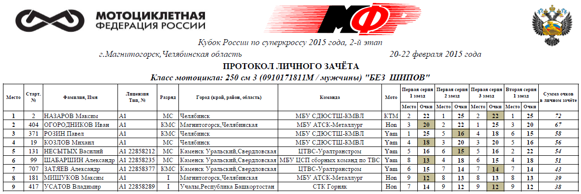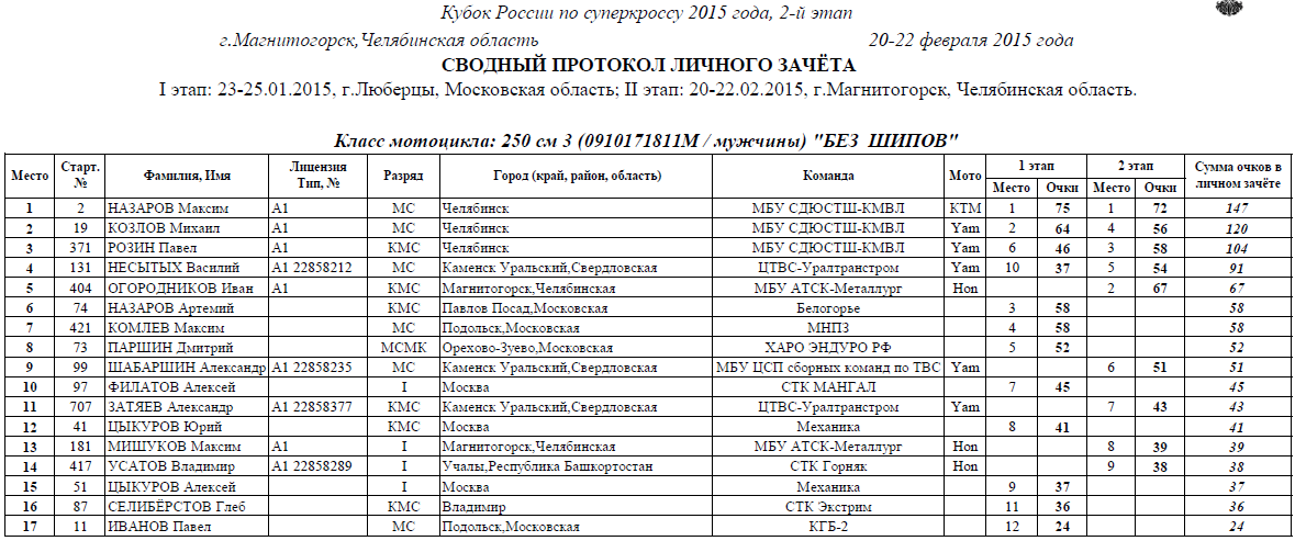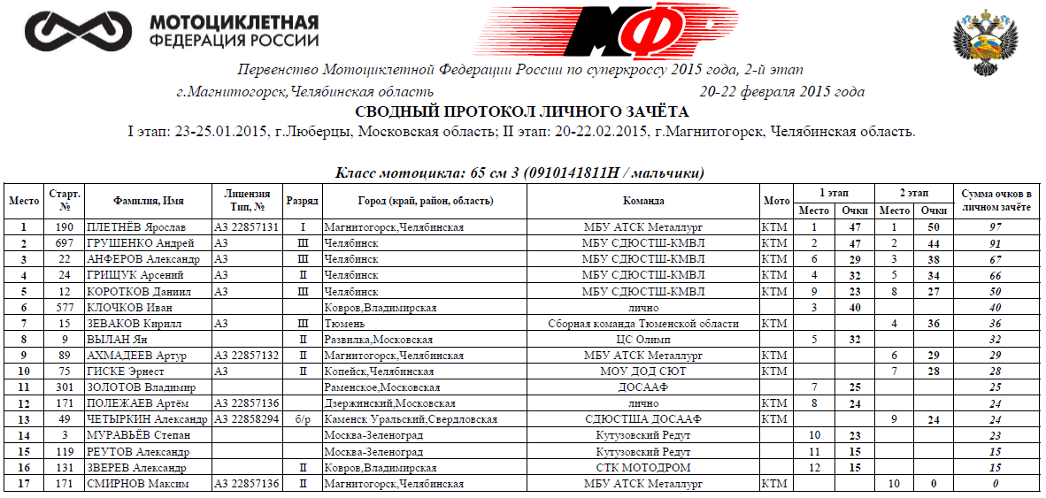 Протоколы результатов второго этапа (Магнитогорск):