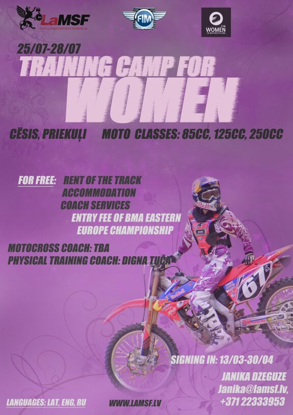 Латвийская федерация мотоспорта (LaMSF) совместно с Международной федерацией мотоспорта (FIM) летом этого года проводит женские тренировочные дни по мотокроссу.