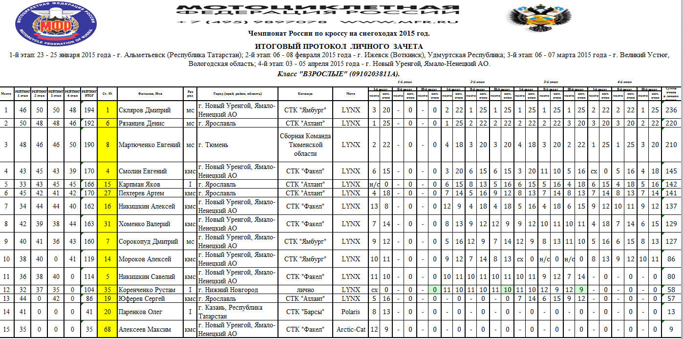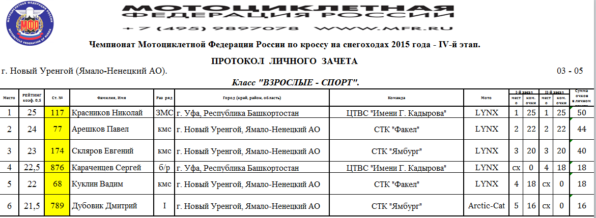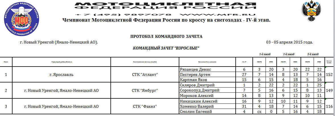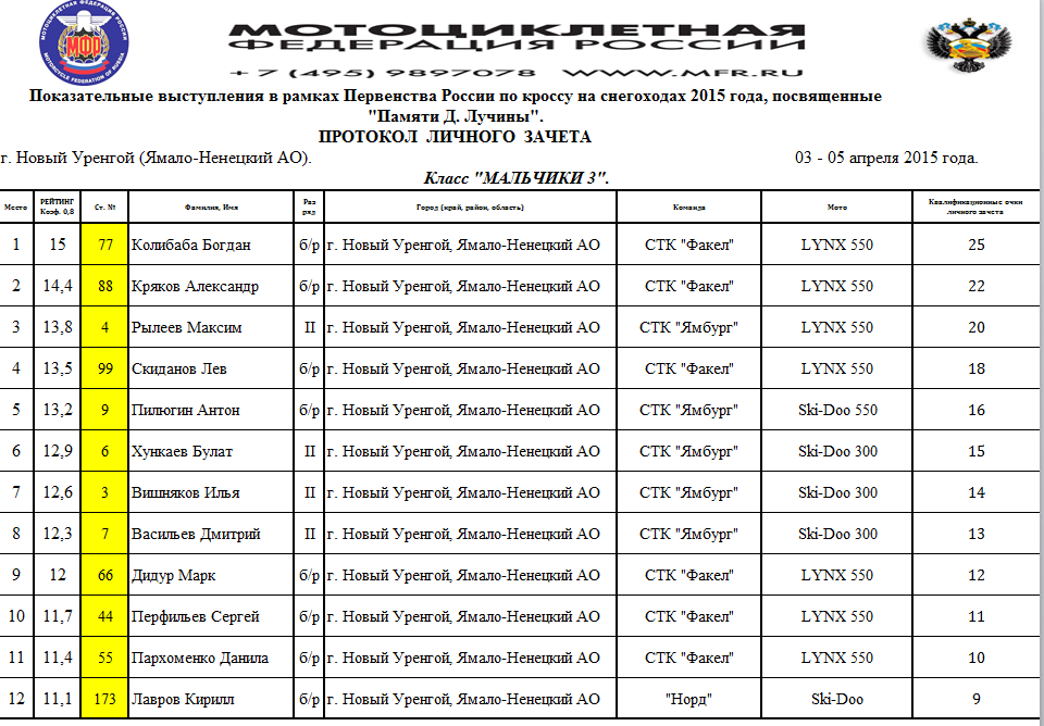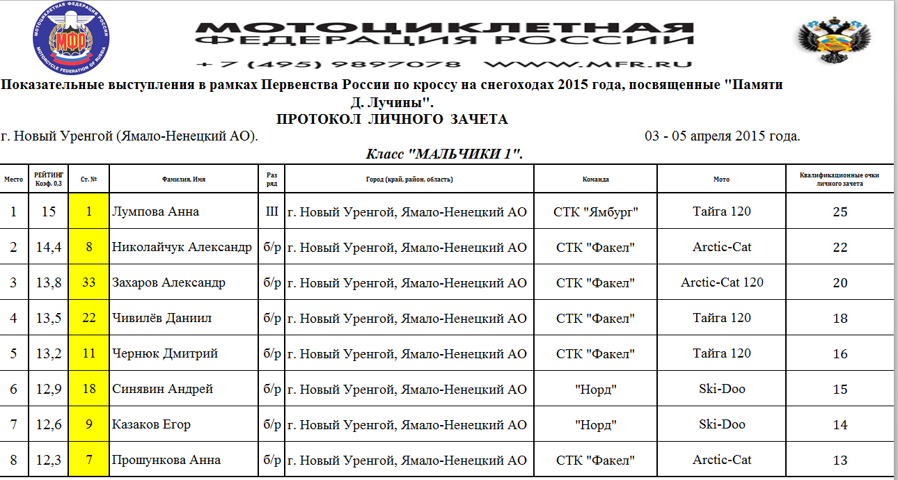 Протоколы результатов Чемпионата и Первенства России, Чемпионата Мотоциклетной Федерации России по кроссу на снегоходах, состоявшихся 3–4 апреля 2015 года в г. Новый Уренгой (Ямало-Ненецкий АО).