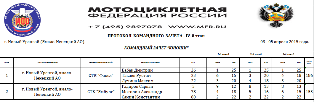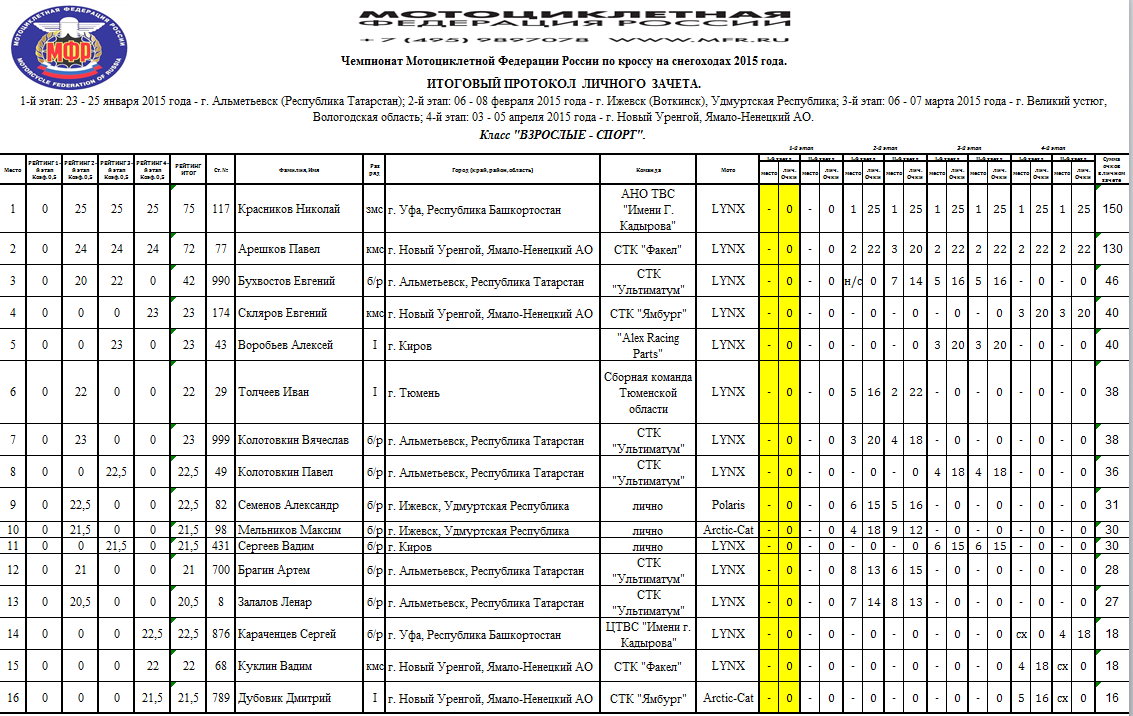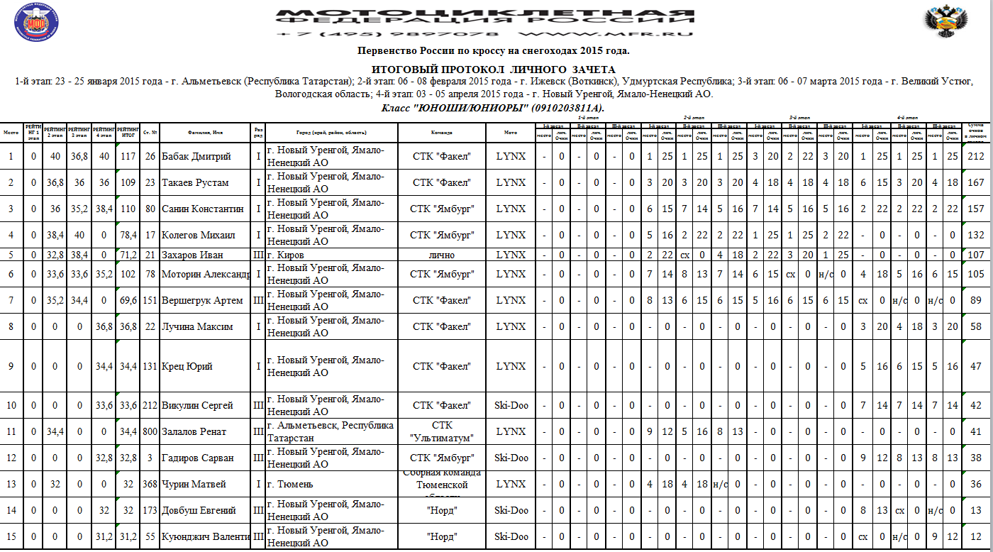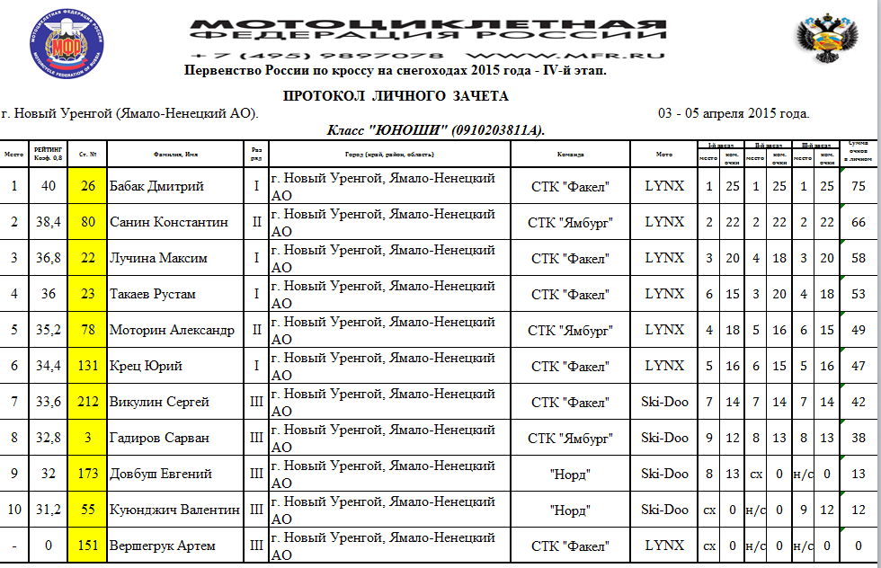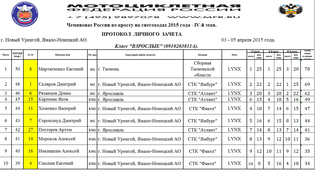 Протоколы результатов Чемпионата и Первенства России, Чемпионата Мотоциклетной Федерации России по кроссу на снегоходах, состоявшихся 3–4 апреля 2015 года в г. Новый Уренгой (Ямало-Ненецкий АО).