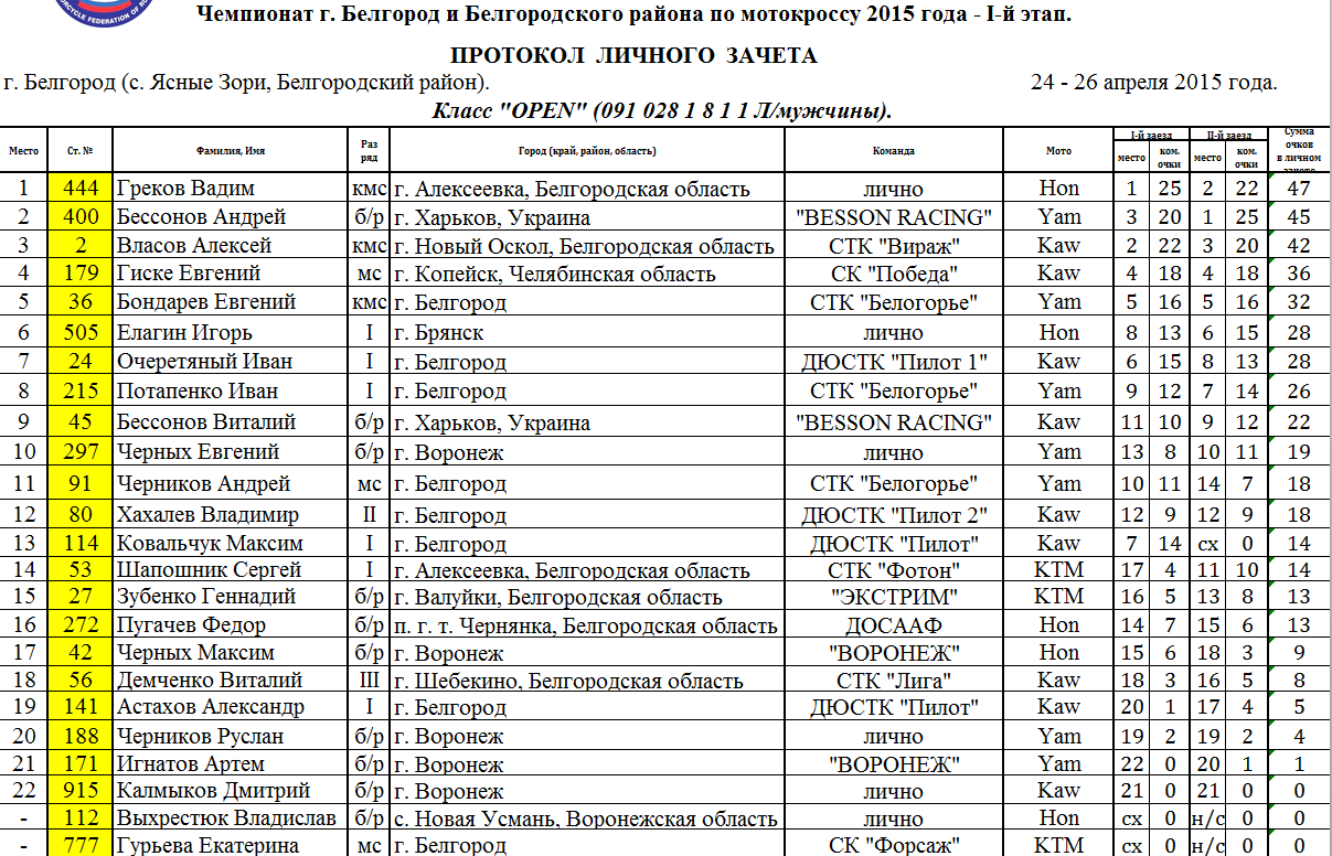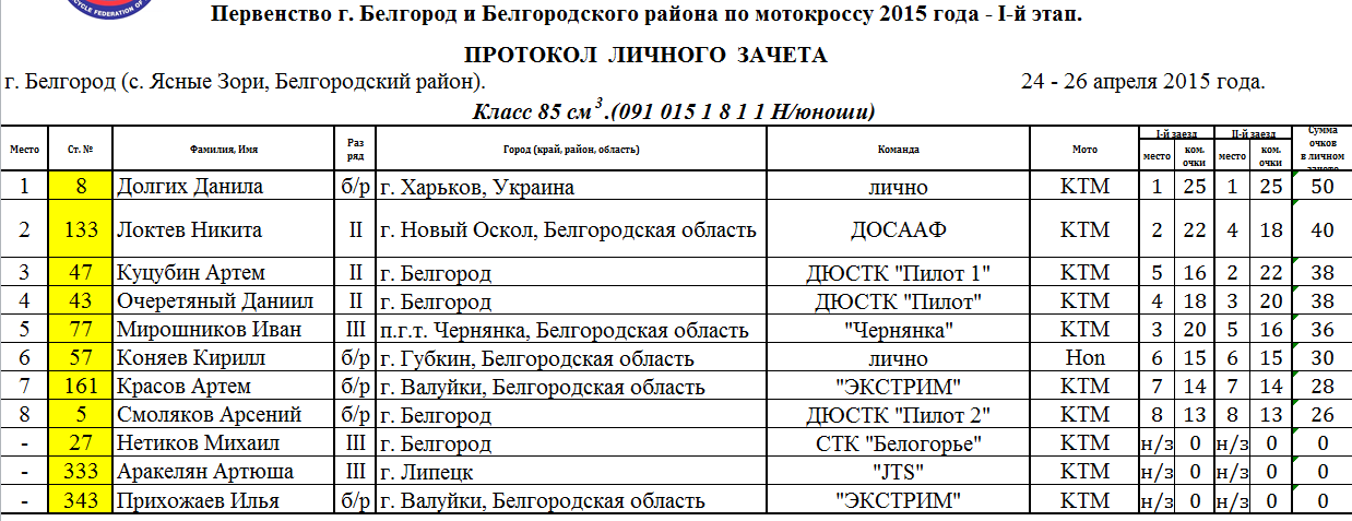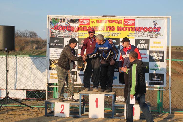 Заезды классов мотоциклов 50 см3, 65 см3 и 125 см3 Чемпионата и Первенства г. Белгорода и Белгородского района прошли 25 апреля. Воскресным днем, 26 апреля соревновались мотокроссмены, выступающие в классах «OPEN» и 85 см3, а также ветераны, выступающие в трех возрастных группах – «А», «Б» и «В».