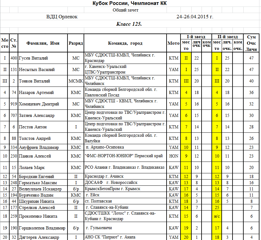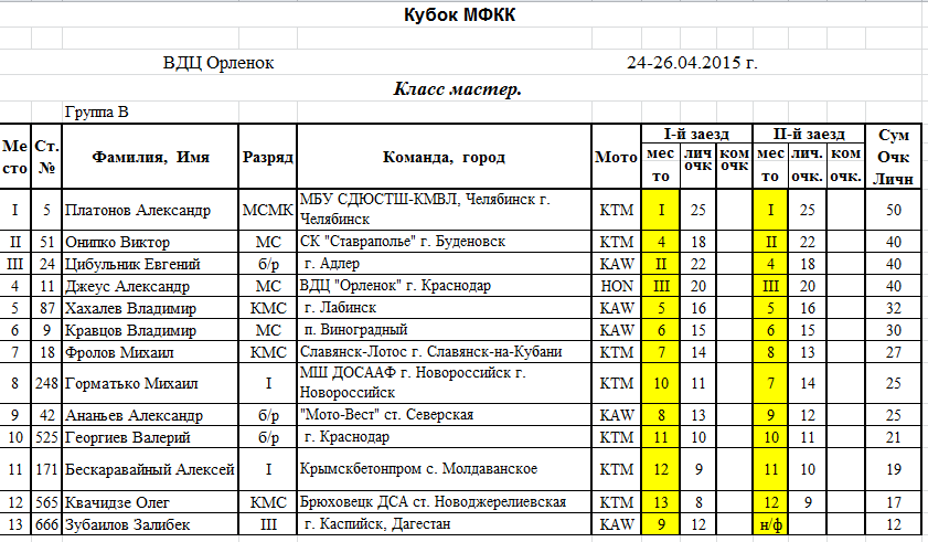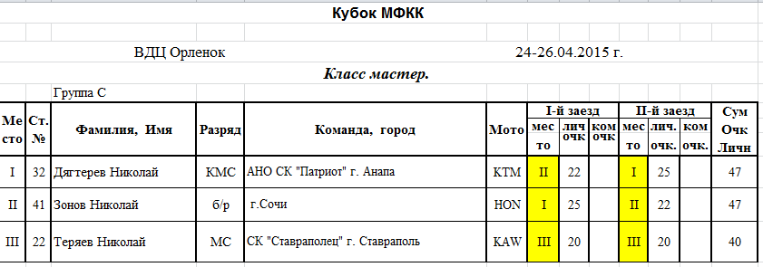 Протоколы результатов: