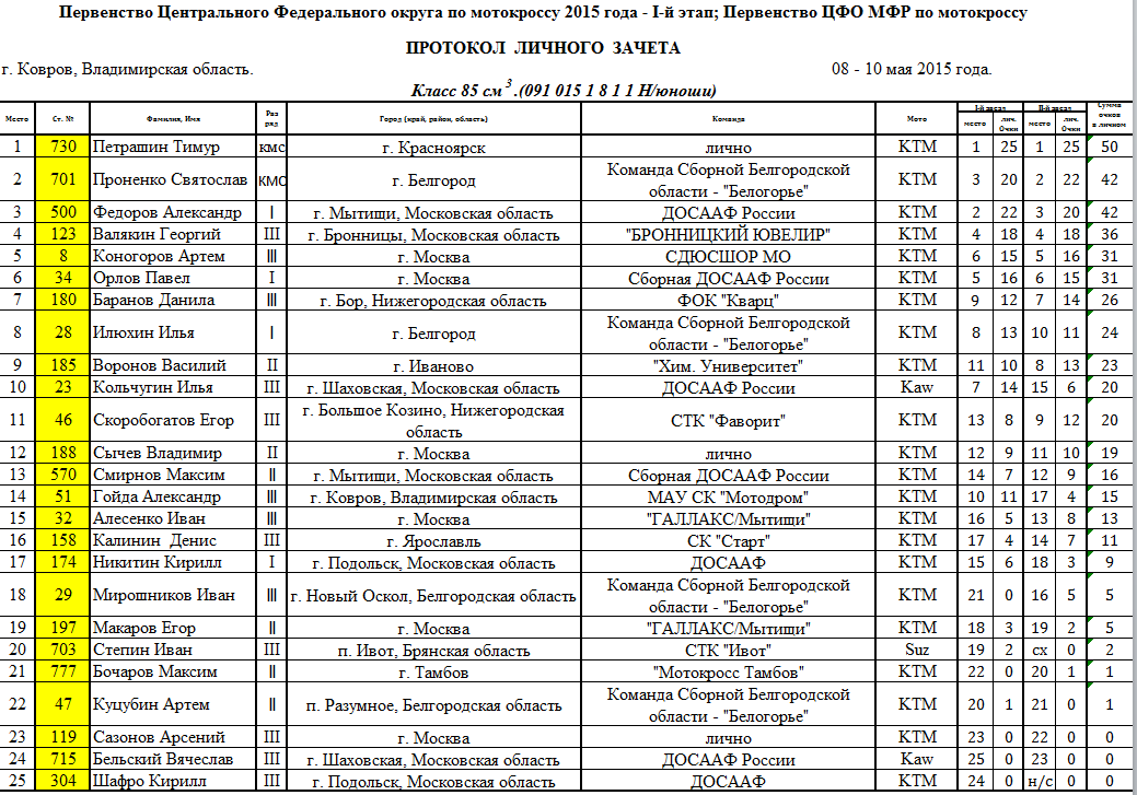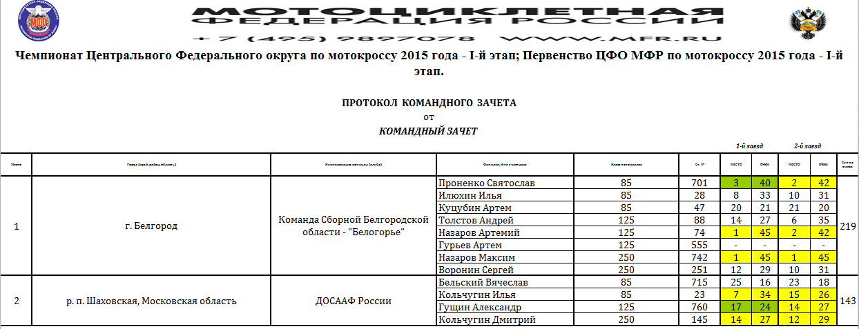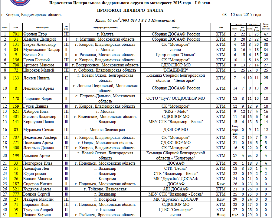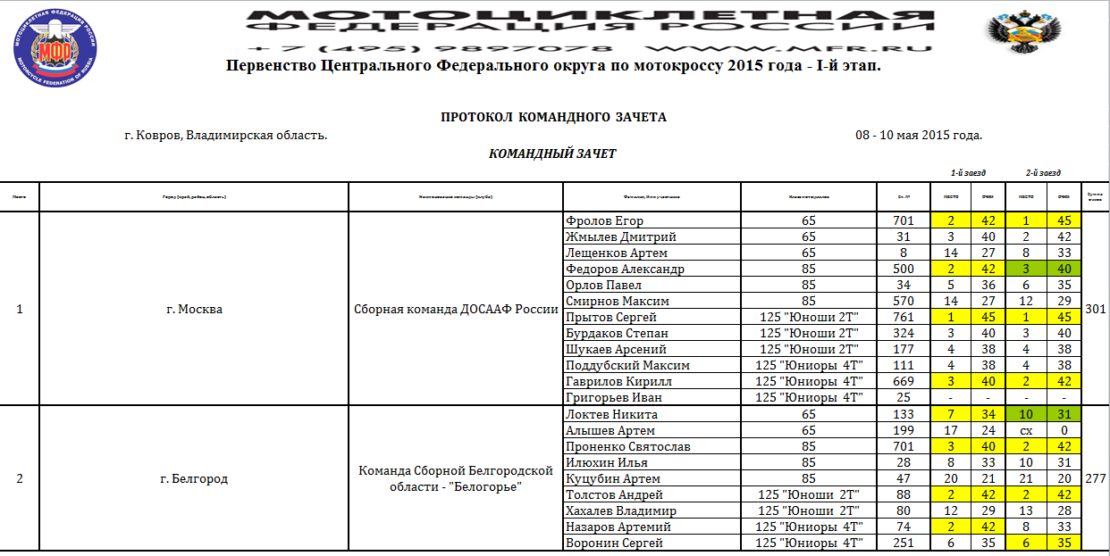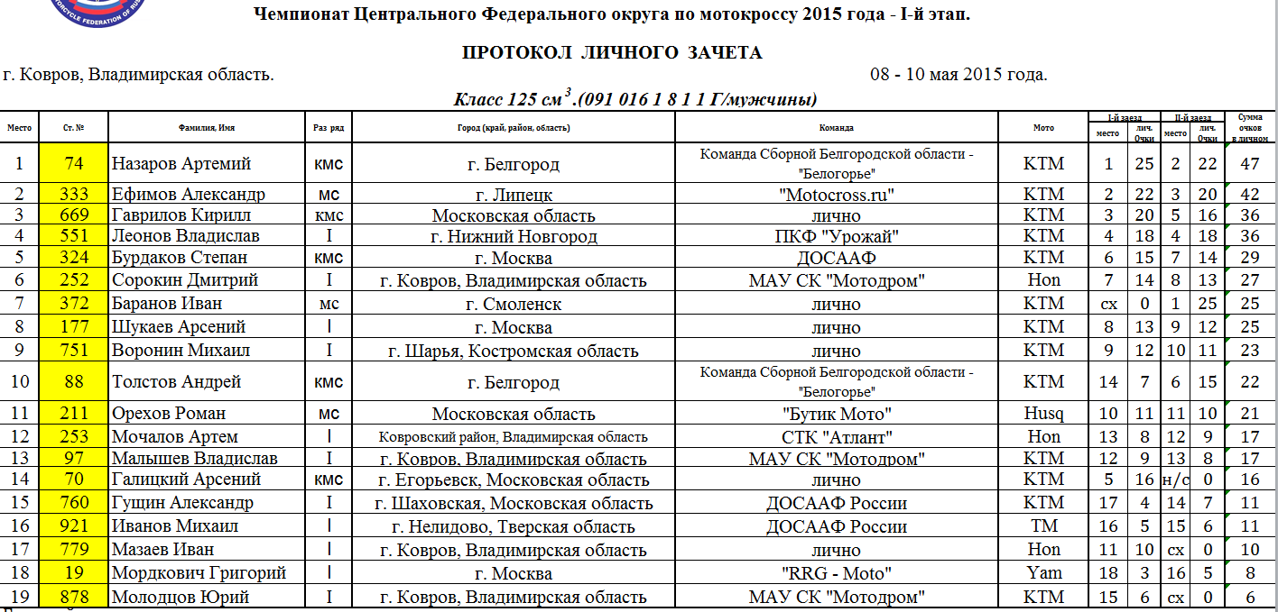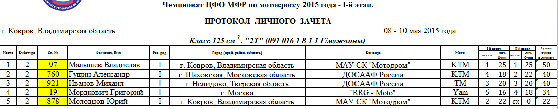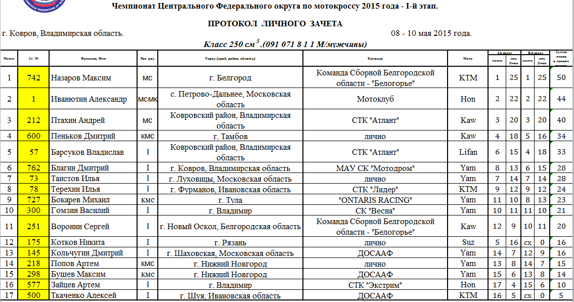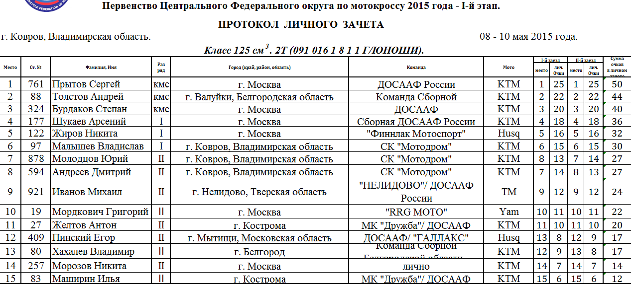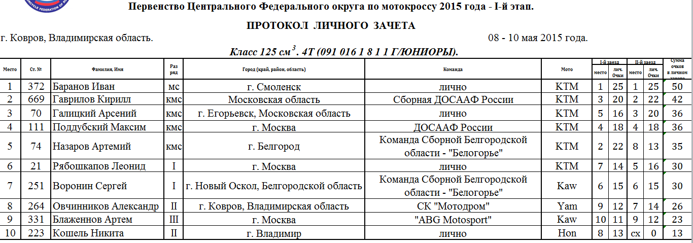 В минувшие выходные, 9 и 10 мая город Ковров (Владимирская область) принимал у себя первый этап Чемпионата и Первенства Центрального Федерального округа по мотокроссу 2015. Протоколы результатов соревнований.
