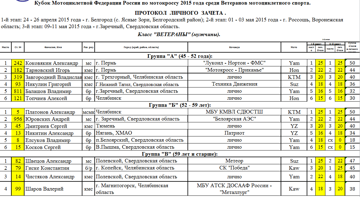 Протоколы результатов Кубка Мотоциклетной Федерации России среди ветеранов - г.Заречный (Свердловская область).