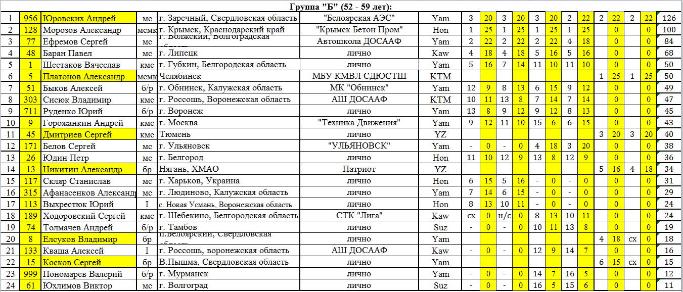 Победителем в группе "А" (45-52 года) стал вновь Александр Коковякин из Перми, на его счету максимальное количество побед (шесть) в заездах на протяжении трех этапов.