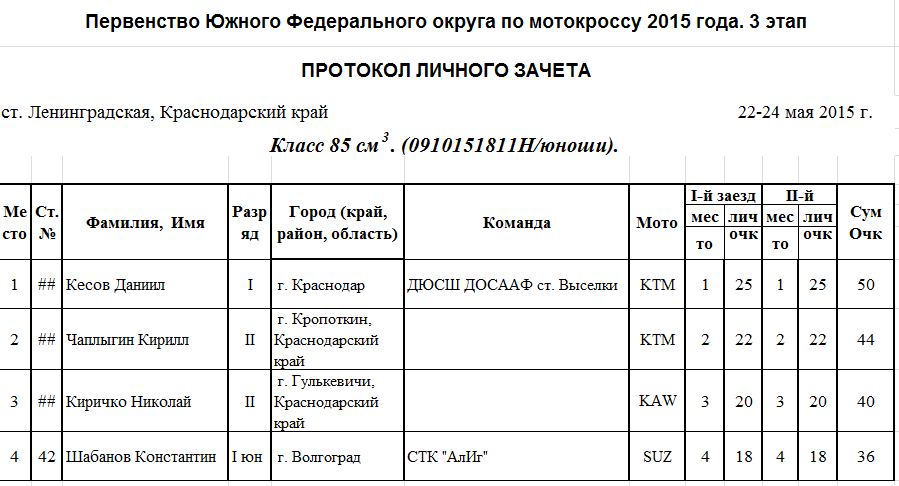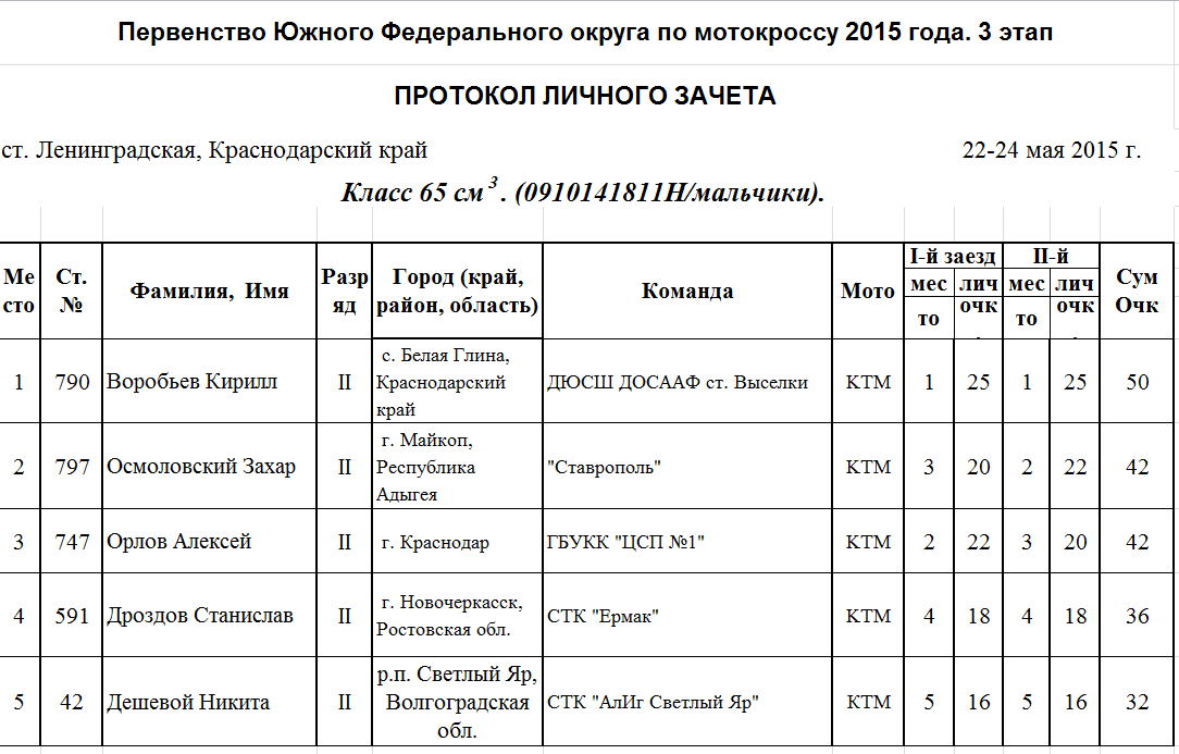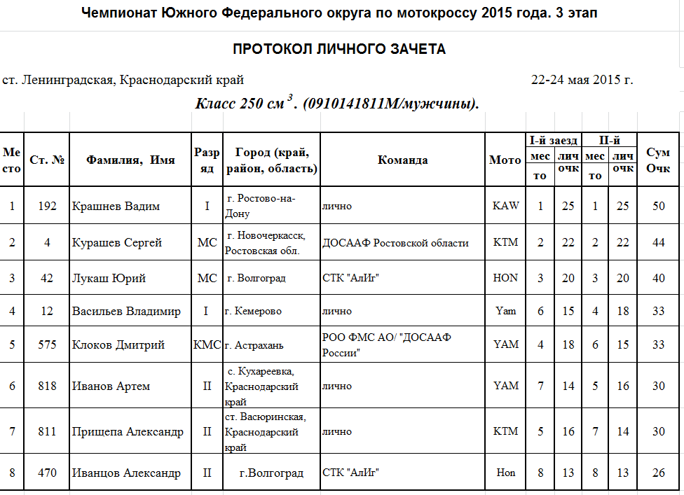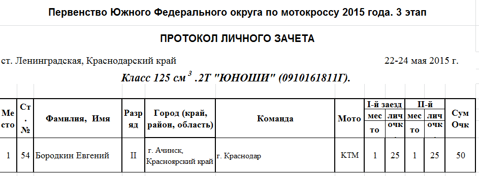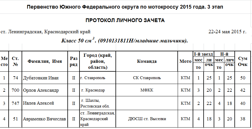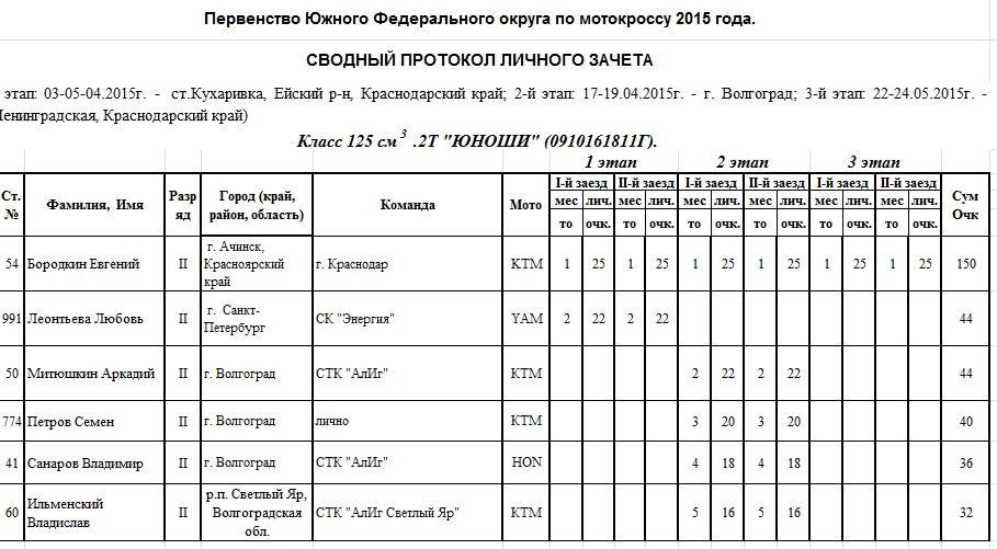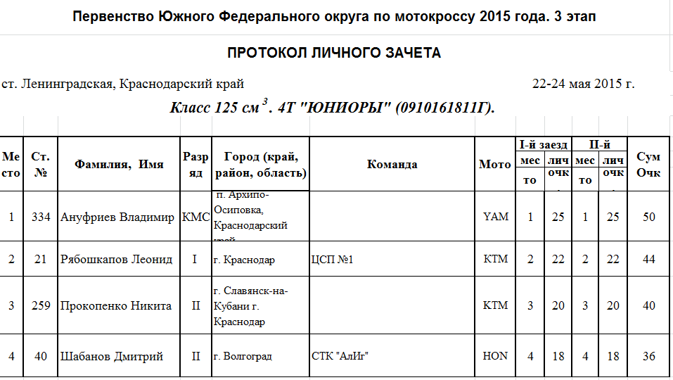 Чемпионат и Первенство ЮФО 2015 - Ленинградская 26.05.2015 Роман Мишенев (_) Протоколы результатов третьего этапа Чемпионата и Первенства Южного Федерального округа по мотокроссу 2015 года, состоявшегося 22-24 мая на трассе ст. Ленинградская (Краснодарский край). Комментарии Комментарии к этой статье запрещены.