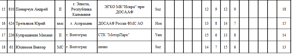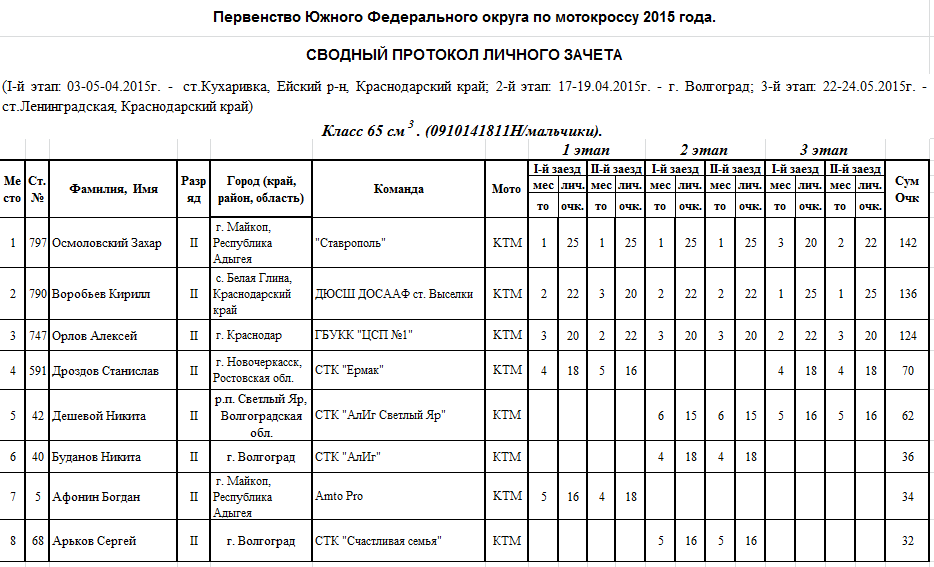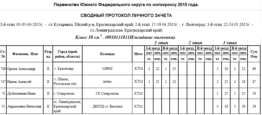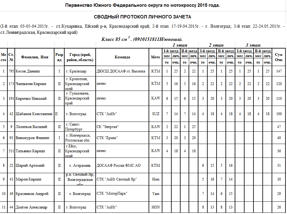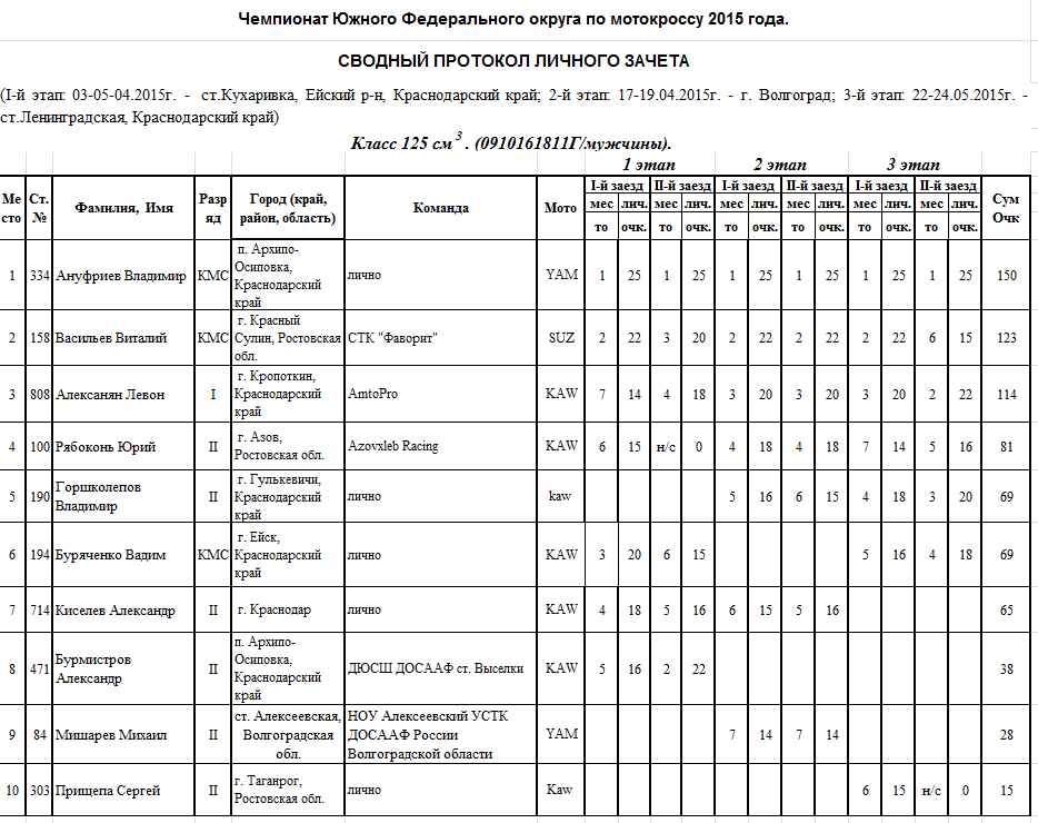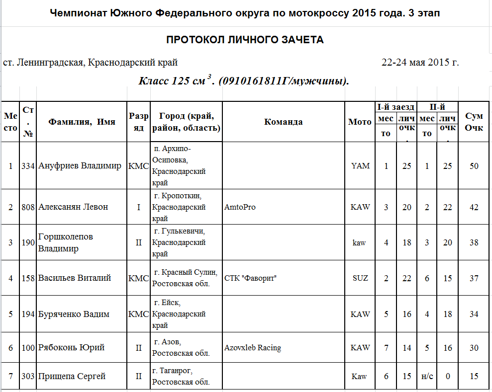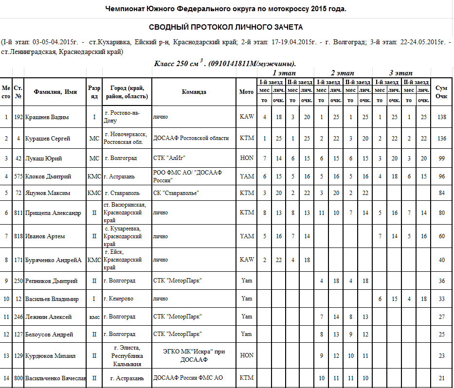 Чемпионат и Первенство ЮФО 2015 - Ленинградская 26.05.2015 Роман Мишенев (_) Протоколы результатов третьего этапа Чемпионата и Первенства Южного Федерального округа по мотокроссу 2015 года, состоявшегося 22-24 мая на трассе ст. Ленинградская (Краснодарский край). Комментарии Комментарии к этой статье запрещены.
