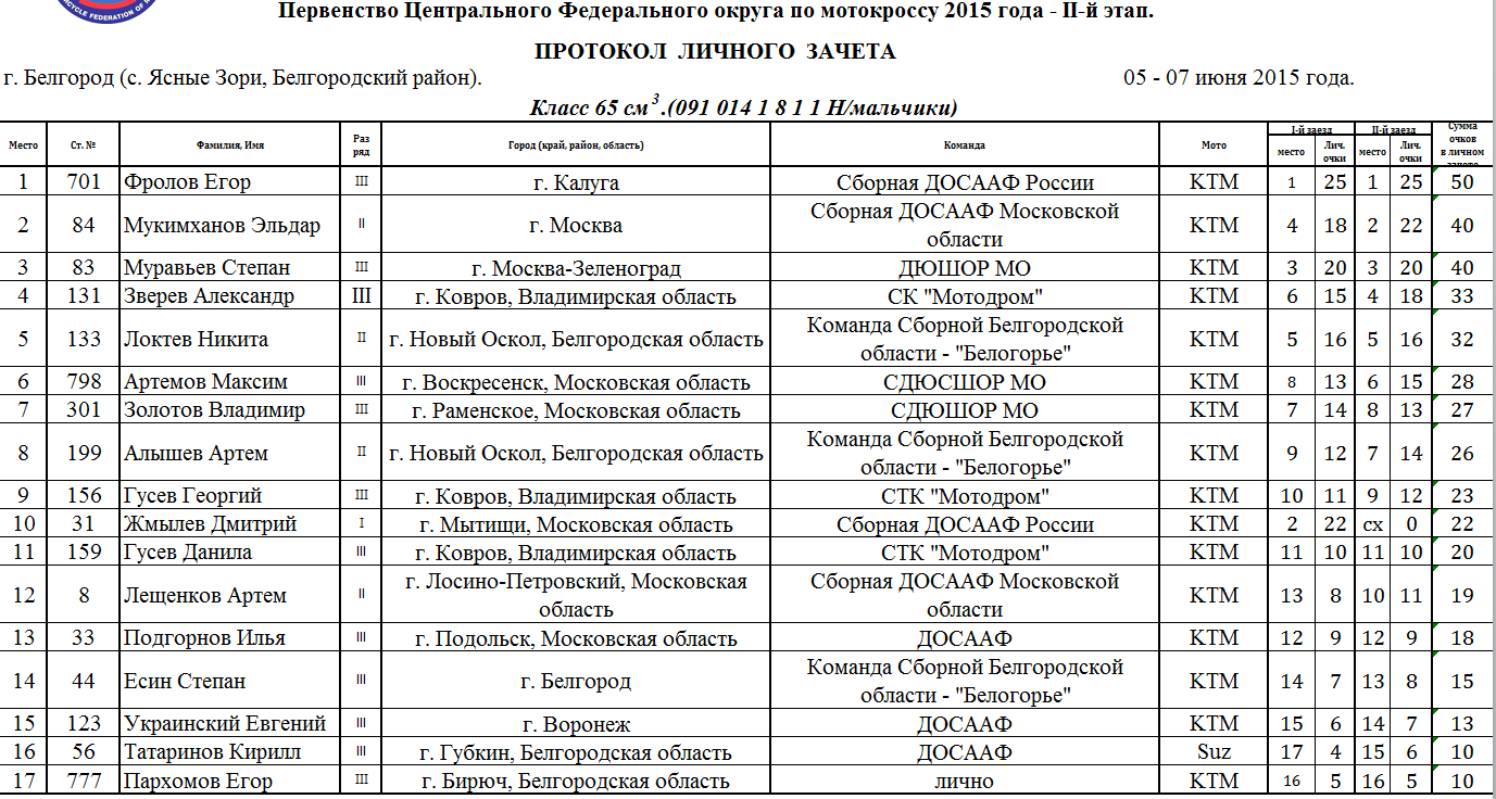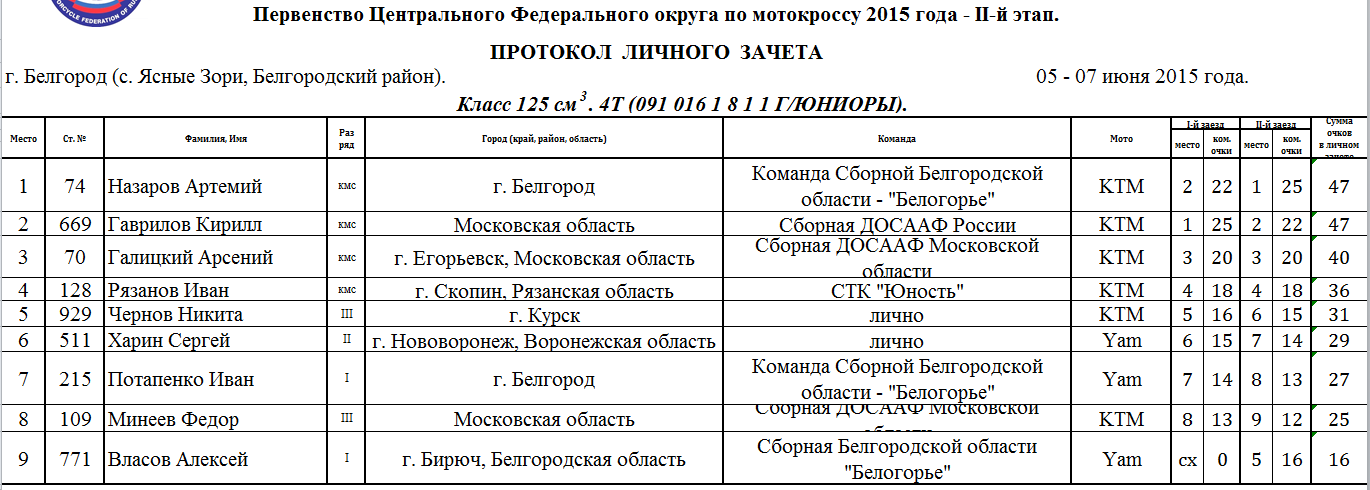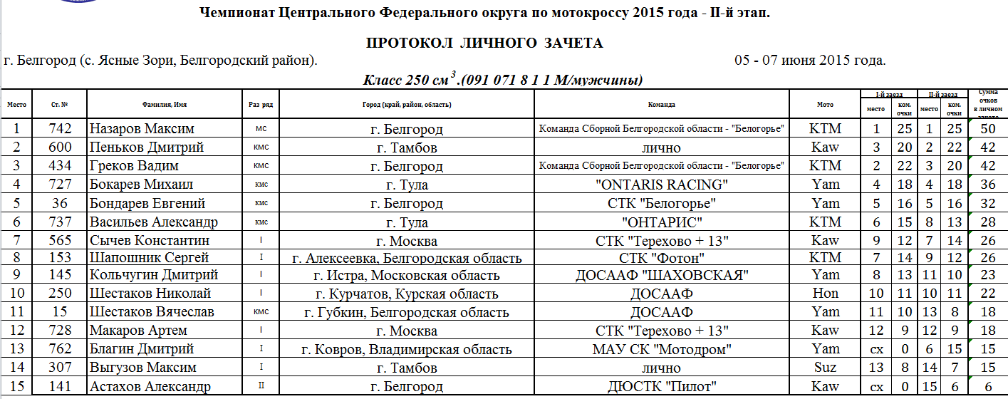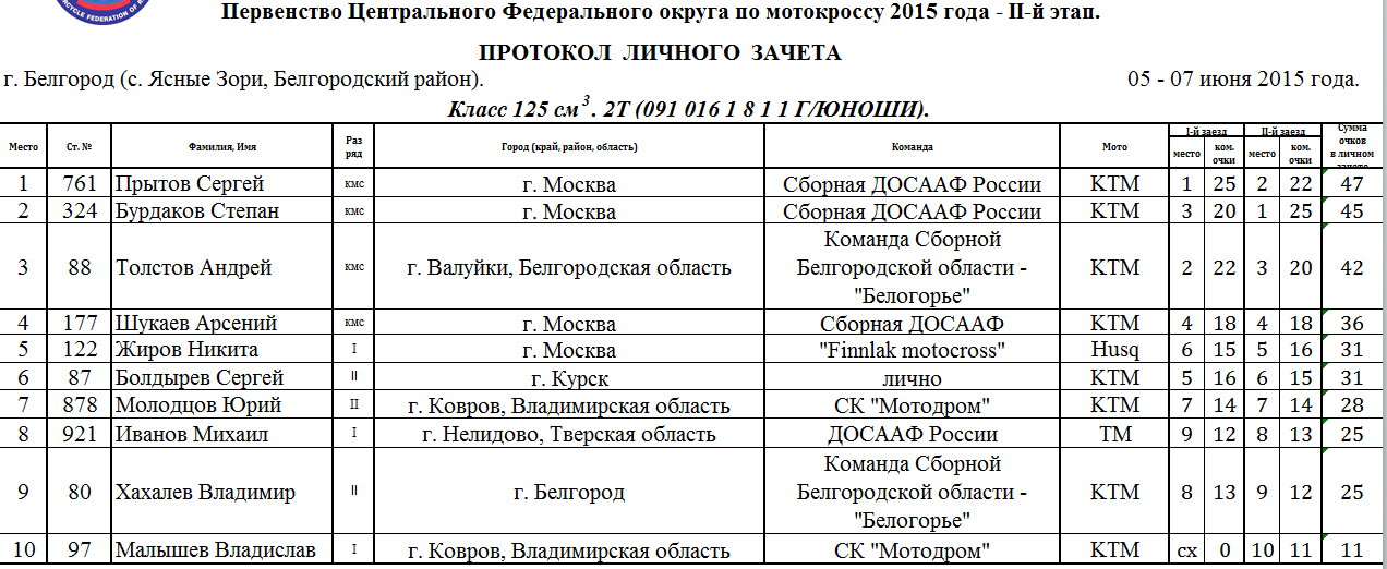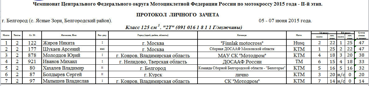 6-7 июня в с. Ясные Зори Белгородского района прошел второй этап Чемпионата и Первенства Центрального Федерального округа и Чемпионата и Первенства МФР по мотокроссу. Протоколы результатов соревнований.