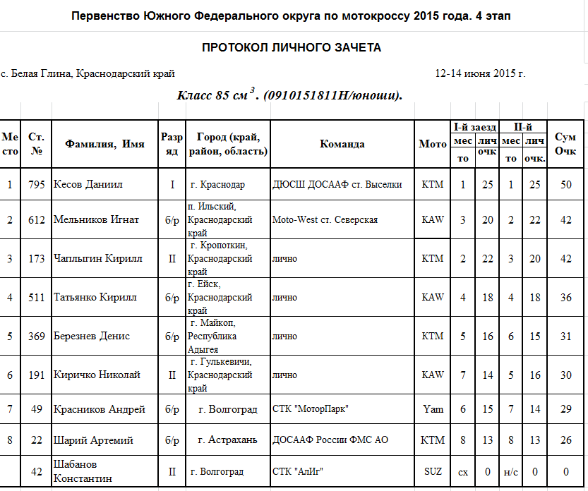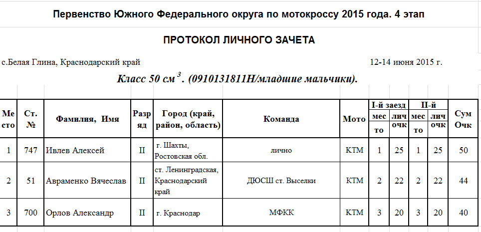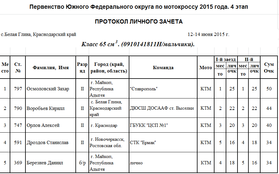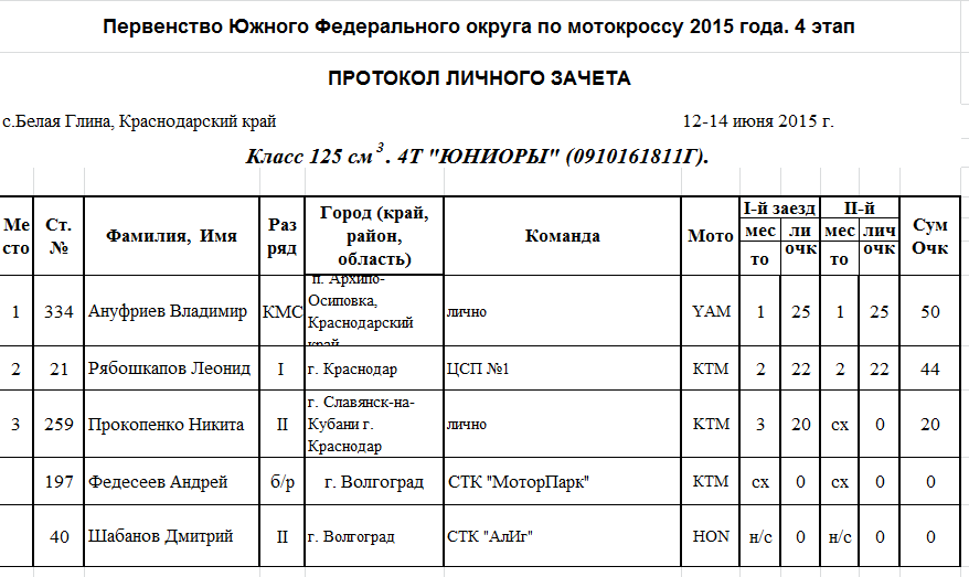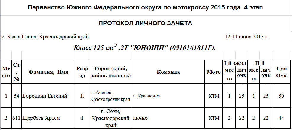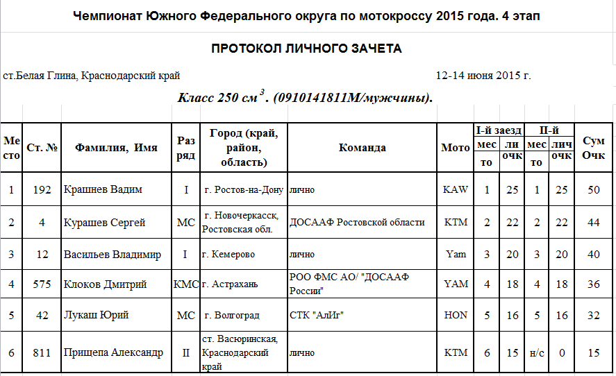 Протоколы результатов 4-го этапа Чемпионата и Первенства Южного Федерального округа 2015 года по мотокроссу, прошедшего 12-14 июня на трассе ст. Белая Глина (Краснодарский край).