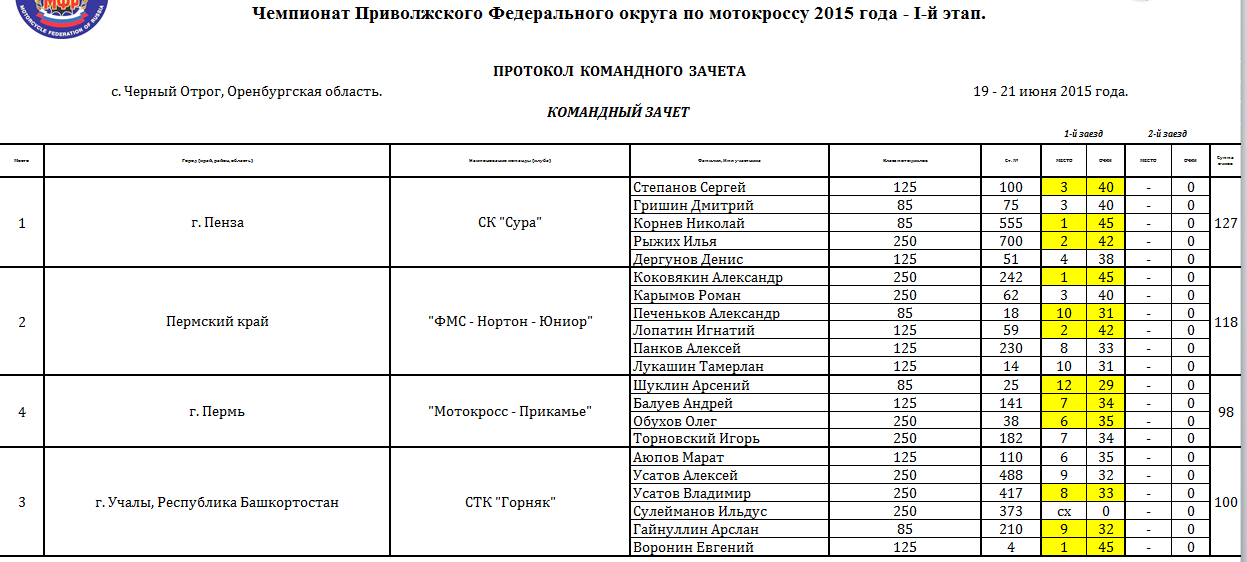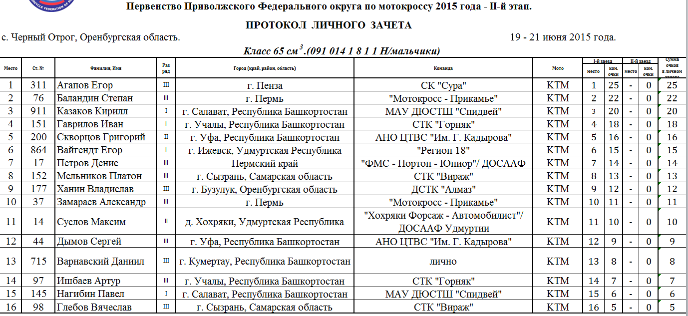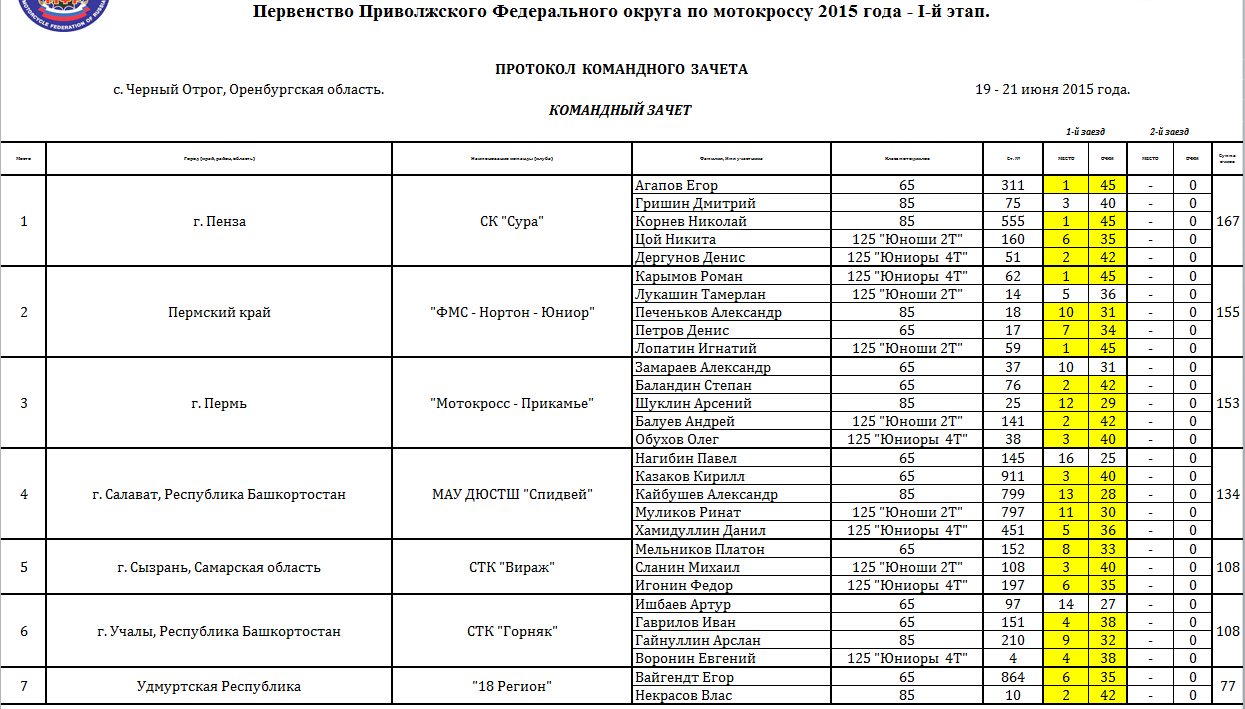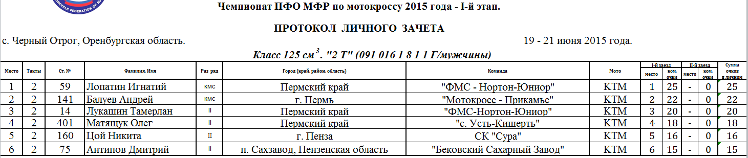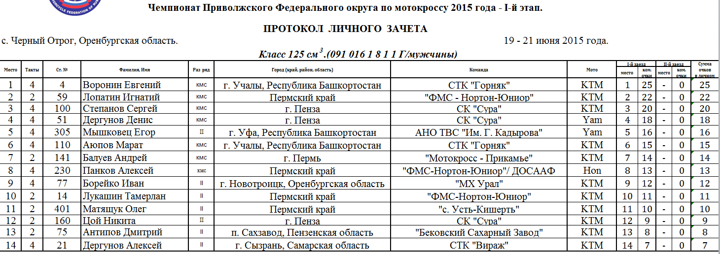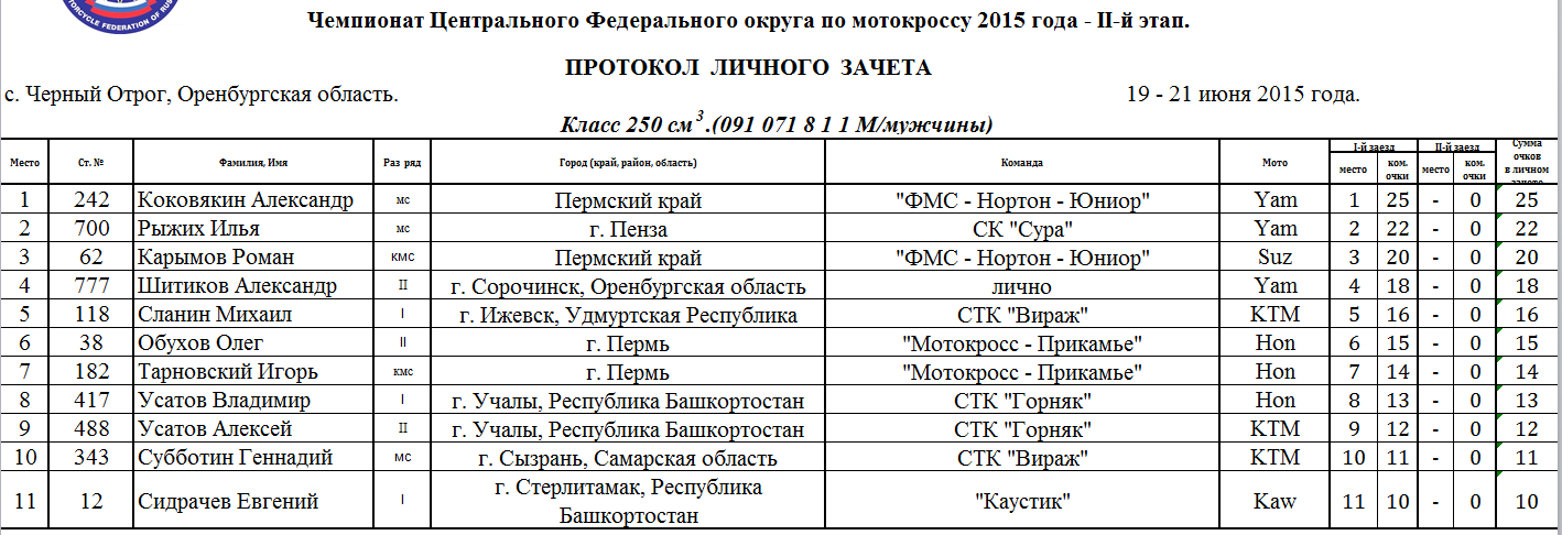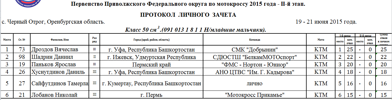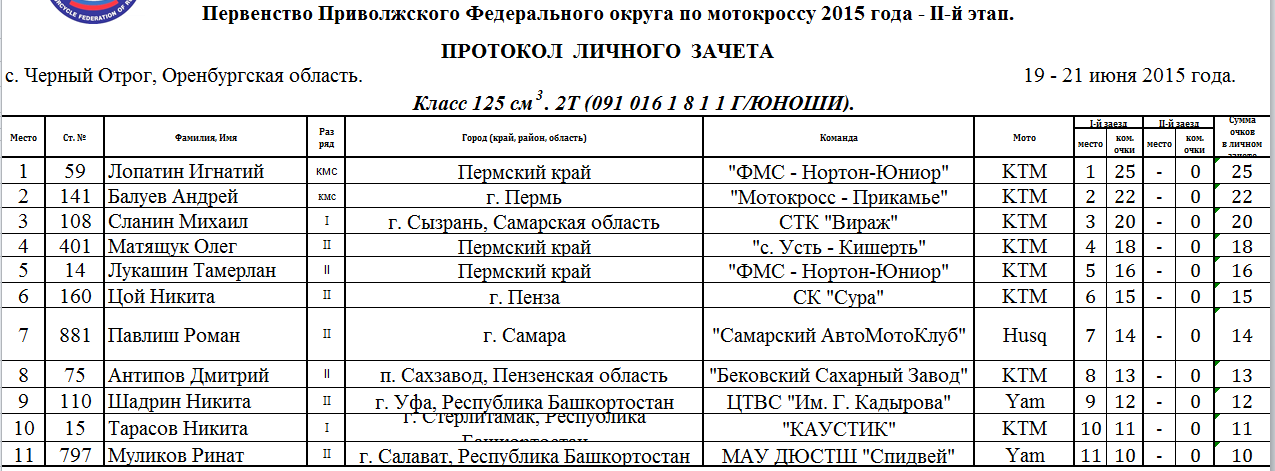 Протоколы результатов первого этапа Чемпионата и Первенства Приволжского Федерального округа 2015 года по мотокроссу, состоявшегося 19-21 июня 2015 года на трассе с. Черный Отрог (Оренбургская область).