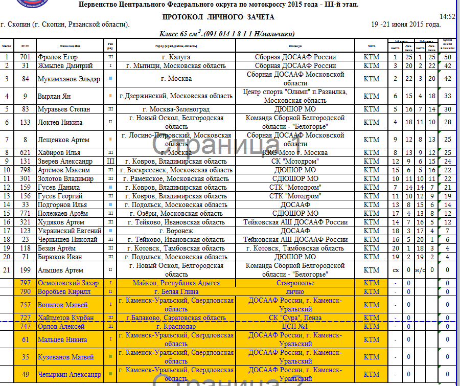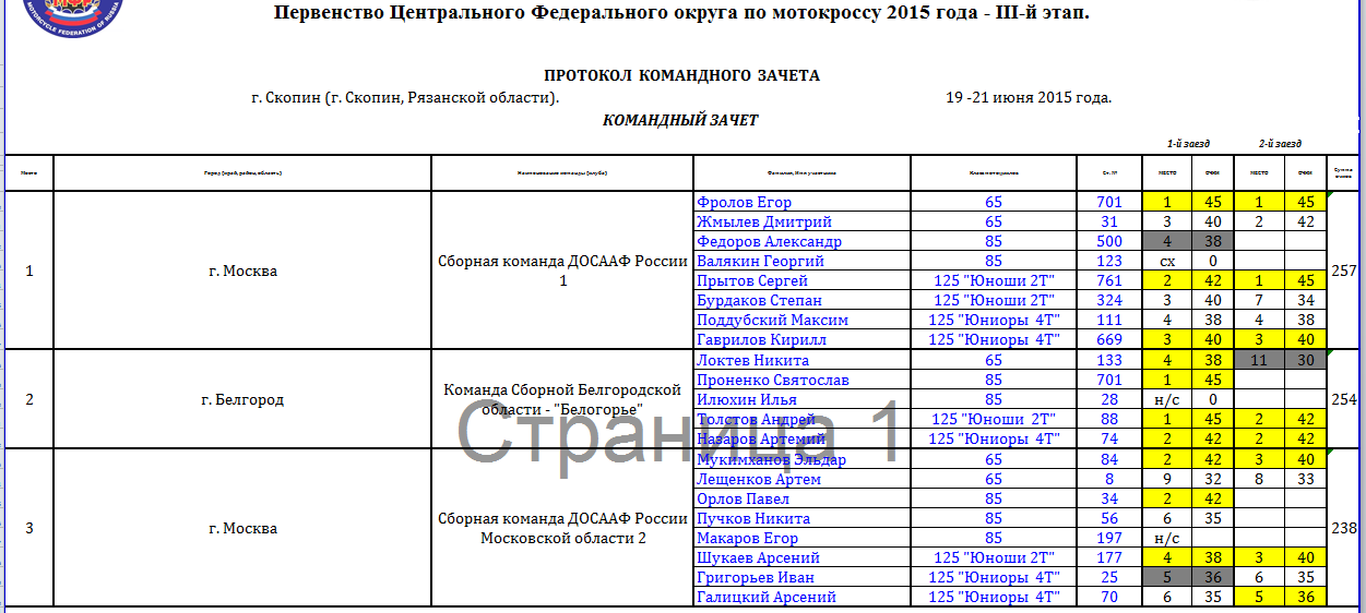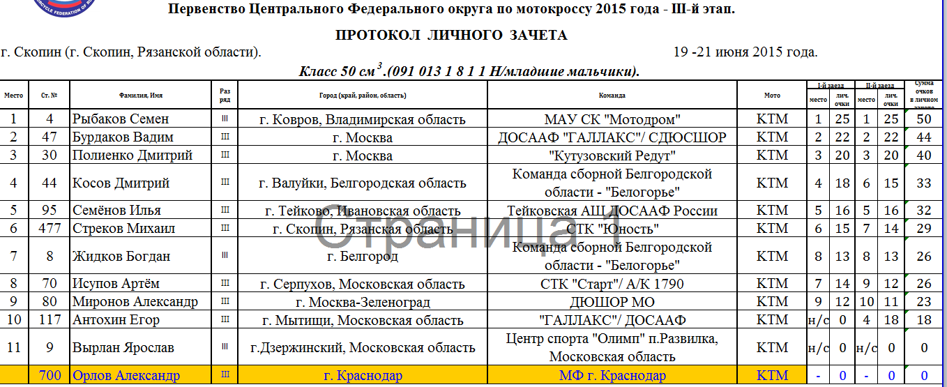 Протоколы результатов третьего этапа Чемпионата и Первенства Центрального Федерального округа 2015 года по мотокроссу, состоявшегося 19-21 июня на трассе г.Скопин (Рязанская область).