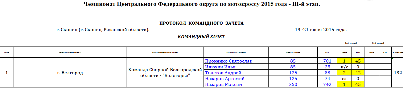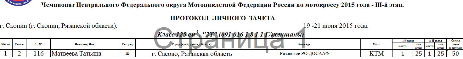 Протоколы результатов третьего этапа Чемпионата и Первенства Центрального Федерального округа 2015 года по мотокроссу, состоявшегося 19-21 июня на трассе г.Скопин (Рязанская область).