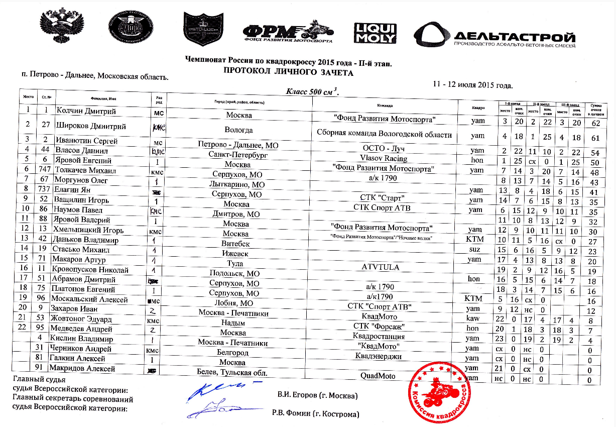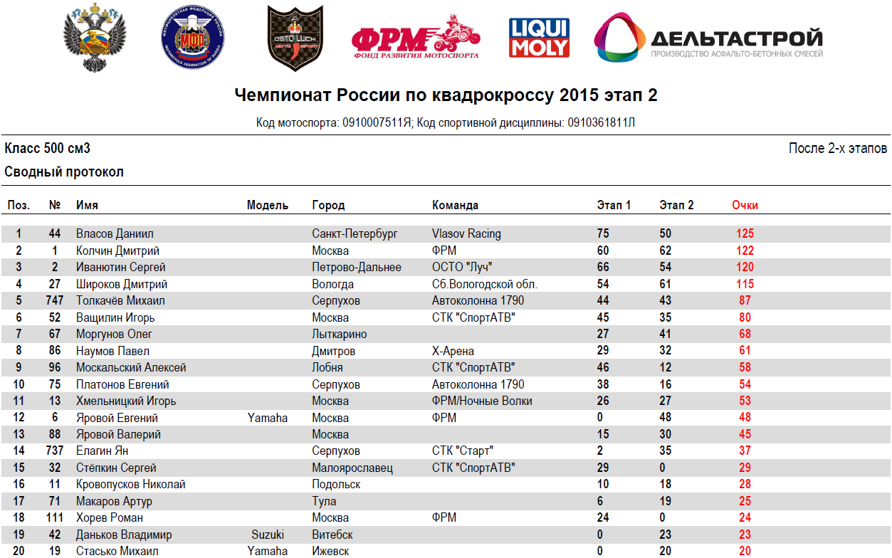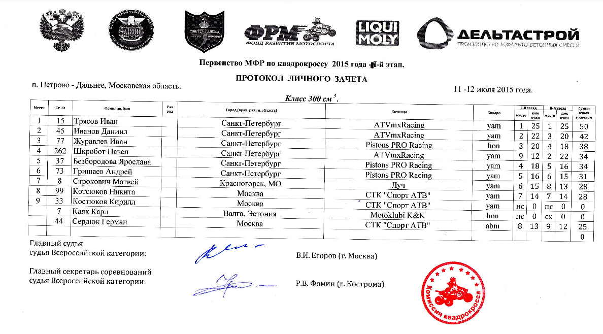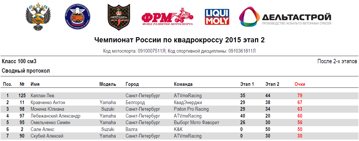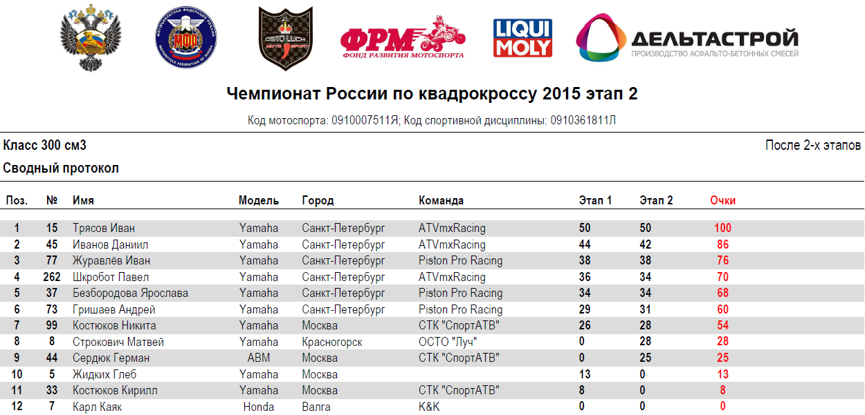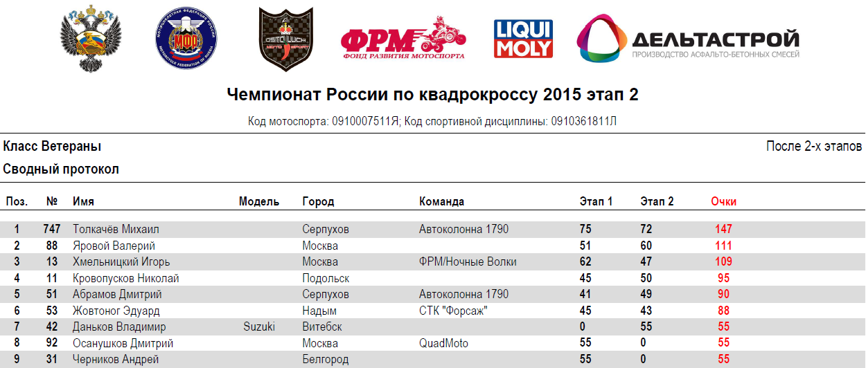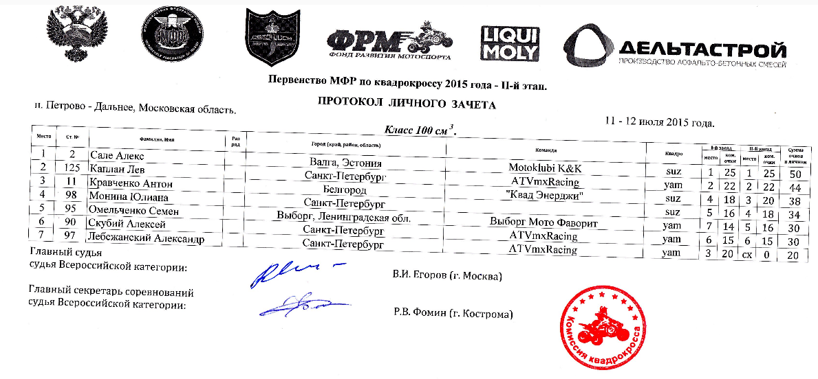 Квадрокросс 2015 - Петрово-Дальнее 14.07.2015 Роман Мишенев (_) Протоколы результатов второго этапа Чемпионата России и Первенства МФР 2015 года по квадрокроссу, состоявшегося 11-12 июля 2015 года на трассе п.Петрово-Дальнее (Московская область). Результаты второго этапа: Сводные протоколы (после 2-х этапов): Комментарии Комментарии к этой статье запрещены.
