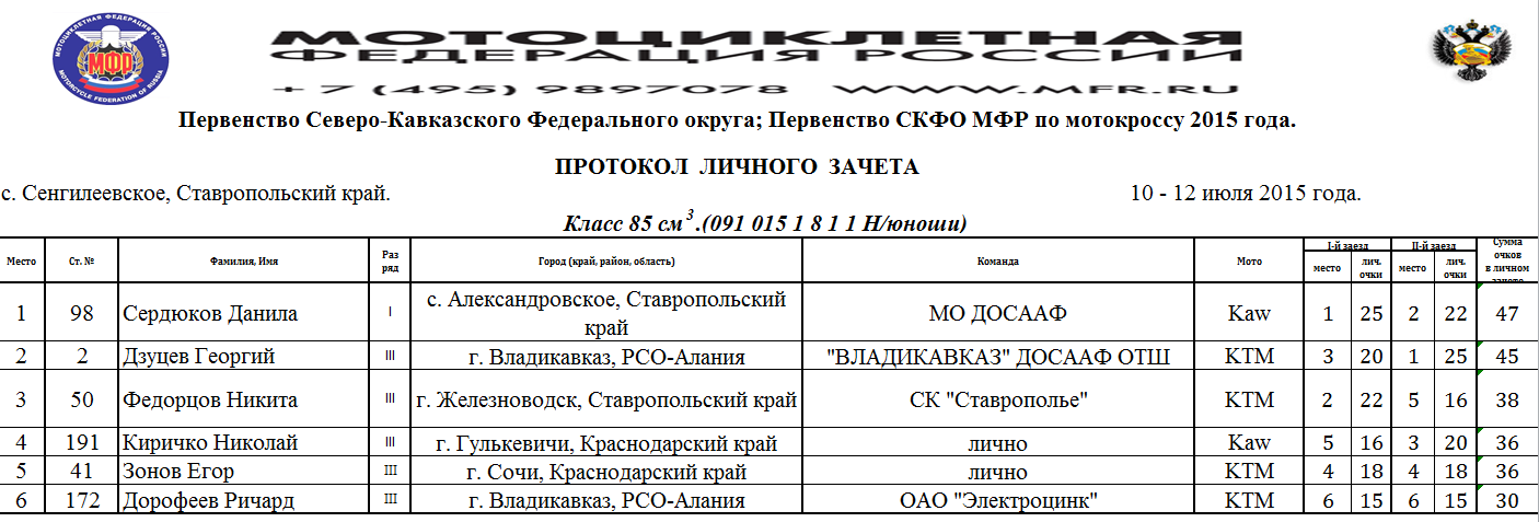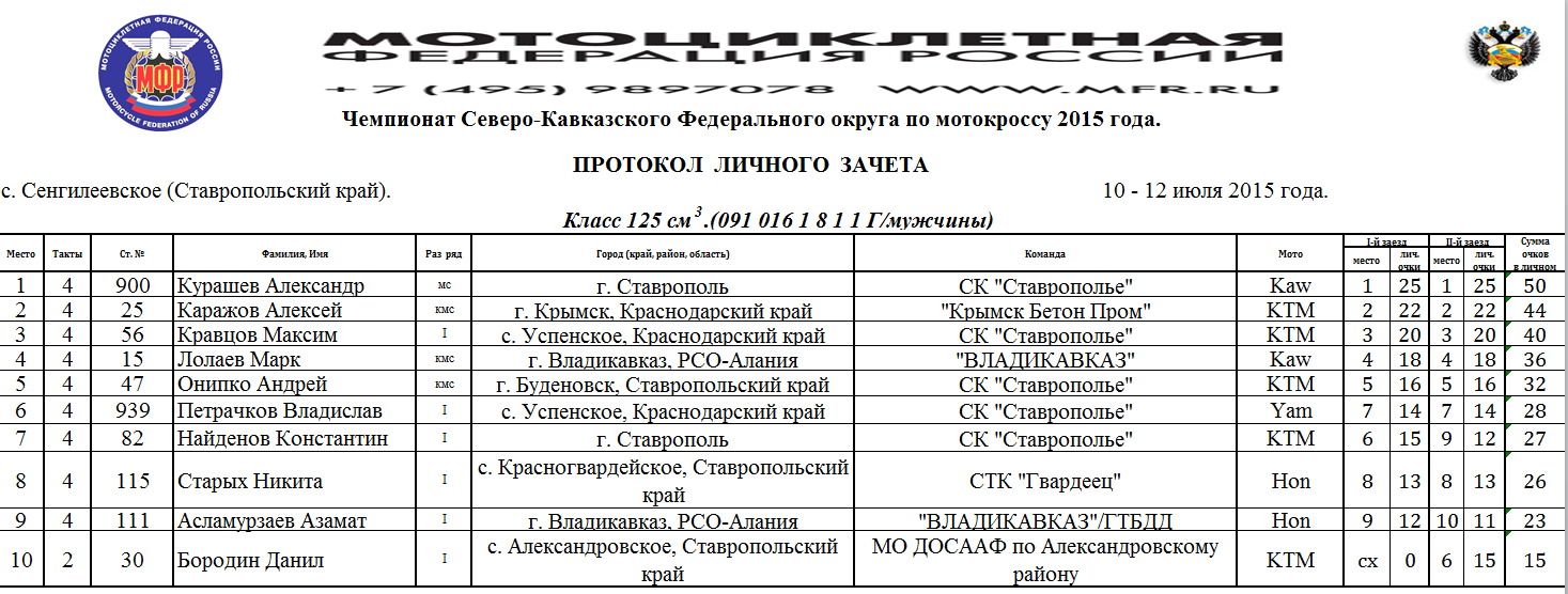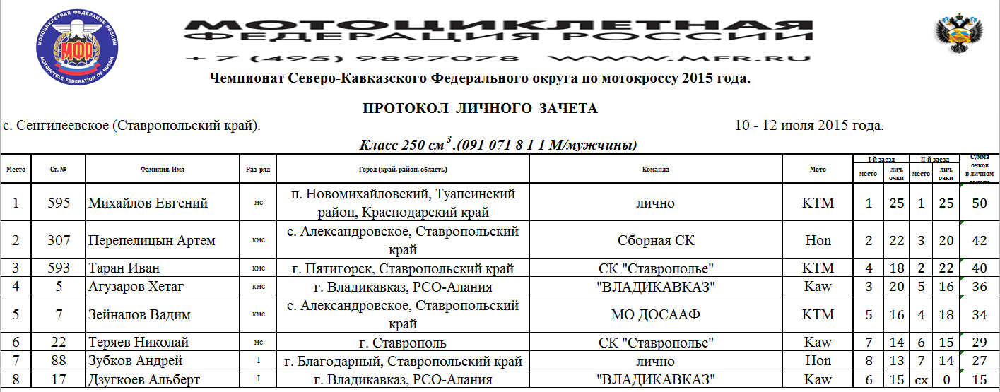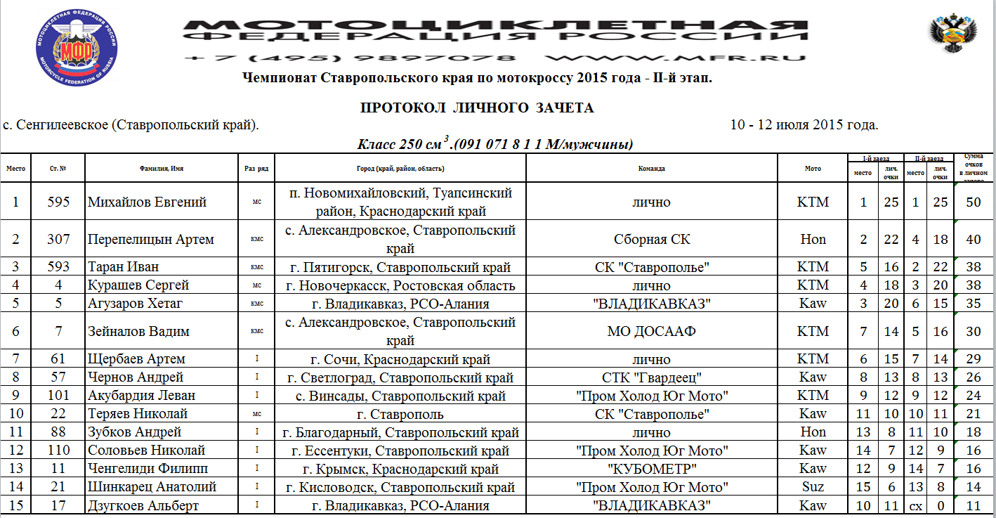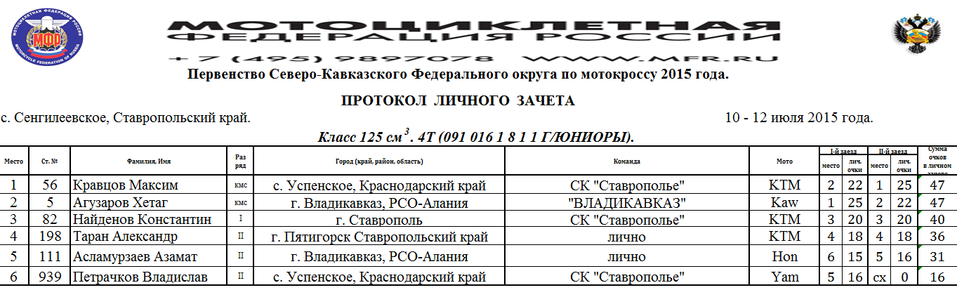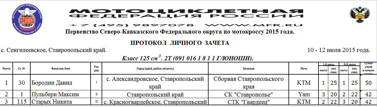 Протоколы результатов Чемпионата и Первенства Северо-Кавказского Федерального округа, Чемпионата и Первенства Ставропольского края 2015 года по мотокроссу, состоявшихся 10-12 июля 2015 года на трассе с.Сенгилеевское (Ставропольский край)