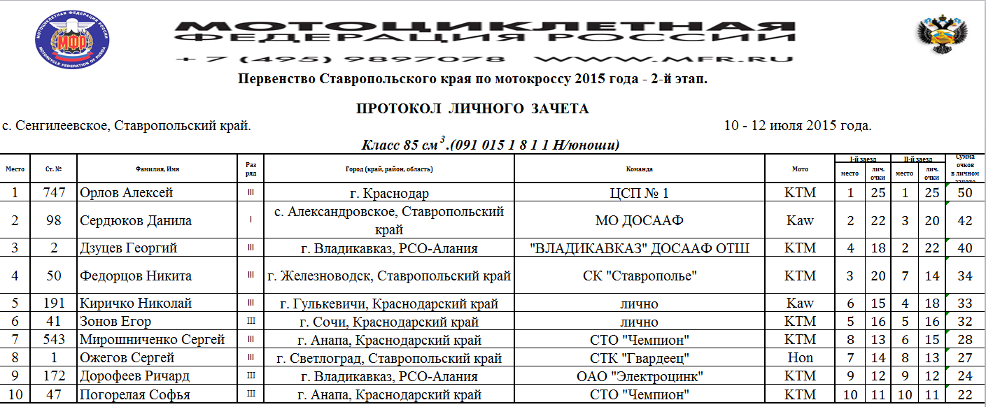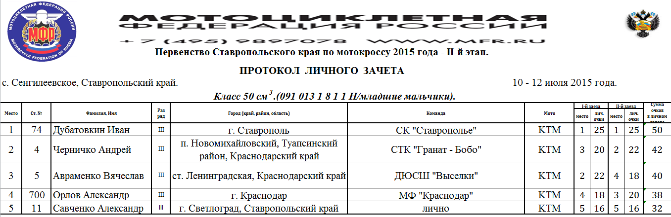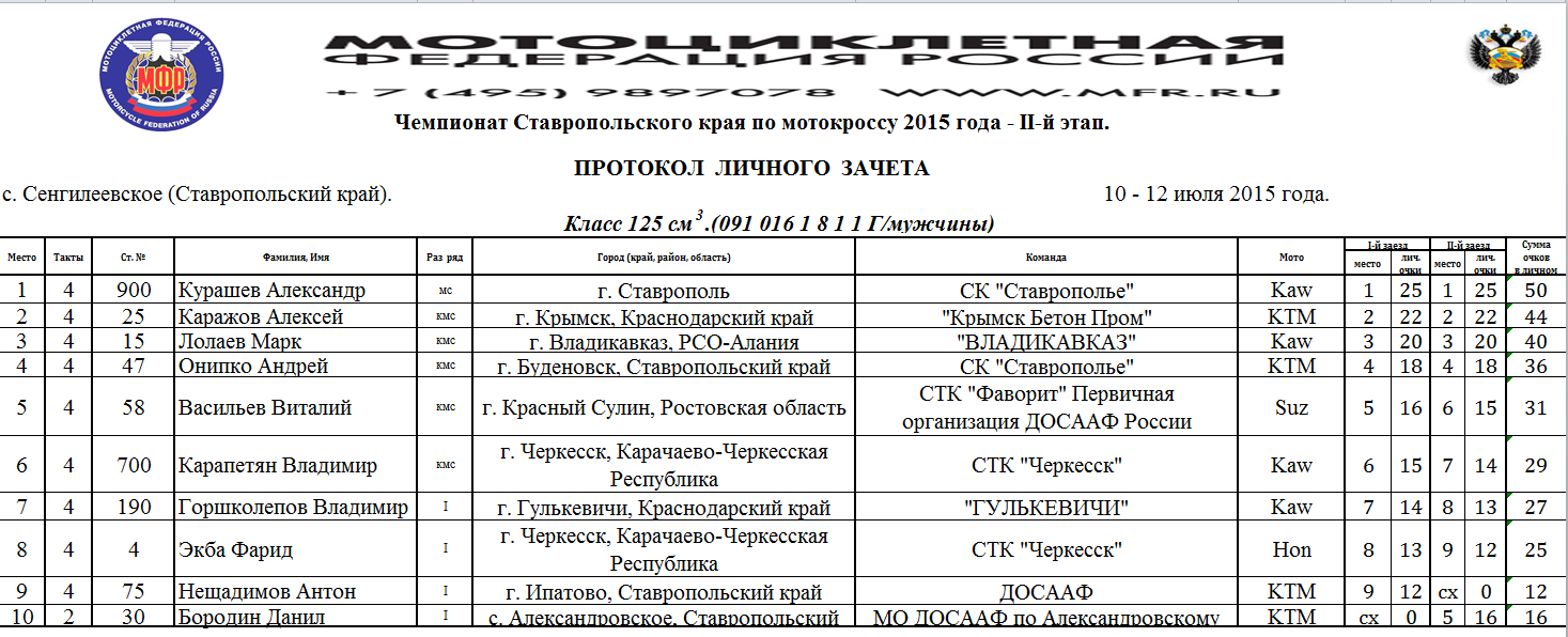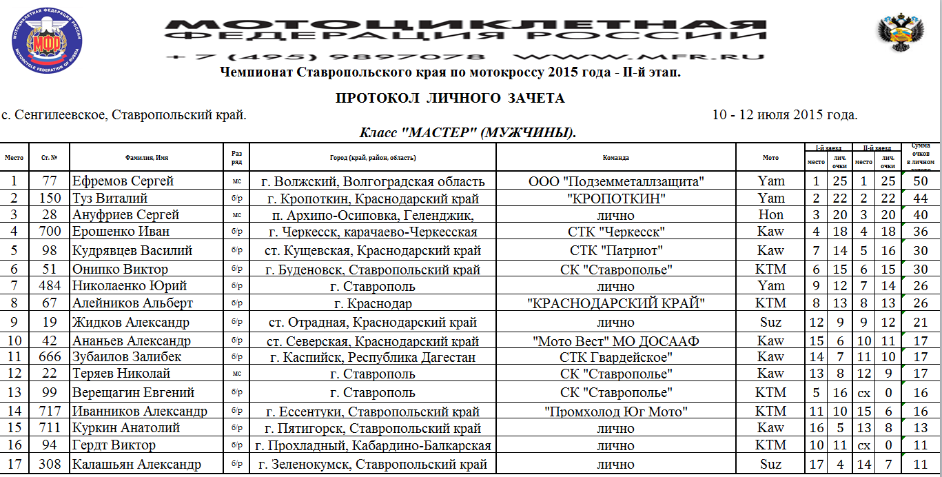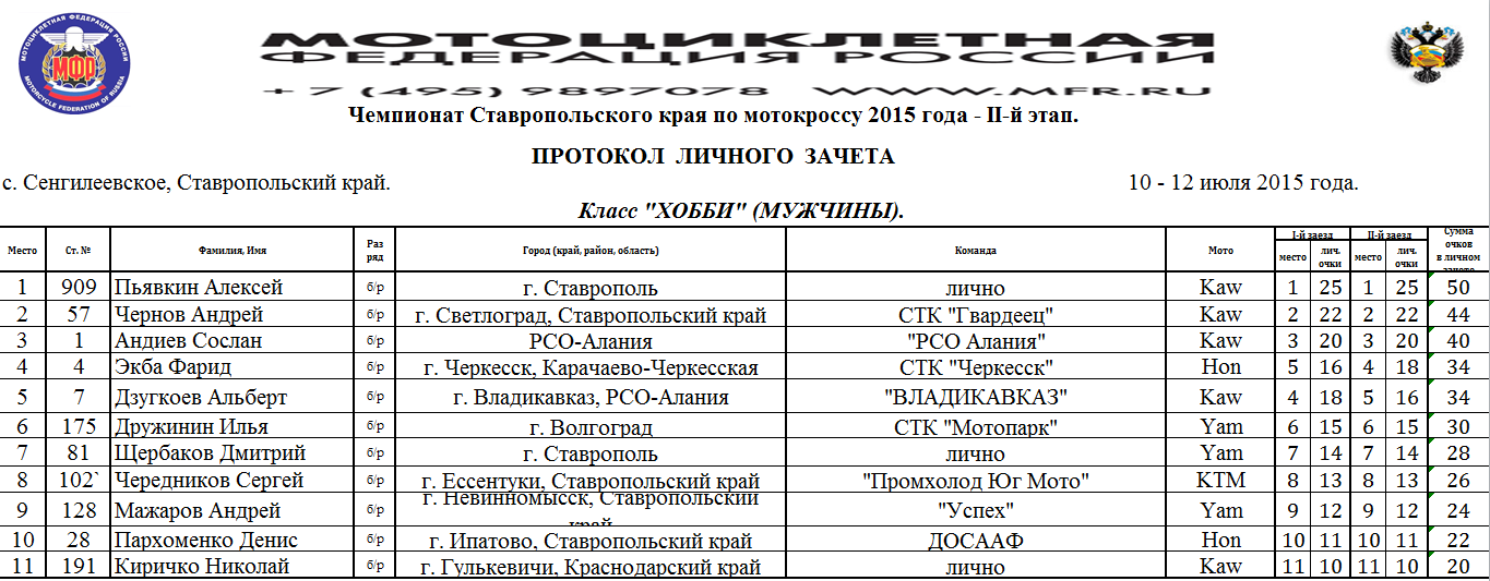 Протоколы результатов Чемпионата и Первенства Северо-Кавказского Федерального округа, Чемпионата и Первенства Ставропольского края 2015 года по мотокроссу, состоявшихся 10-12 июля 2015 года на трассе с.Сенгилеевское (Ставропольский край)