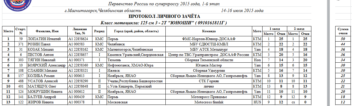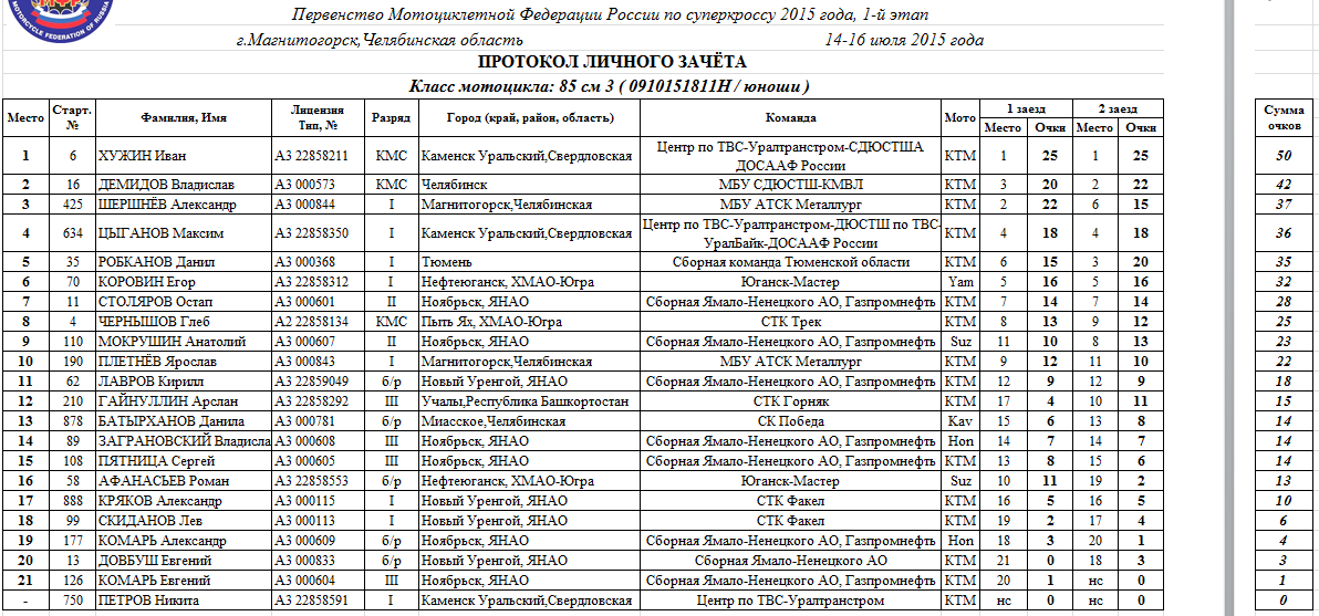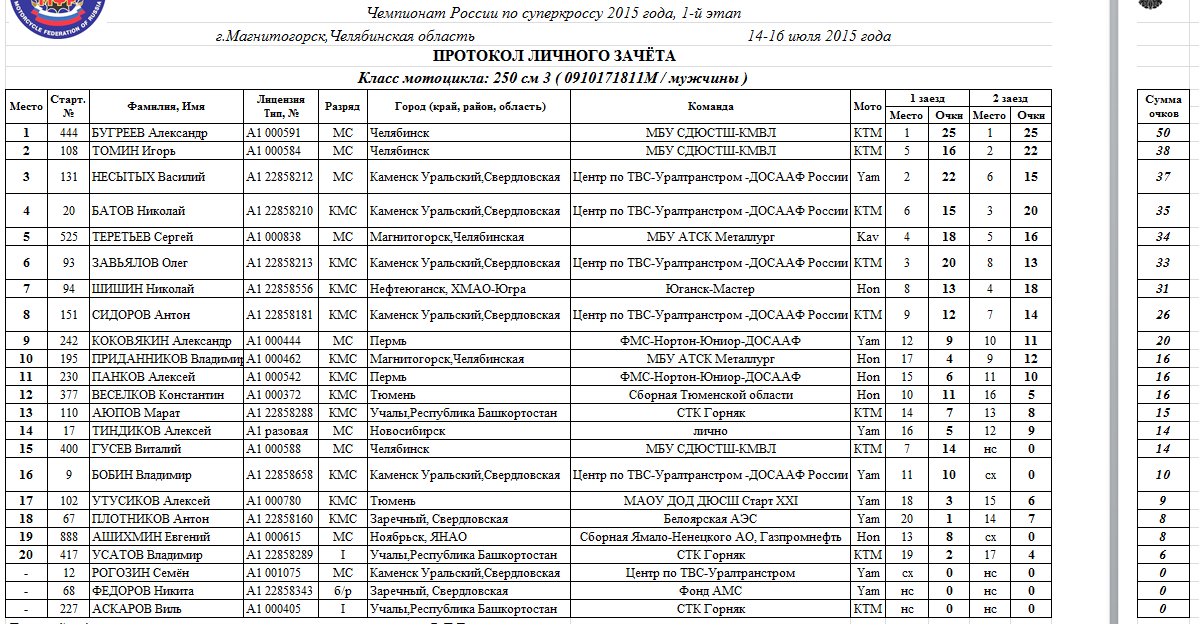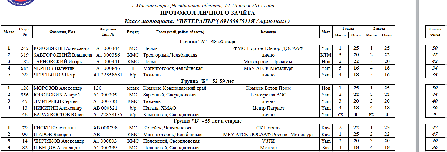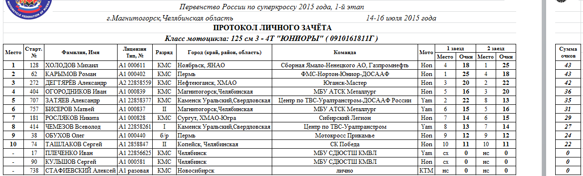 Протоколы результатов 1-го этапа Чемпионата и Первенства России 2015 года по суперкроссу и 4-го этапа Кубка Мотоциклетной Федерации России 2015 года по мотокроссу среди ветеранов мотоциклетного спорта, состоявшихся 14-16 июля 2015 года в г.Магнитогорск (Челябинская область).