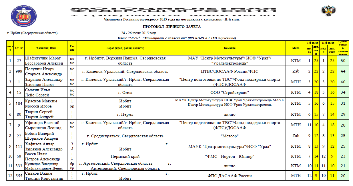 Протокол результатов 2-го этапа Чемпионата России 2015 года по мотокроссу на мотоциклах с колясками, состоявшегося 24-26 июля в г. Ирбит (Свердловская область) + сводный протокол по сумме двух этапов.