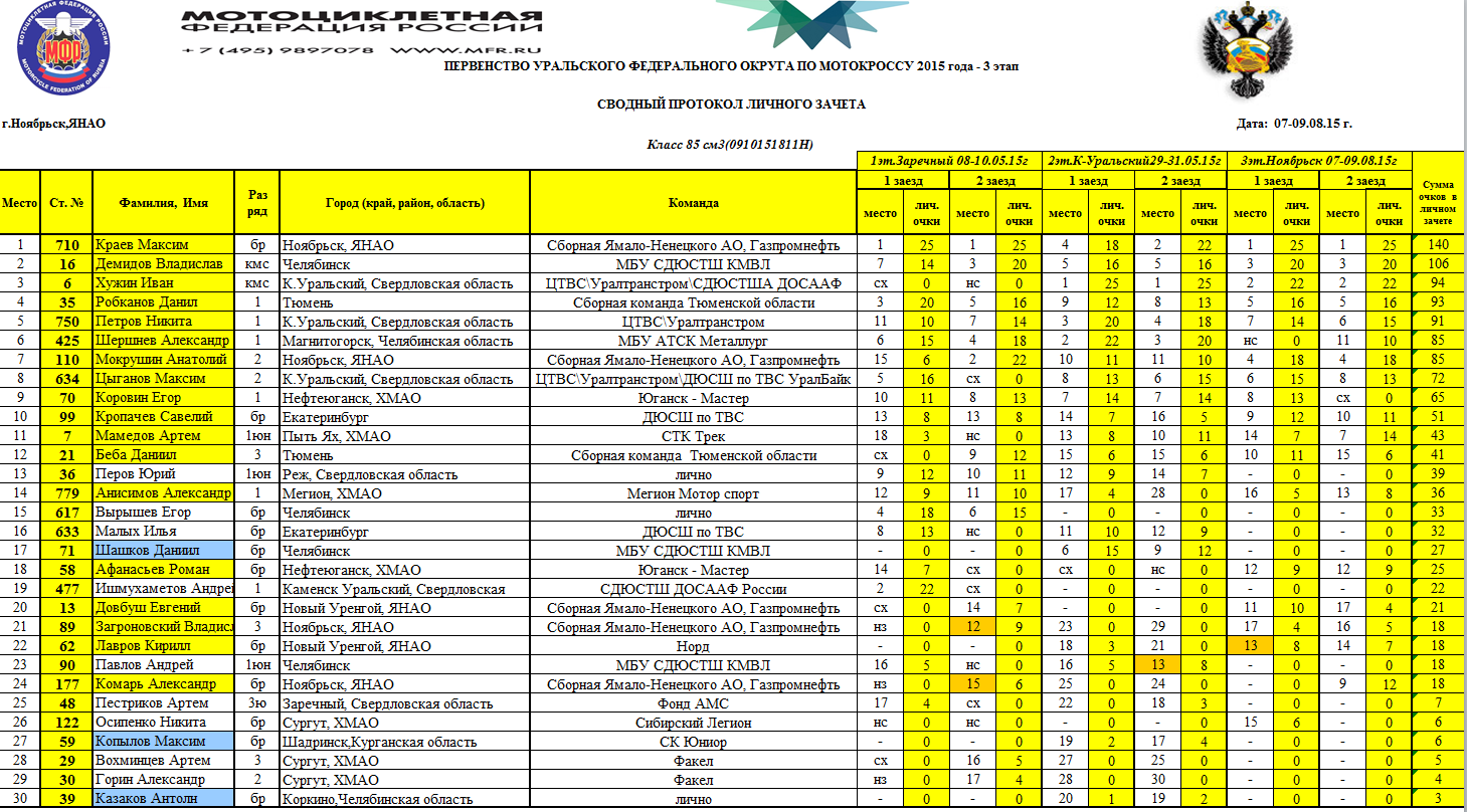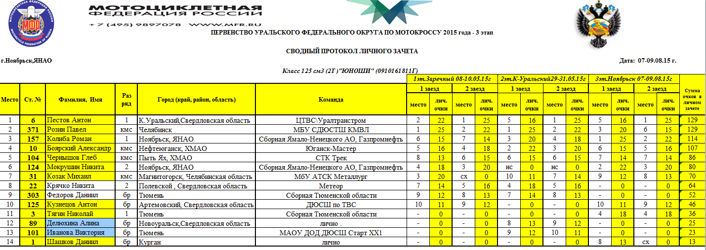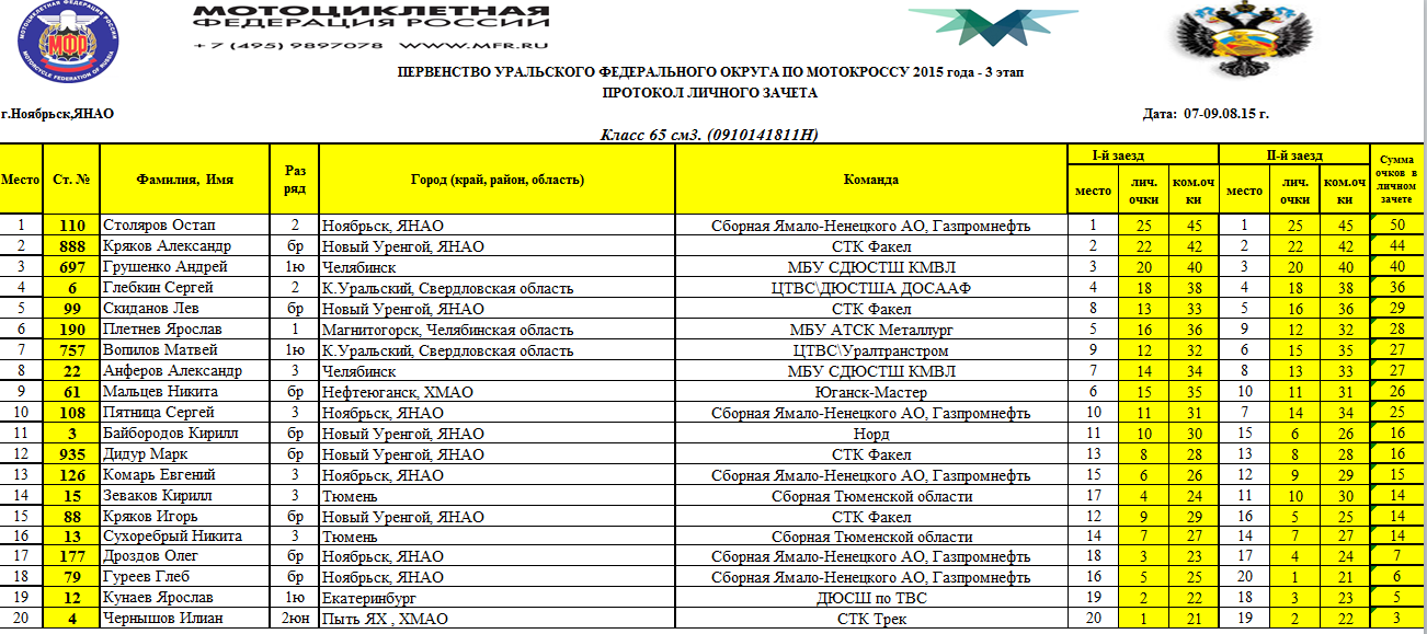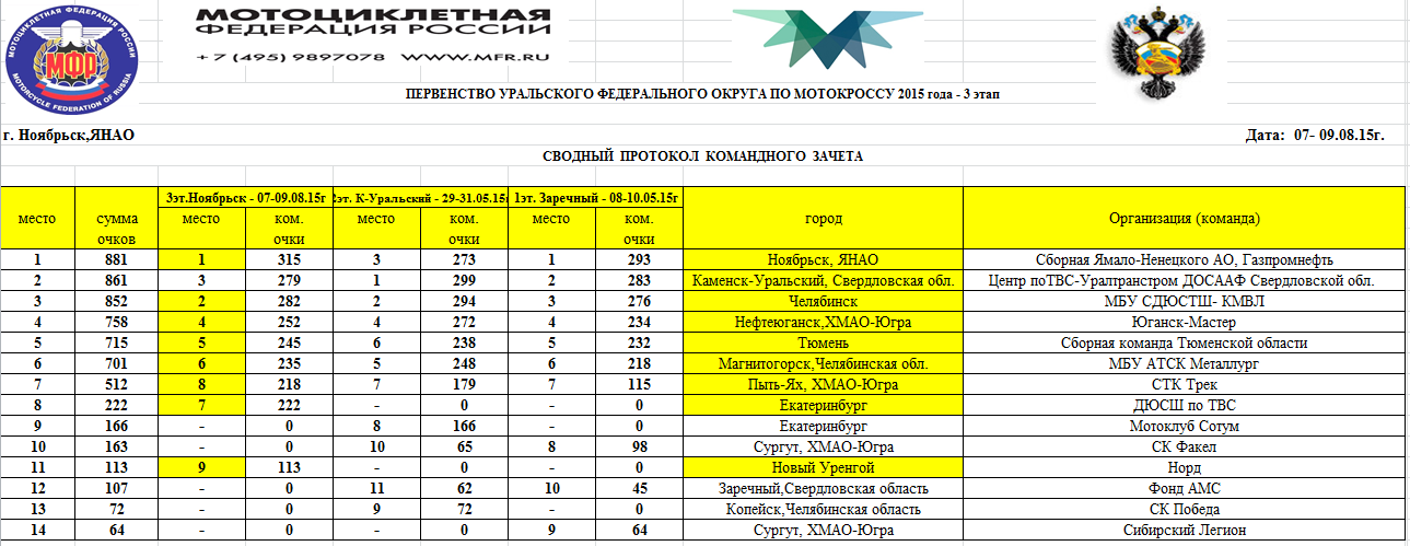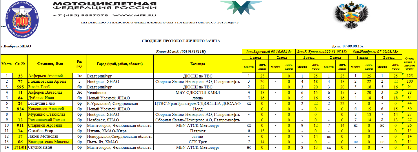 Первенство УФО 2015 - Ноябрьск 11.08.2015 Роман Мишенев (_) Протоколы результатов третьего (заключительного) этапа и сводные протоколы Первенства Уральского Федерального округа, состоявшегося 8-9 августа 2015 года в г.Ноябрьск (Ямало-Ненецкий АО). Комментарии Комментарии к этой статье запрещены.