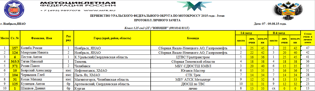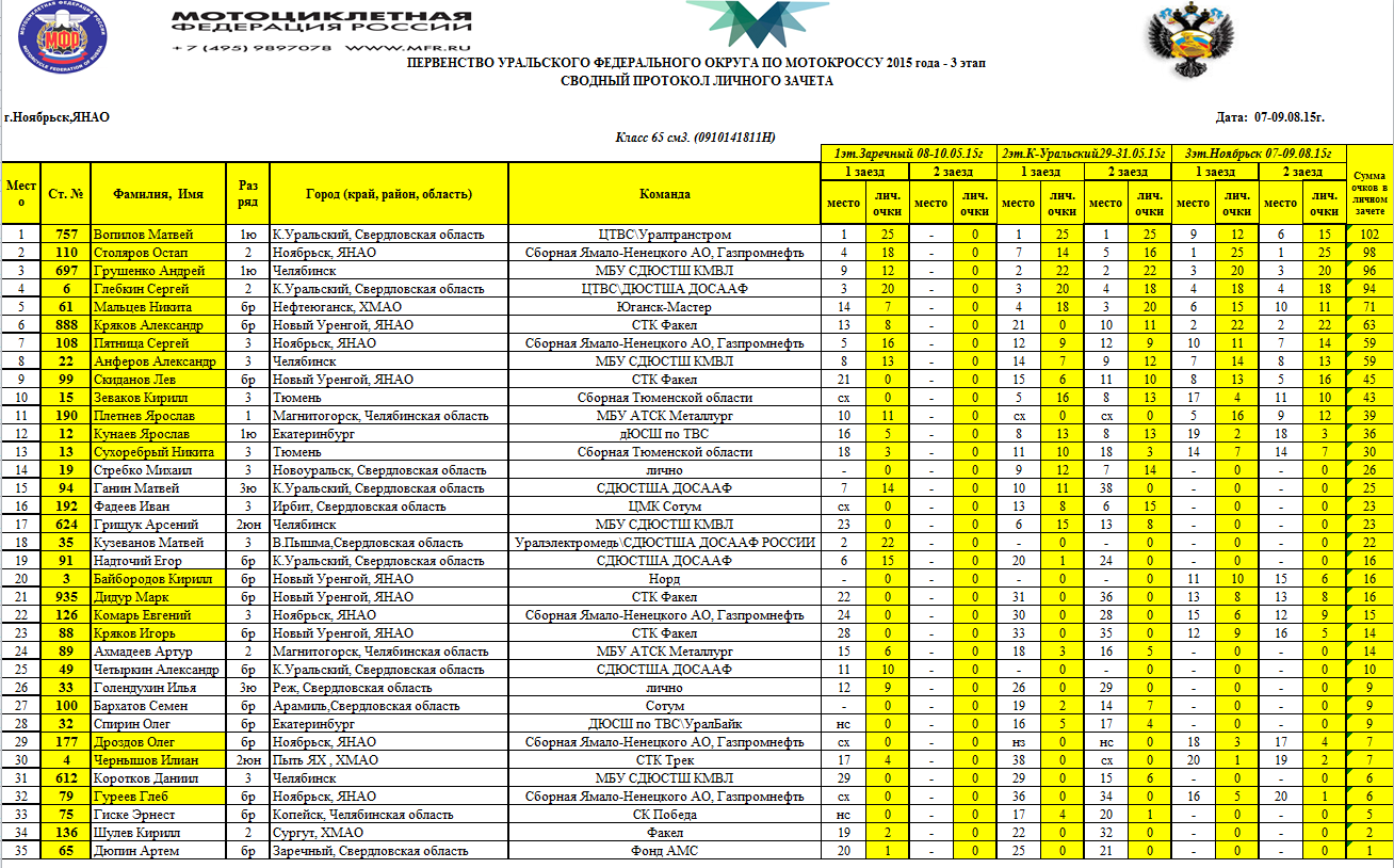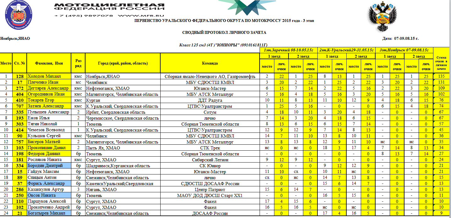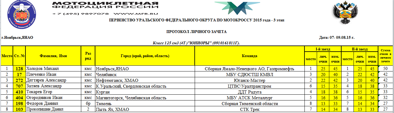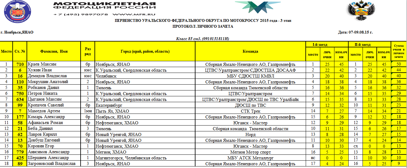 Первенство УФО 2015 - Ноябрьск 11.08.2015 Роман Мишенев (_) Протоколы результатов третьего (заключительного) этапа и сводные протоколы Первенства Уральского Федерального округа, состоявшегося 8-9 августа 2015 года в г.Ноябрьск (Ямало-Ненецкий АО). Комментарии Комментарии к этой статье запрещены.